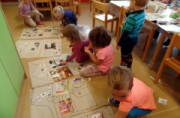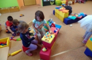 Děti si spontánně rozehrály hru Na cukrárnu. Využily k tomu molitanové tvary, vytvořily si tácy z destiček na uložení "dortíků", do cukrárny chodily společně i s malými miminky-panenkami.