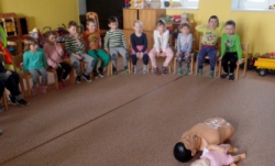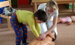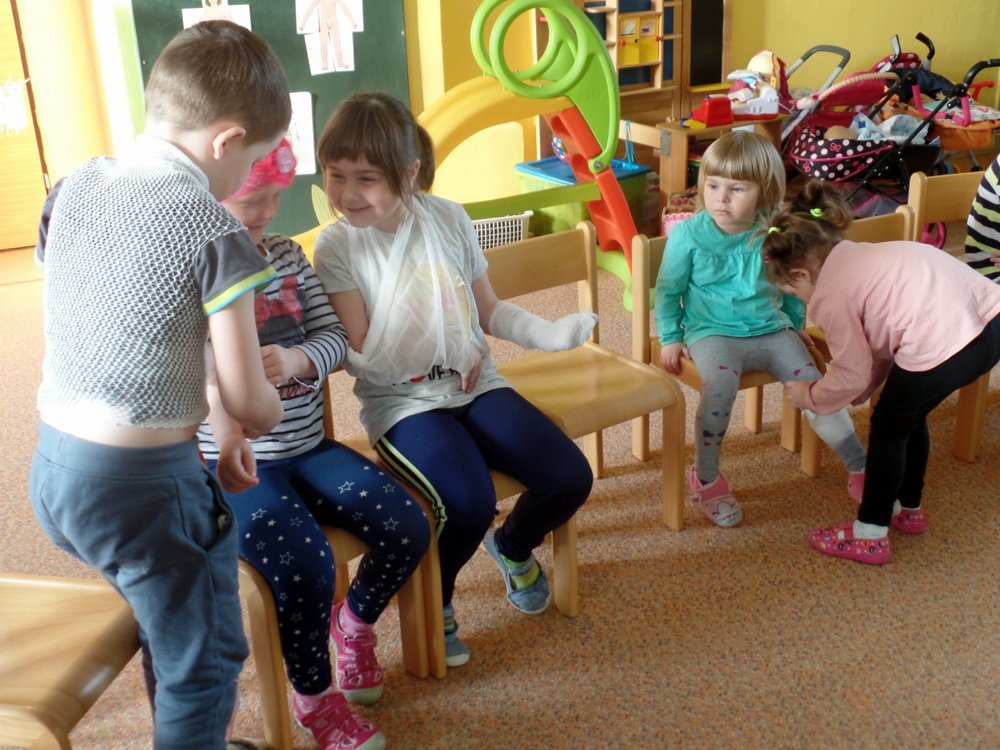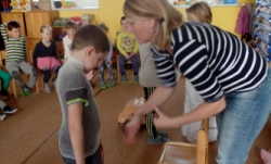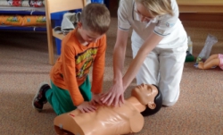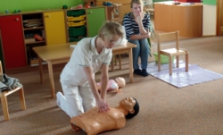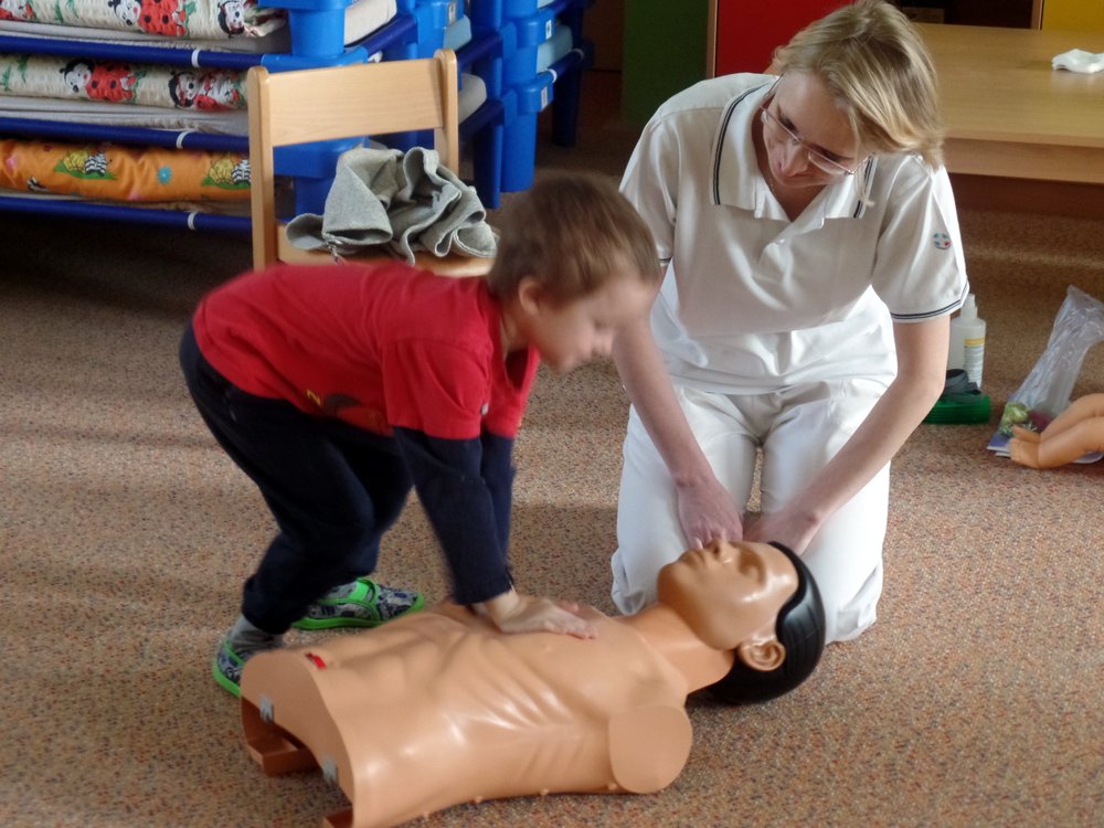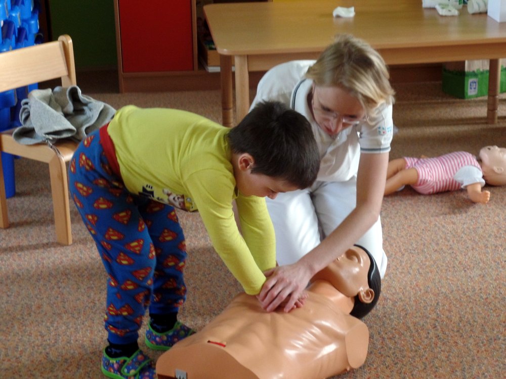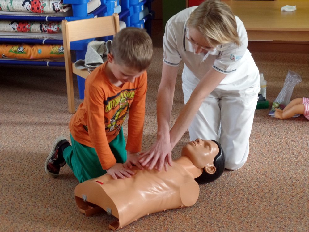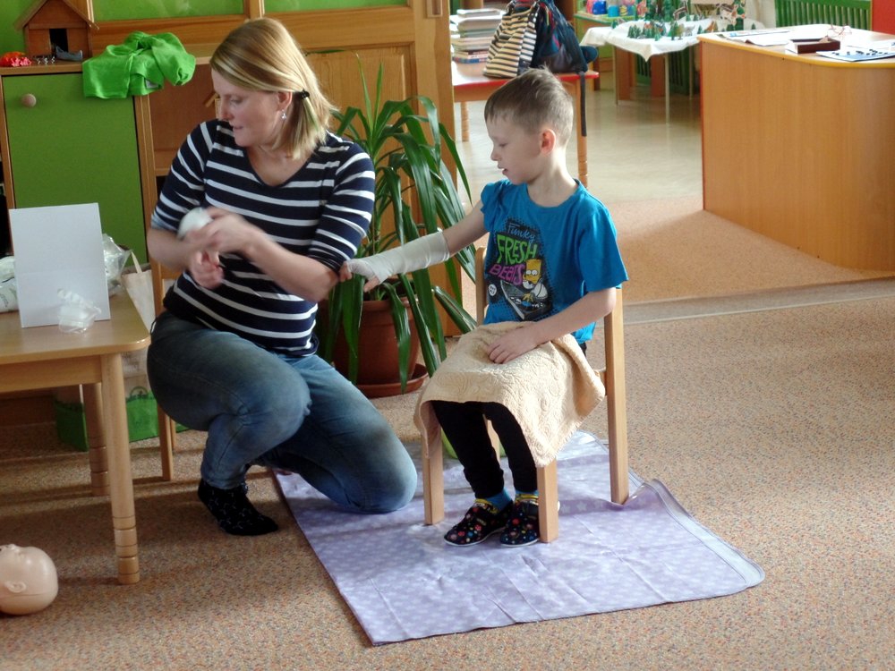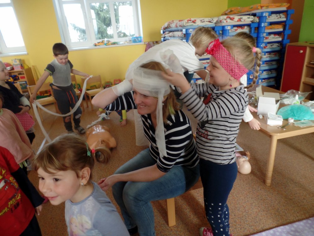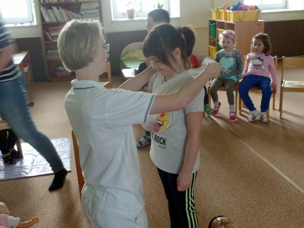 Následovala názorná praktická ukázka masáže srdce na „Andule“. Do praktické části besedy se již zapojily i děti a  masáž srdce si postupně také vyzkoušely. Zahrály si se sestřičkami na chirurgickou ambulanci, kde si vzájemně  pod vedením odbornic ve skupinkách ošetřovaly všelijaká zranění a úrazy pomocí obvazů, náplastí apod. Jeden dobrovolník si také vyzkoušel, jaké to je mít na ruce opravdovou sádru.