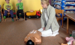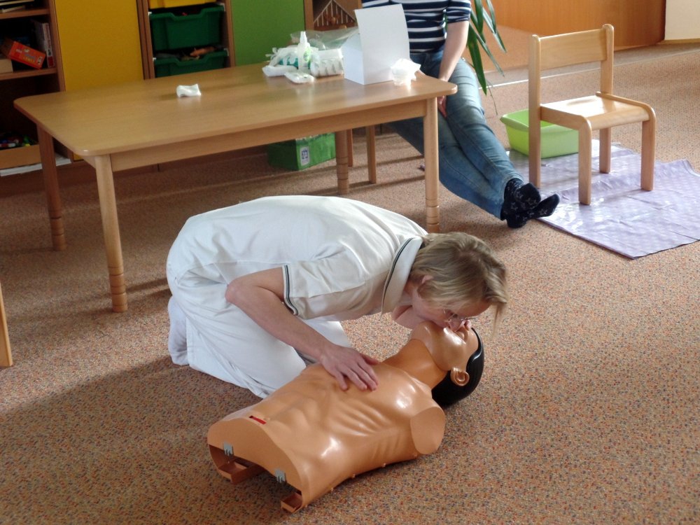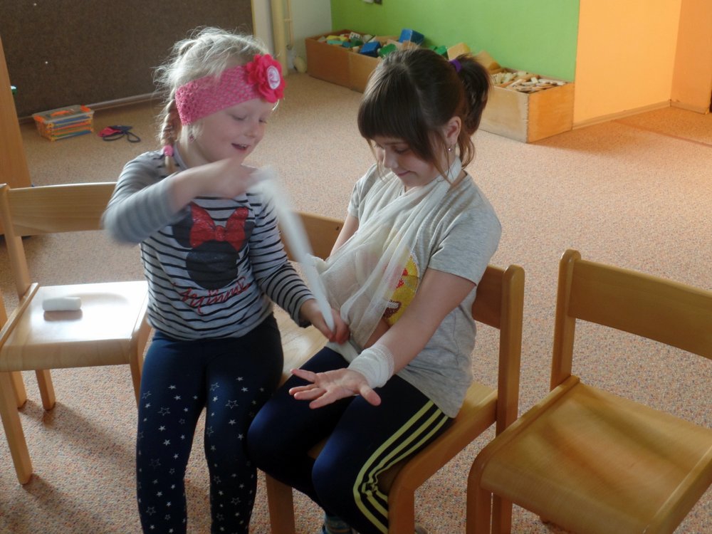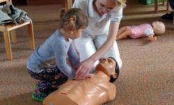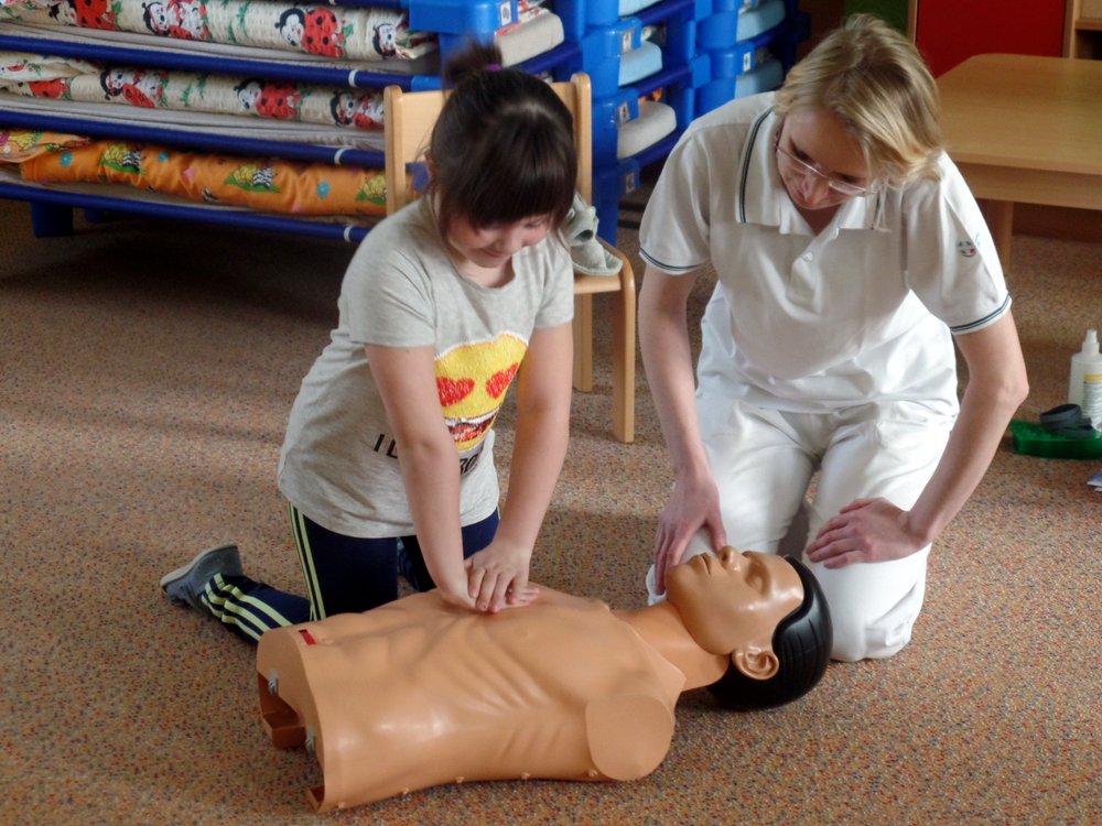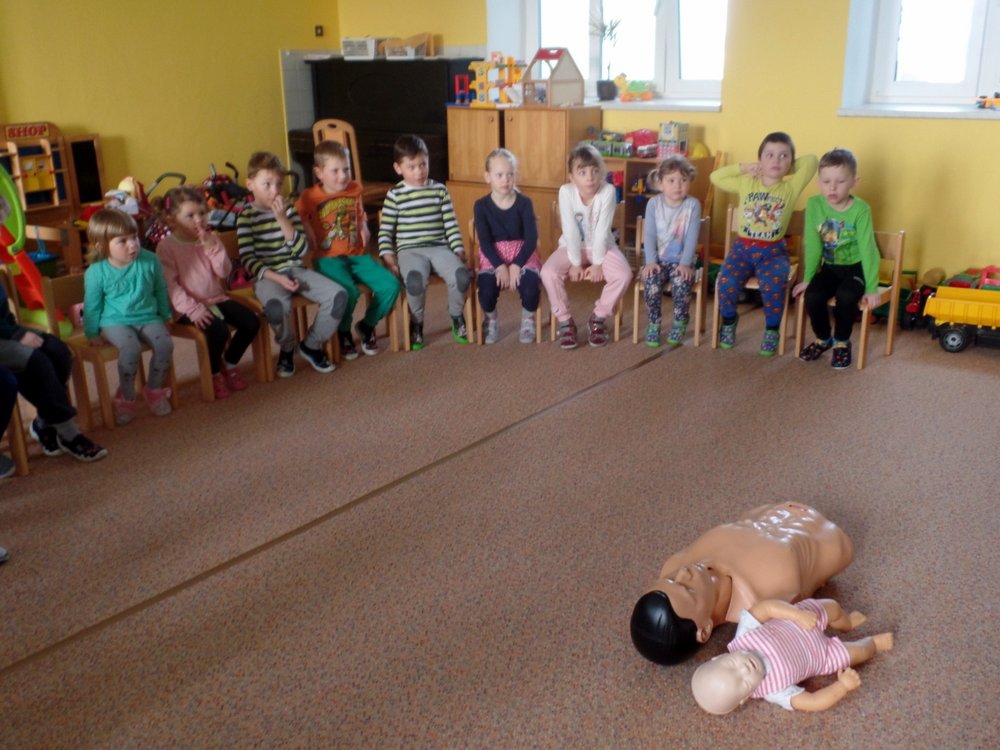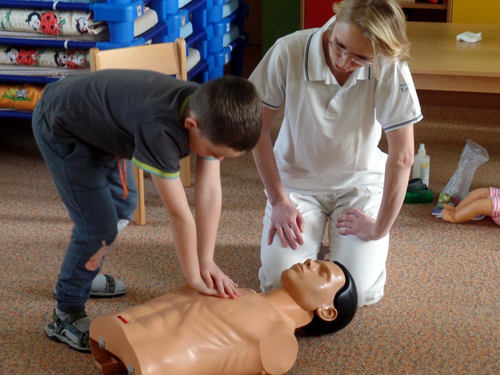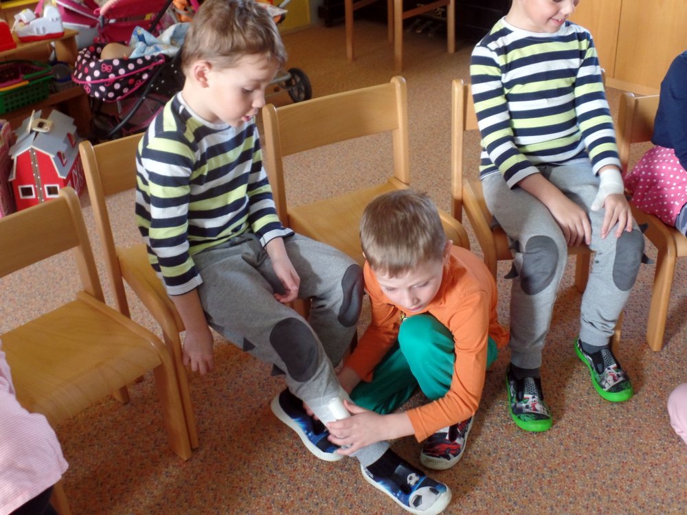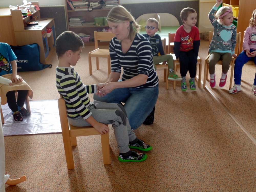 Následovala názorná praktická ukázka masáže srdce na „Andule“. Do praktické části besedy se již zapojily i děti a  masáž srdce si postupně také vyzkoušely. Zahrály si se sestřičkami na chirurgickou ambulanci, kde si vzájemně  pod vedením odbornic ve skupinkách ošetřovaly všelijaká zranění a úrazy pomocí obvazů, náplastí apod. Jeden dobrovolník si také vyzkoušel, jaké to je mít na ruce opravdovou sádru.