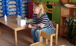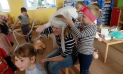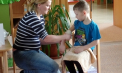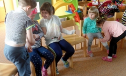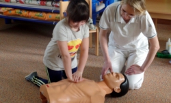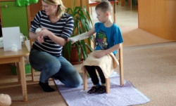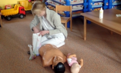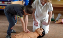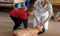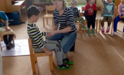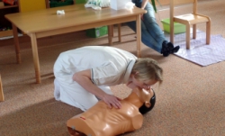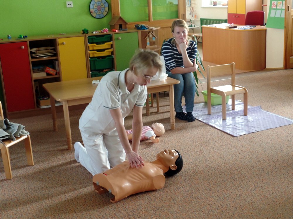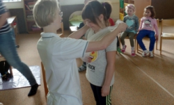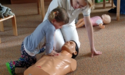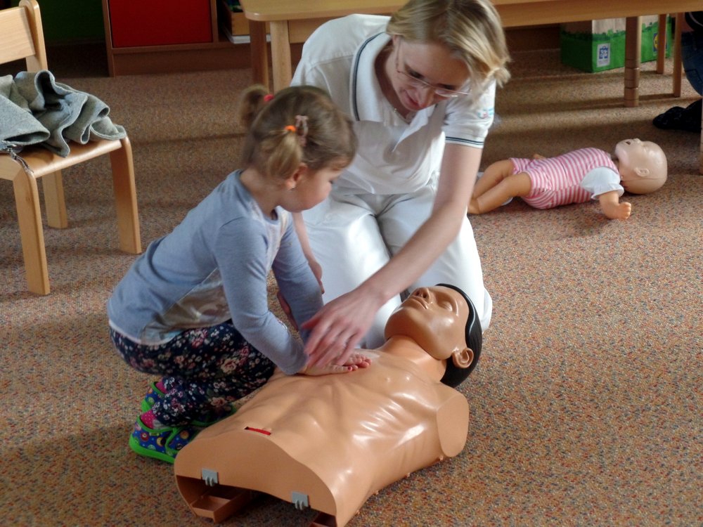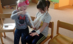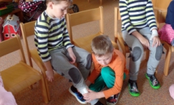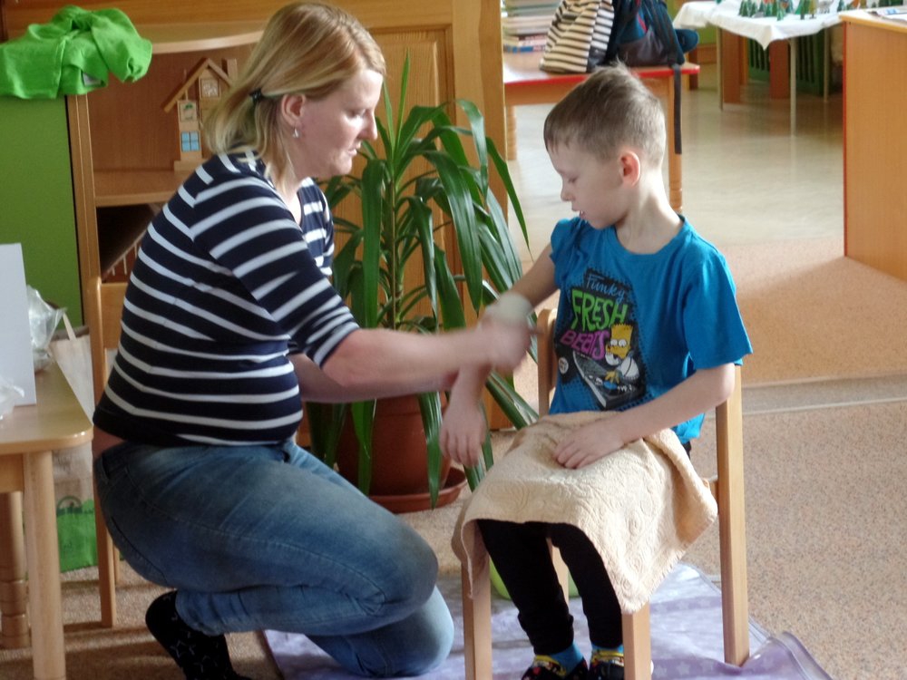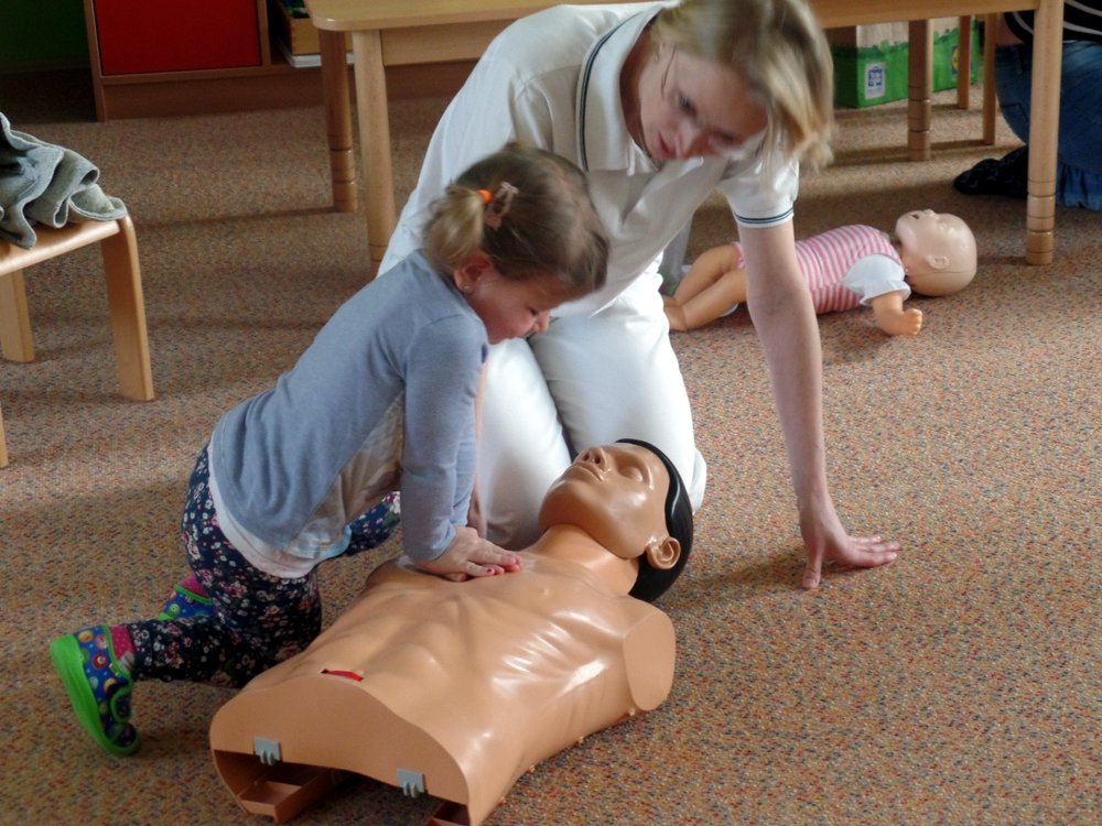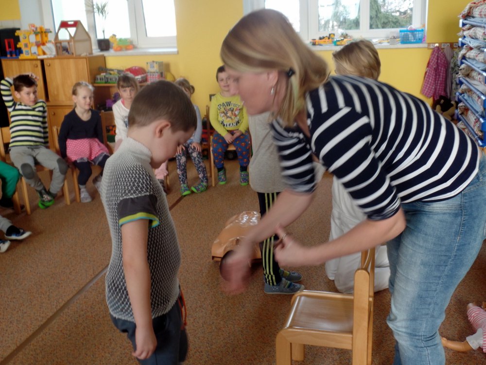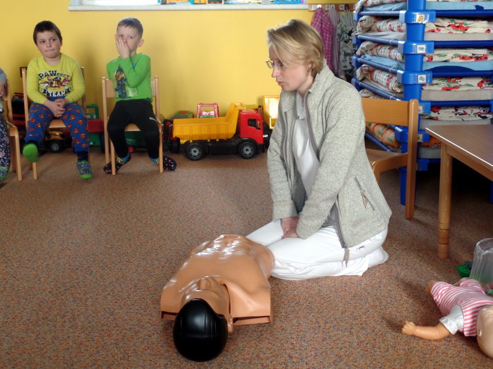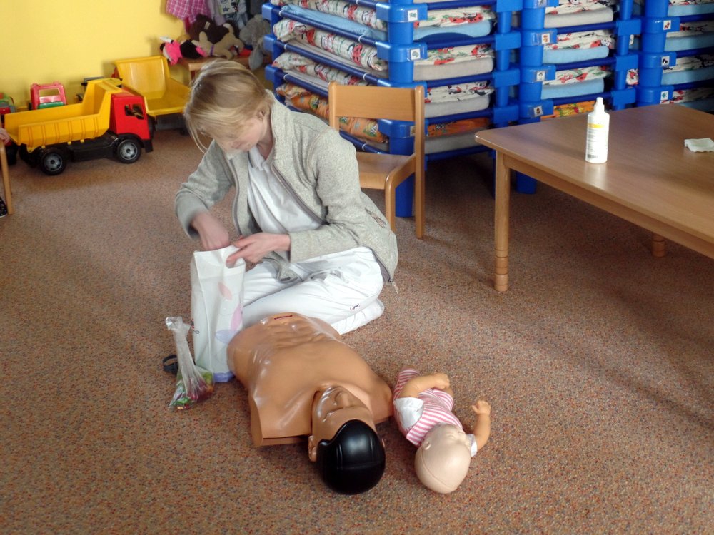 Následovala názorná praktická ukázka masáže srdce na „Andule“. Do praktické části besedy se již zapojily i děti a  masáž srdce si postupně také vyzkoušely. Zahrály si se sestřičkami na chirurgickou ambulanci, kde si vzájemně  pod vedením odbornic ve skupinkách ošetřovaly všelijaká zranění a úrazy pomocí obvazů, náplastí apod. Jeden dobrovolník si také vyzkoušel, jaké to je mít na ruce opravdovou sádru.