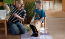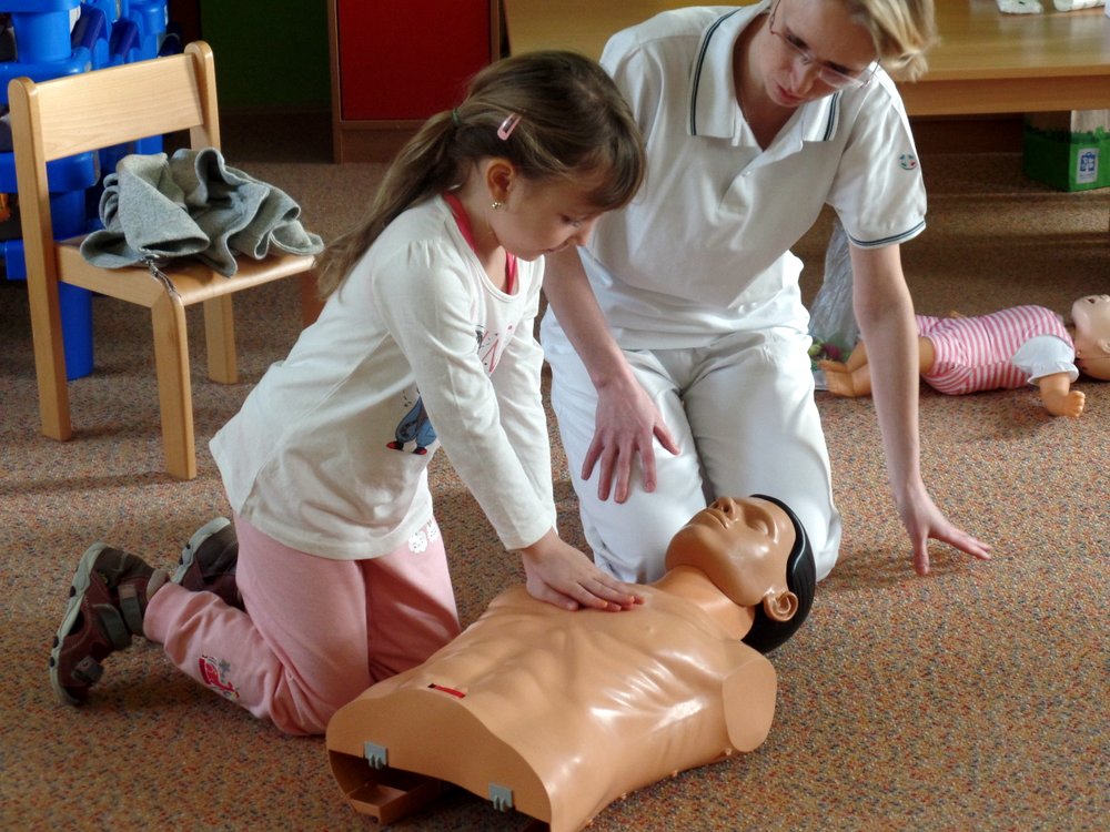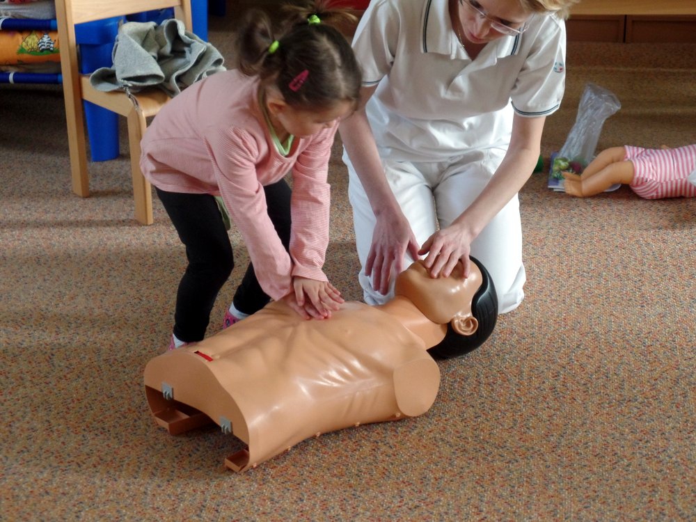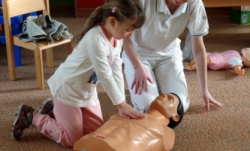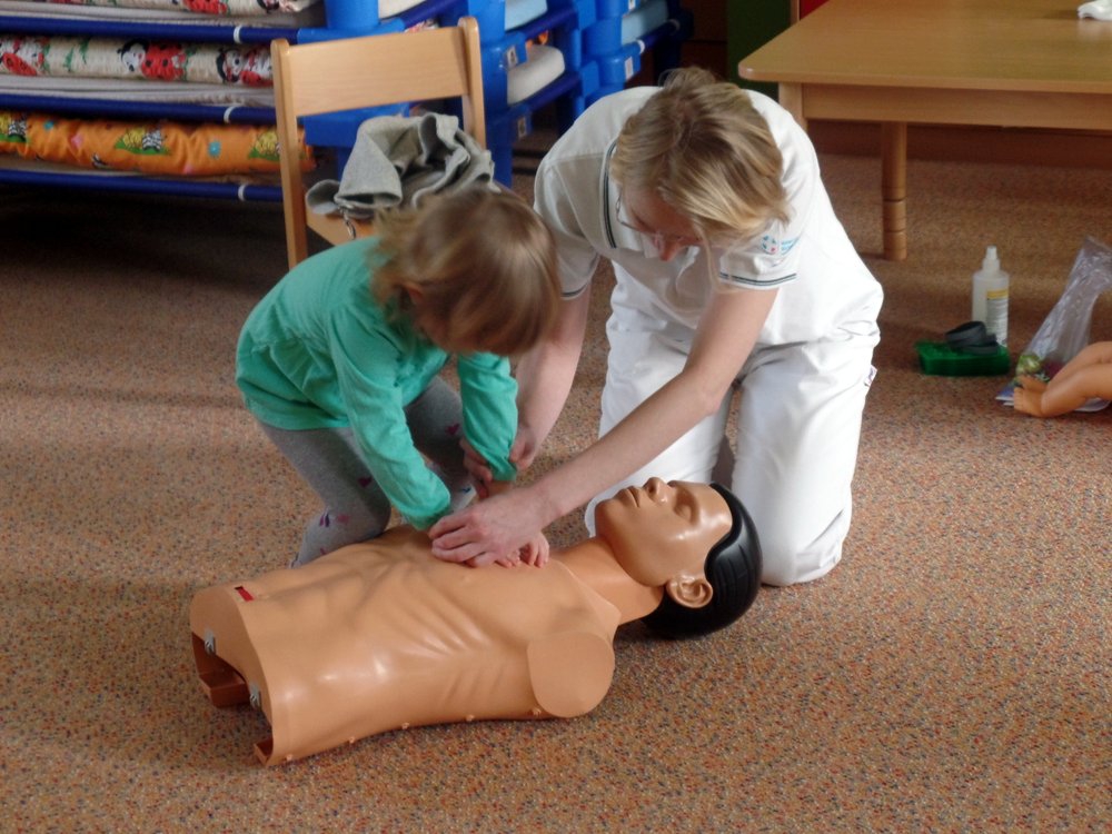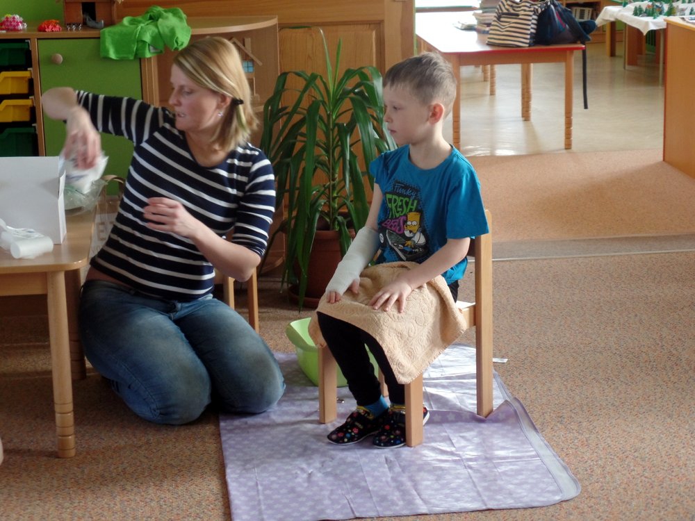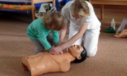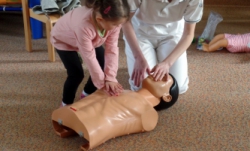 Následovala názorná praktická ukázka masáže srdce na „Andule“. Do praktické části besedy se již zapojily i děti a masáž srdce si postupně také vyzkoušely. Zahrály si se sestřičkami na chirurgickou ambulanci, kde si vzájemně pod vedením odbornic ve skupinkách ošetřovaly všelijaká zranění a úrazy pomocí obvazů, náplastí apod. Jeden dobrovolník si také vyzkoušel, jaké to je mít na ruce opravdovou sádru.