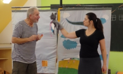 Jeho průvodcem je Dvounožec. My měli možnost pomocí jednoduchých krátkých příběhů porovnat svět z pohledu lidského i kočičího.Velmi originálně a nápaditě pojaté příběhy Modroočka a Dvounožce se nám velice líbily. Byly protkané množstvím jednoduchých, ale efektních triků, zvuků, loutek, krásných pěveckých výkonů doprovázených hrou na kytaru. Díky tomu se hercům podařilo udržet dětský zájem a pozornost, děti příjemně naladit a potěšit.