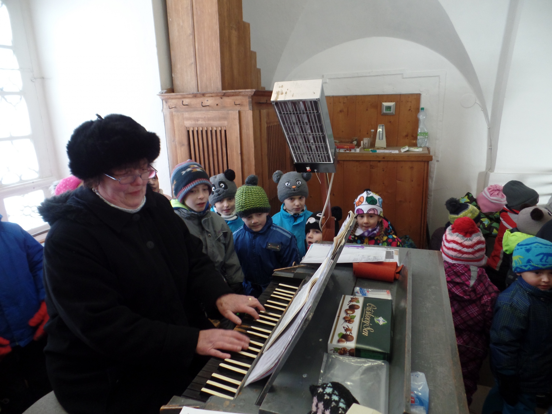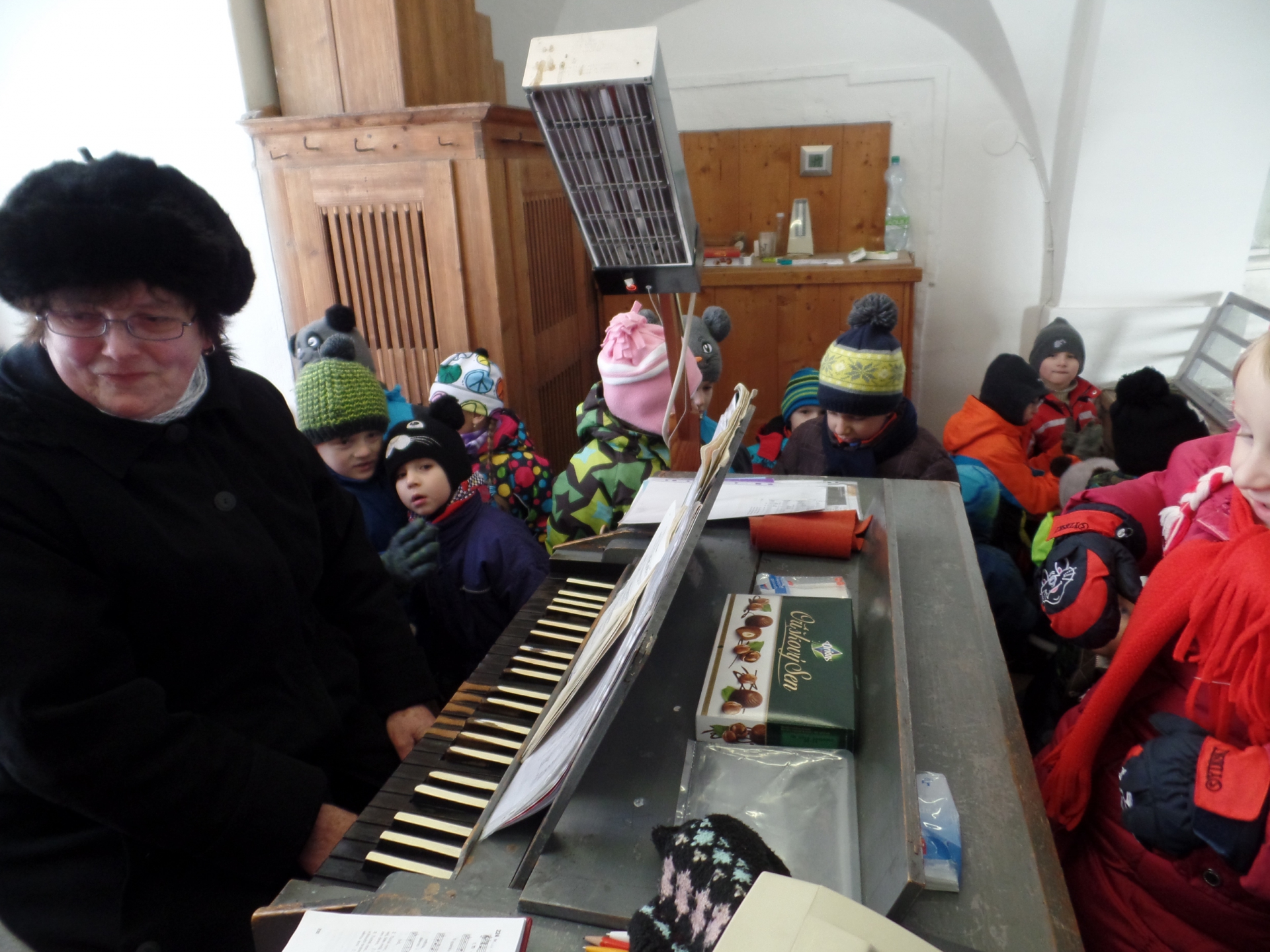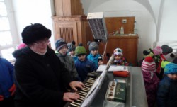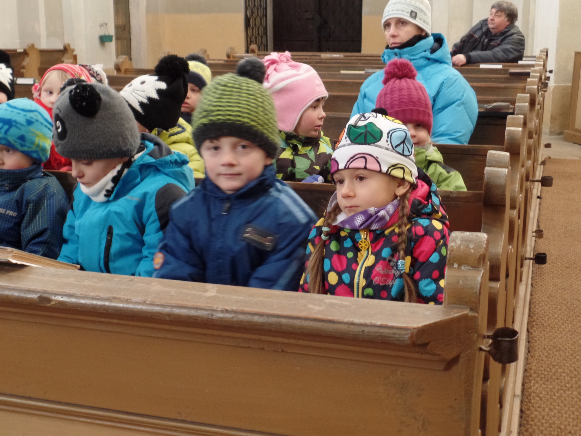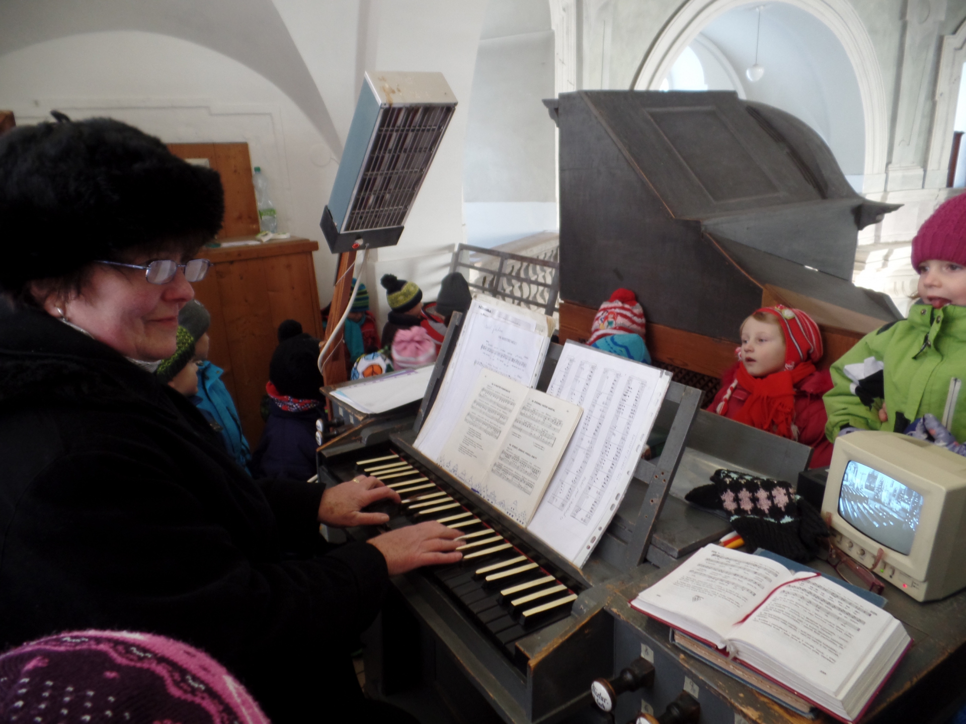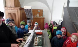 Měli jsme možnost prohlédnout si vánoční výzdobu kostela i betlém. Poté jsme po točitých schodech vystoupali až k varhanům. Pohled do prostoru kostela z výšky byl pro spoustu dětí nevšedním zážitkem. Za varhanního doprovodu pí Genertové jsme si zazpívali několik vánočních koled a společně si zavzpomínali na Vánoce. Děkujeme paní Genertové za zprostředkování akce, výklad a za všechny odpovědi na zvídavé dětské otázky.
