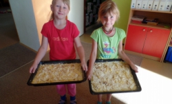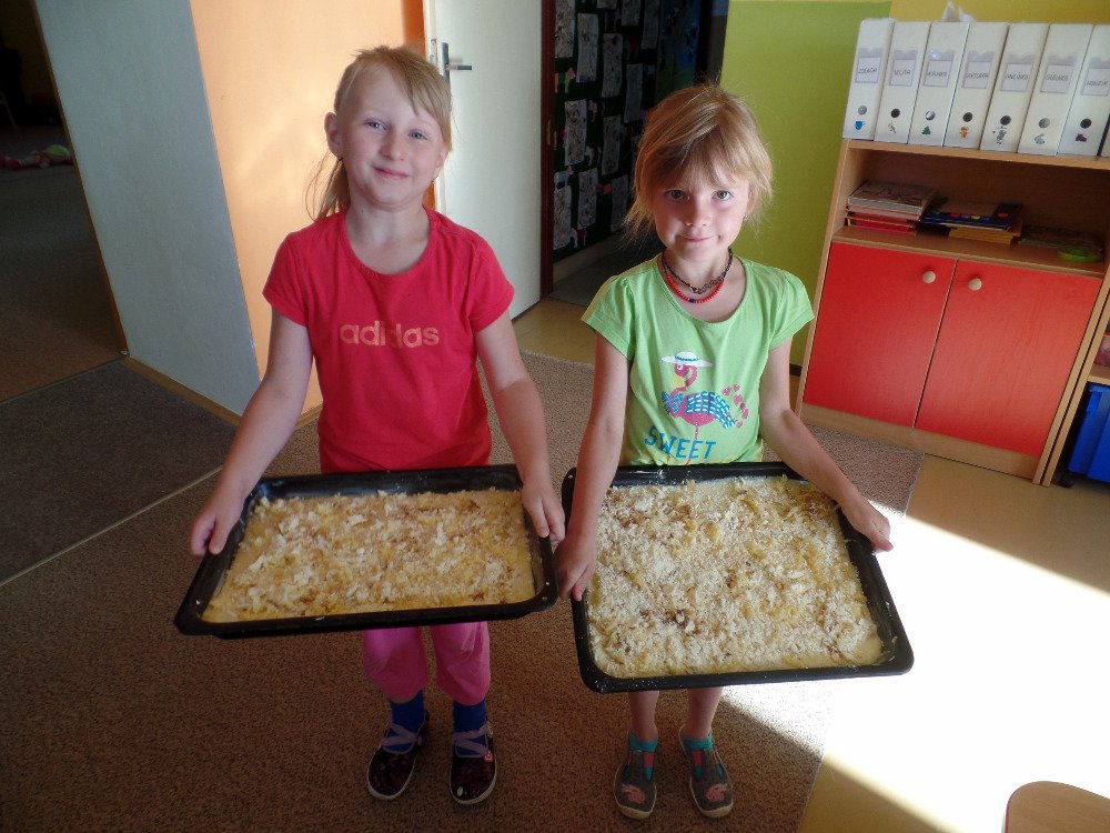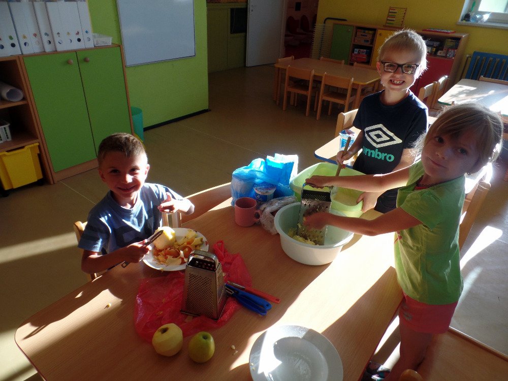 Ve čtvrtek ráno jsme s dětmi připravili těsto, loupali a strouhali jablíčka na buchtu, abychom měli co na páteční snídani a pí kuchařka nám buchtu upekla.