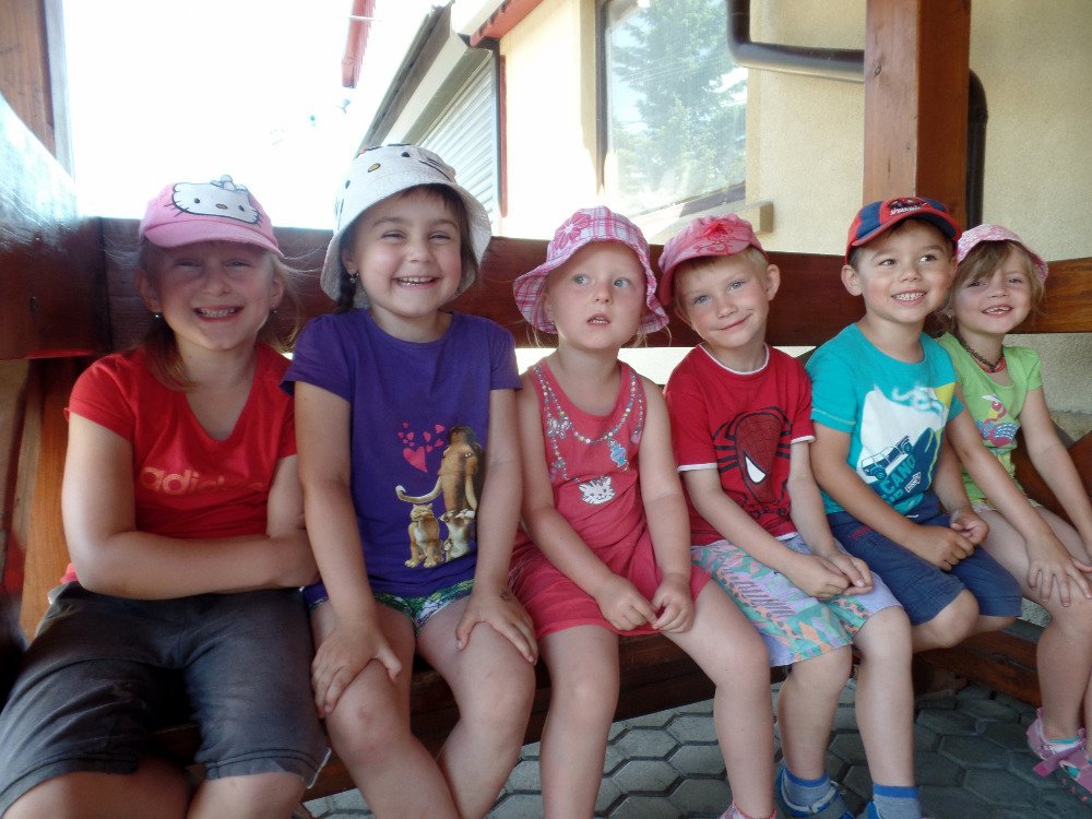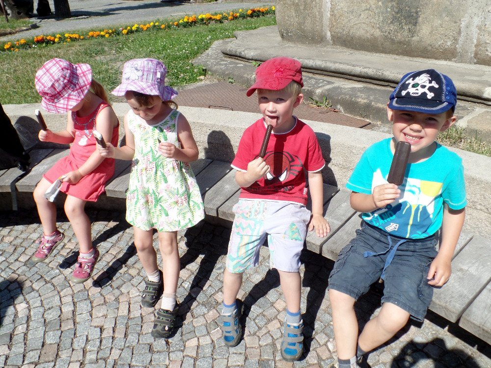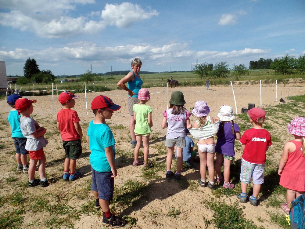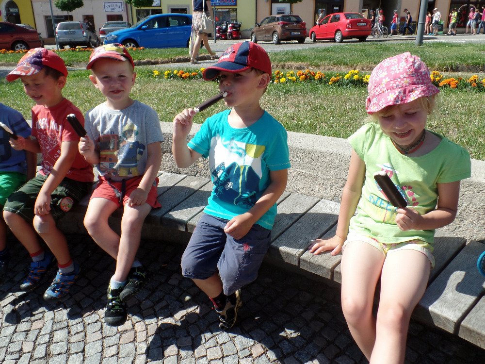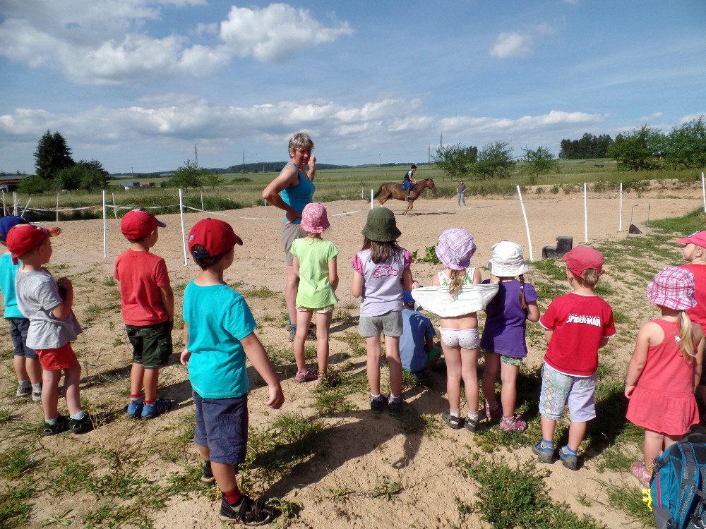 V 15.35 hod ( když mladší kamarádi odešli ze školky domů) jsme vyrazili autobusem do Police nad Metují, kde se děti osvěžily v prameni Julinka a smlsly si nanuka. Poté jsme vyrazili na Radešov, kde jsme měli domluvenou návštěvu u koní. Paní Kolbová nás velmi mile přivítala, provedla nás stájemi, povyprávěla o jednotlivých koních a zodpověděla na zvídavé dětské otázky. S koněm nám také předvedli základní dovednosti a povely, povozili děti na koni, což byl pro mnohé z nich nezapomenutelný zážitek.