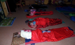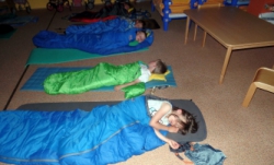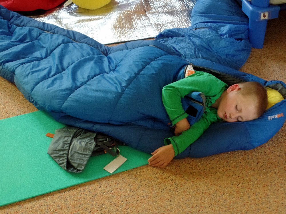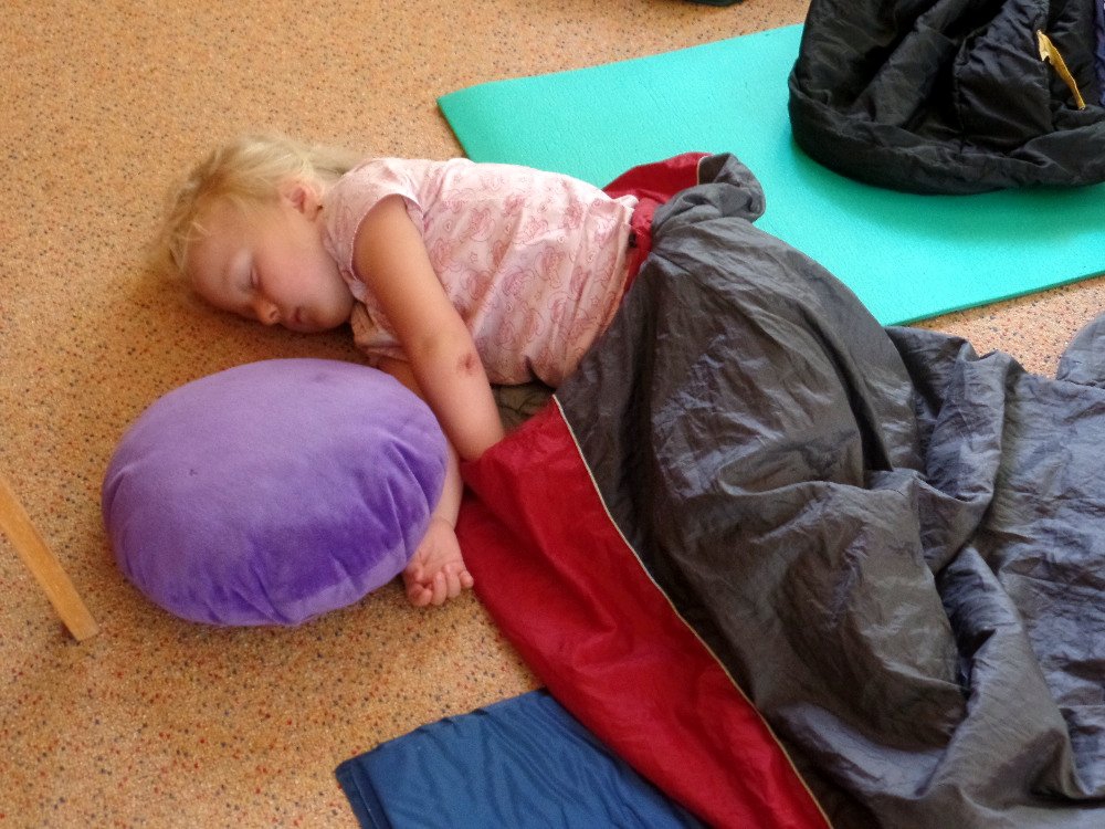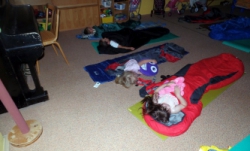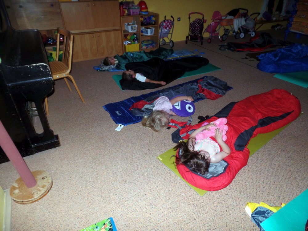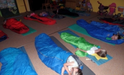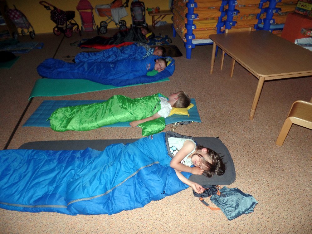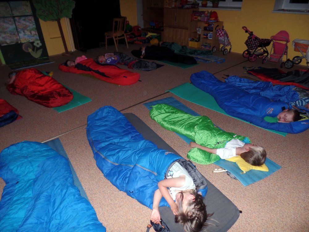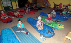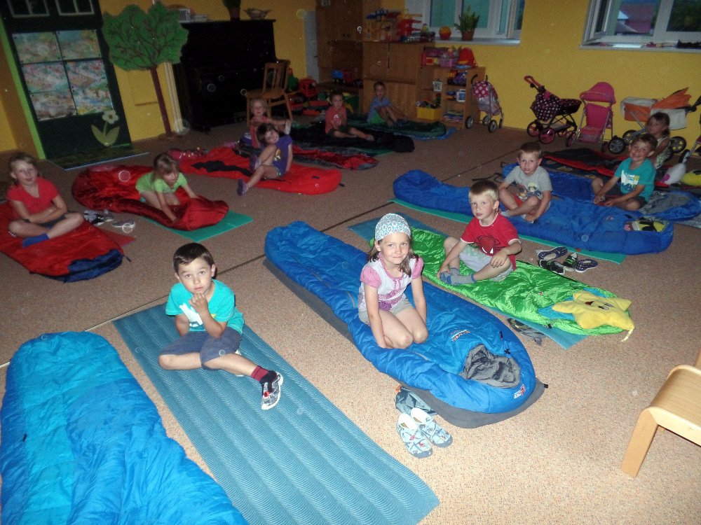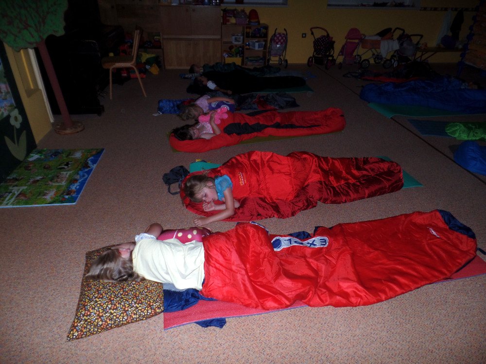 Potom jsme se společně vydali na zahradu MŠ, kde jsme si pohráli a opekli vuřty k večeři. Po večeři jsme se šli umýt, připravit spacáky, karimatky, plyšáčky, pyžamka a užili jsme si baterkovou show. Když se začalo stmívat, byla pro děti připravena nejdůležitější a nejočekávanější akce - stezka odvahy. Dětičky byly statečné, odvážně šly po cestě měsíčního paprsku a poctivě plnily úkoly malého strašidýlka. Jejich odměnou byl na konci cesty poklad - rybičky. A pak už rychle do spacáků a dobrou noc.