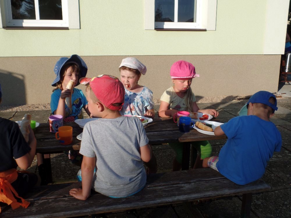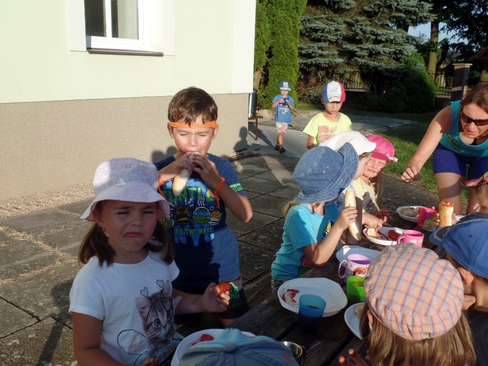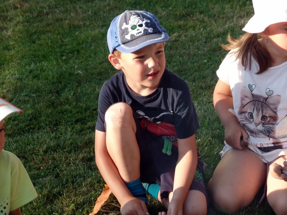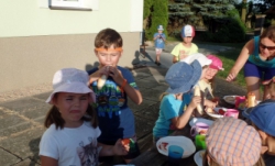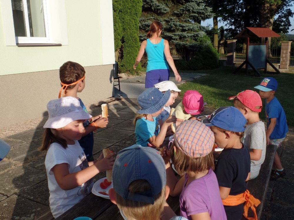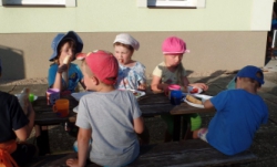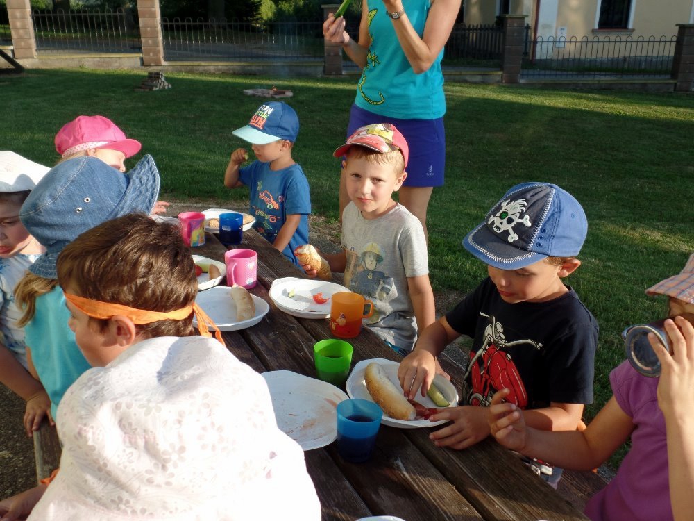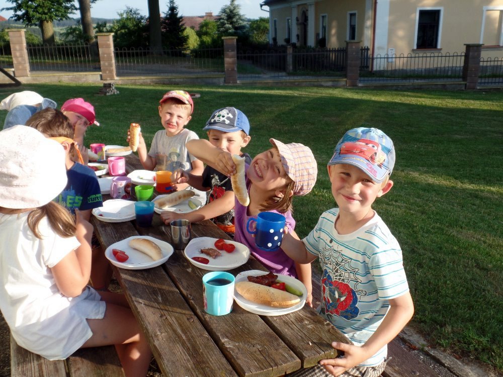 Druhá skupina plnila připravené úkoly a u lesa se setkala s ostatními kamarády. Společně jsme sešli až na Mýto, kde nás čekalo sladké osvěžující občerstvení - zmrzlinový pohár. Děkujeme majitelům restaurace za sponzorský dar. Do odjezdu autobusu do Bezděkova nám zbylo ještě trochu času k proběhnutí na dětském hřišti u Mýta. Po návratu jsme rozdělali oheň a k večeři si opekli buřty. Připravili jsme si ležení - spacáky a karimatky, provedli večerní hygienu a potom nás čekala stezka odvahy - hledání pokladu za měsíčním paprskem. Děti byly statečné. Za statečnost si každý přinesl stříkací hračku do vody. Unaveni a plni dojmů jsme ulehli do spacáků. Ráno jsme posnídali buchtu a čaj, děti dostaly diplomy a vyprávěly ostatním kamarádům, co všechno zažily.