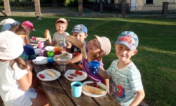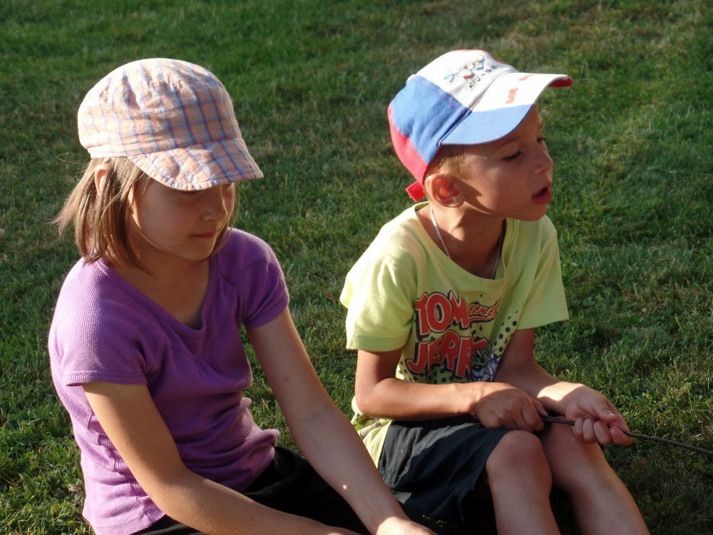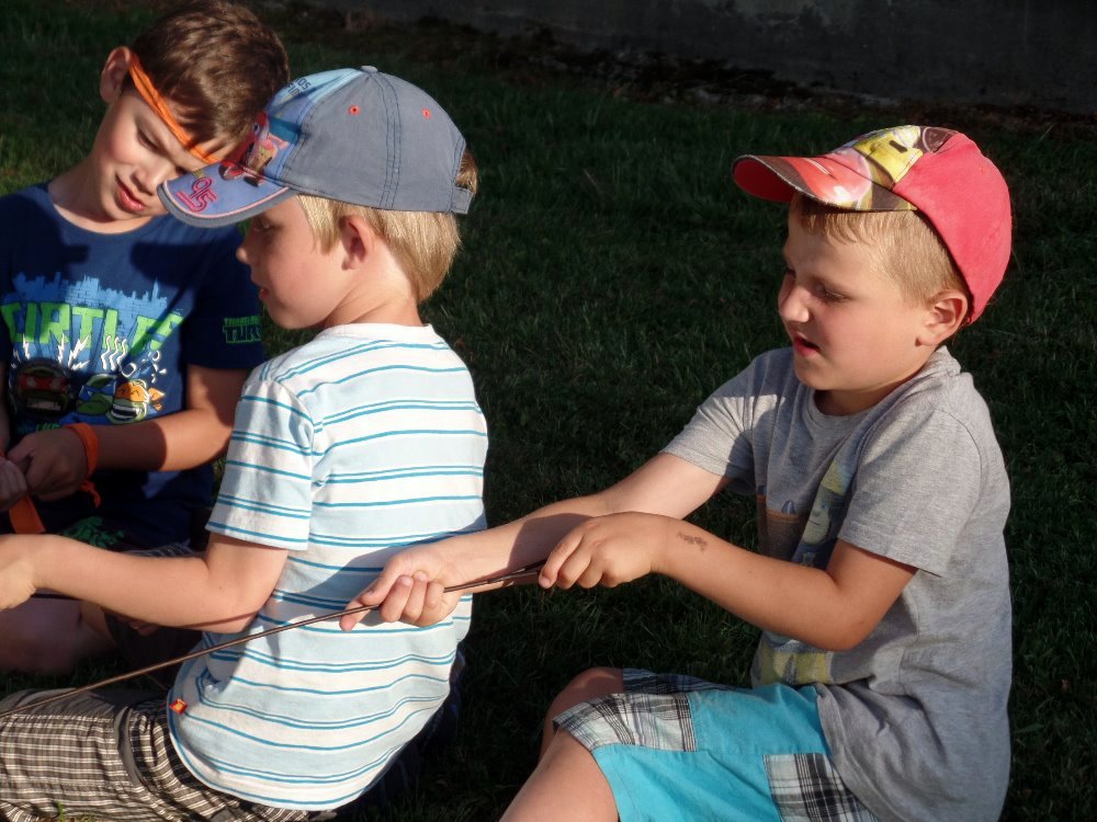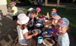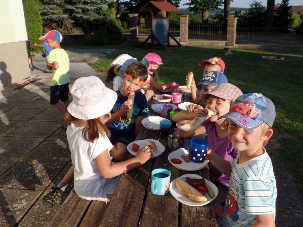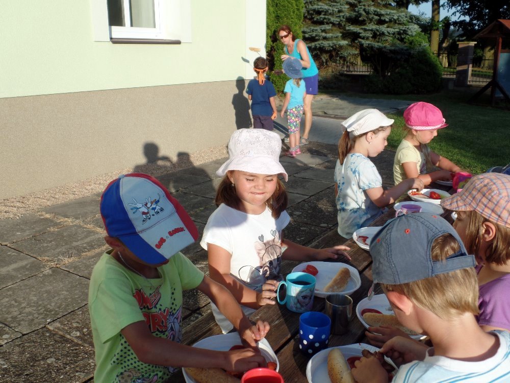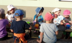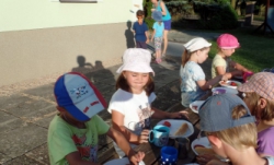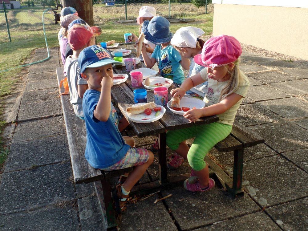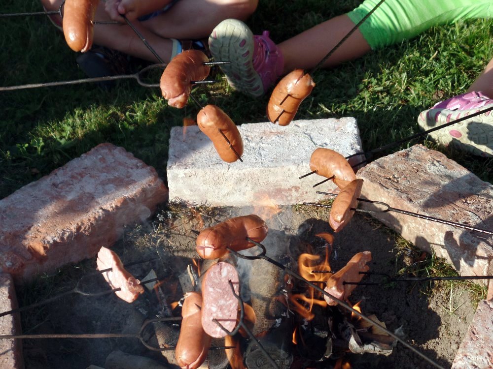Druhá skupina plnila připravené úkoly a u lesa se setkala s ostatními kamarády. Společně jsme sešli až na Mýto, kde nás čekalo sladké osvěžující občerstvení - zmrzlinový pohár. Děkujeme majitelům restaurace za sponzorský dar. Do odjezdu autobusu do Bezděkova nám zbylo ještě trochu času k proběhnutí na dětském hřišti u Mýta. Po návratu jsme rozdělali oheň a k večeři si opekli buřty. Připravili jsme si ležení - spacáky a karimatky, provedli večerní hygienu a potom nás čekala stezka odvahy - hledání pokladu za měsíčním paprskem. Děti byly statečné. Za statečnost si každý přinesl stříkací hračku do vody. Unaveni a plni dojmů jsme ulehli do spacáků. Ráno jsme posnídali buchtu a čaj, děti dostaly diplomy a vyprávěly ostatním kamarádům, co všechno zažily.