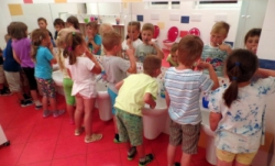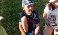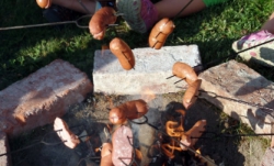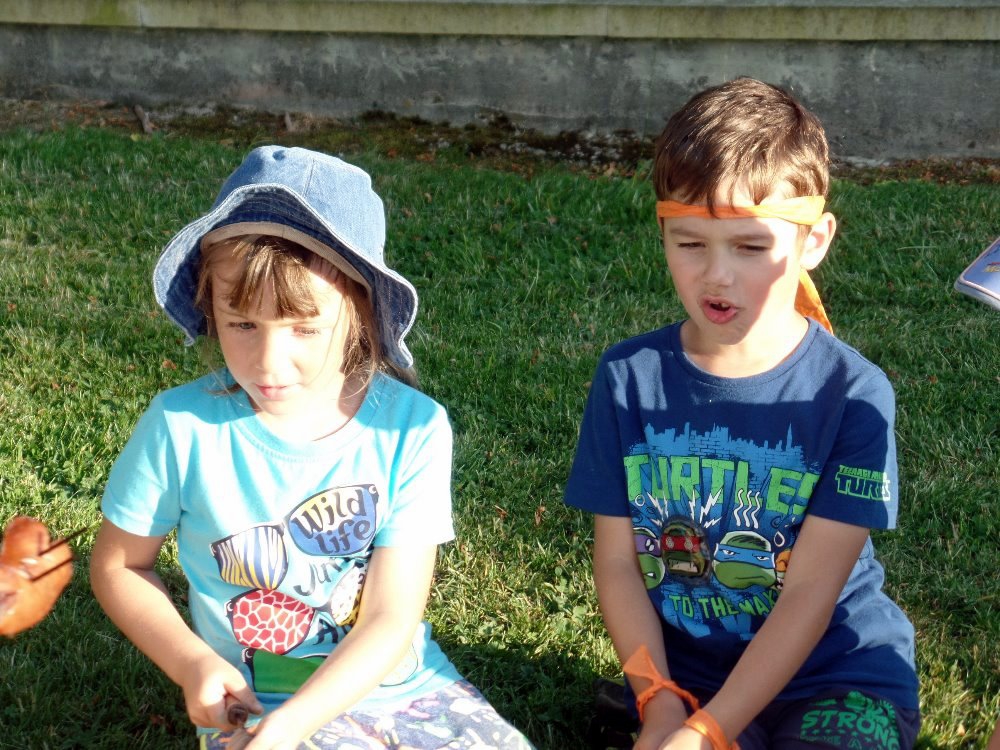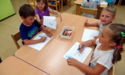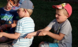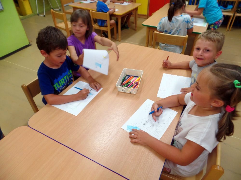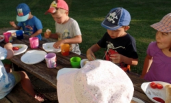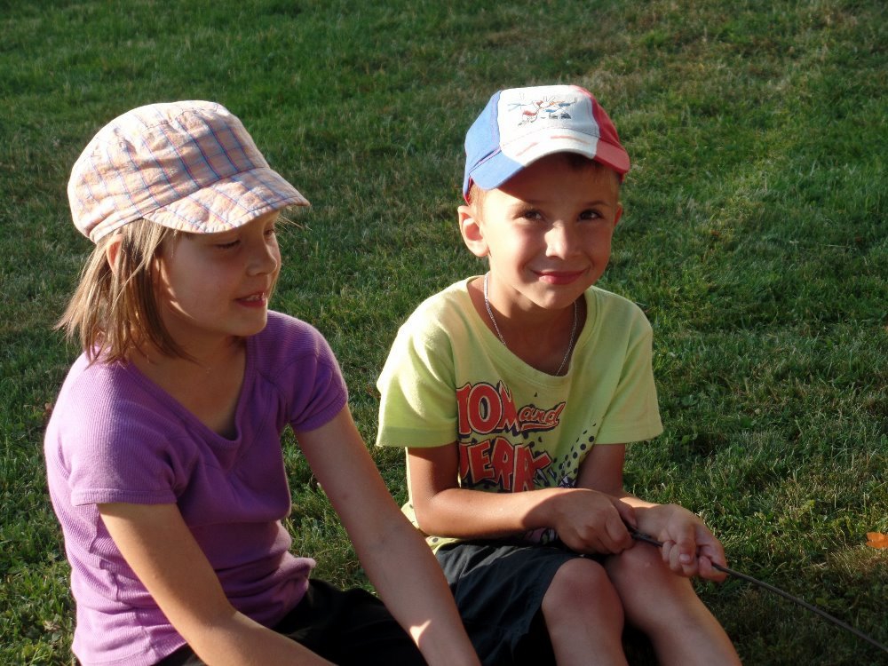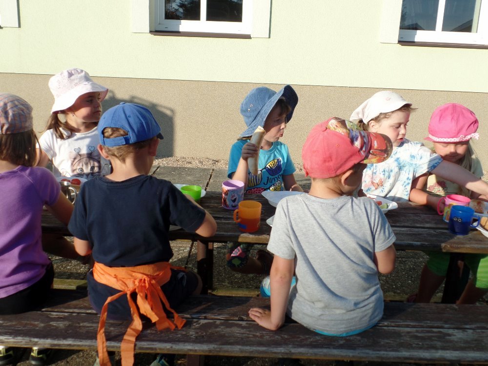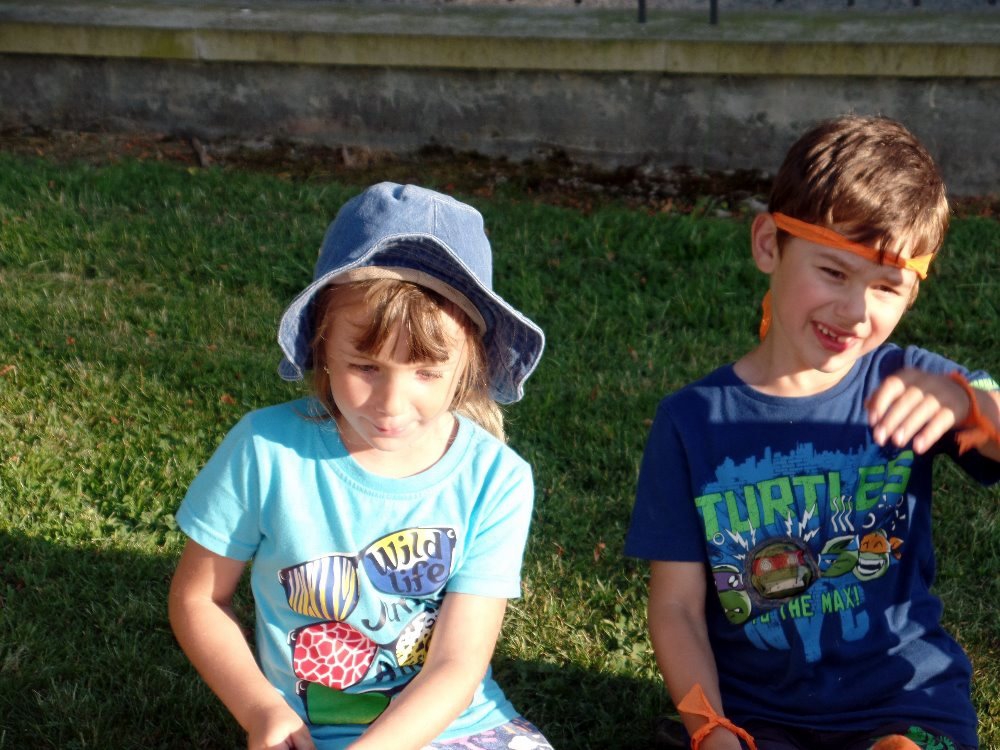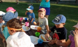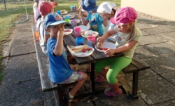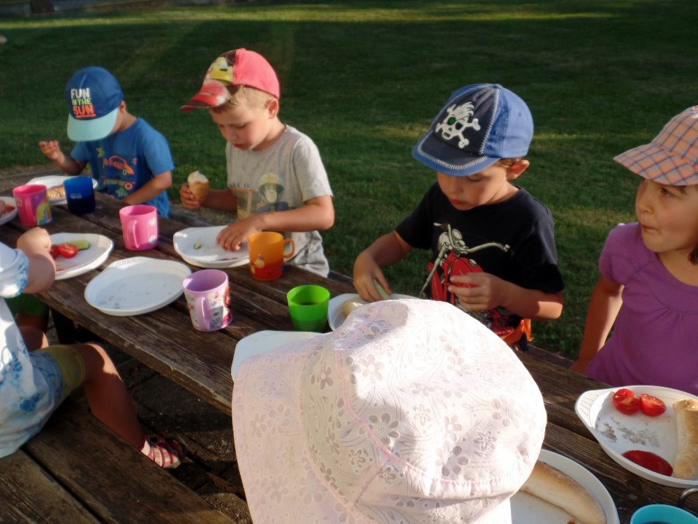 Druhá skupina plnila připravené úkoly a u lesa se setkala s ostatními kamarády. Společně jsme sešli až na Mýto, kde nás čekalo sladké osvěžující občerstvení - zmrzlinový pohár. Děkujeme majitelům restaurace za sponzorský dar. Do odjezdu autobusu do Bezděkova nám zbylo ještě trochu času k proběhnutí na dětském hřišti u Mýta. Po návratu jsme rozdělali oheň a k večeři si opekli buřty. Připravili jsme si ležení - spacáky a karimatky, provedli večerní hygienu a potom nás čekala stezka odvahy - hledání pokladu za měsíčním paprskem. Děti byly statečné. Za statečnost si každý přinesl stříkací hračku do vody. Unaveni a plni dojmů jsme ulehli do spacáků. Ráno jsme posnídali buchtu a čaj, děti dostaly diplomy a vyprávěly ostatním kamarádům, co všechno zažily.