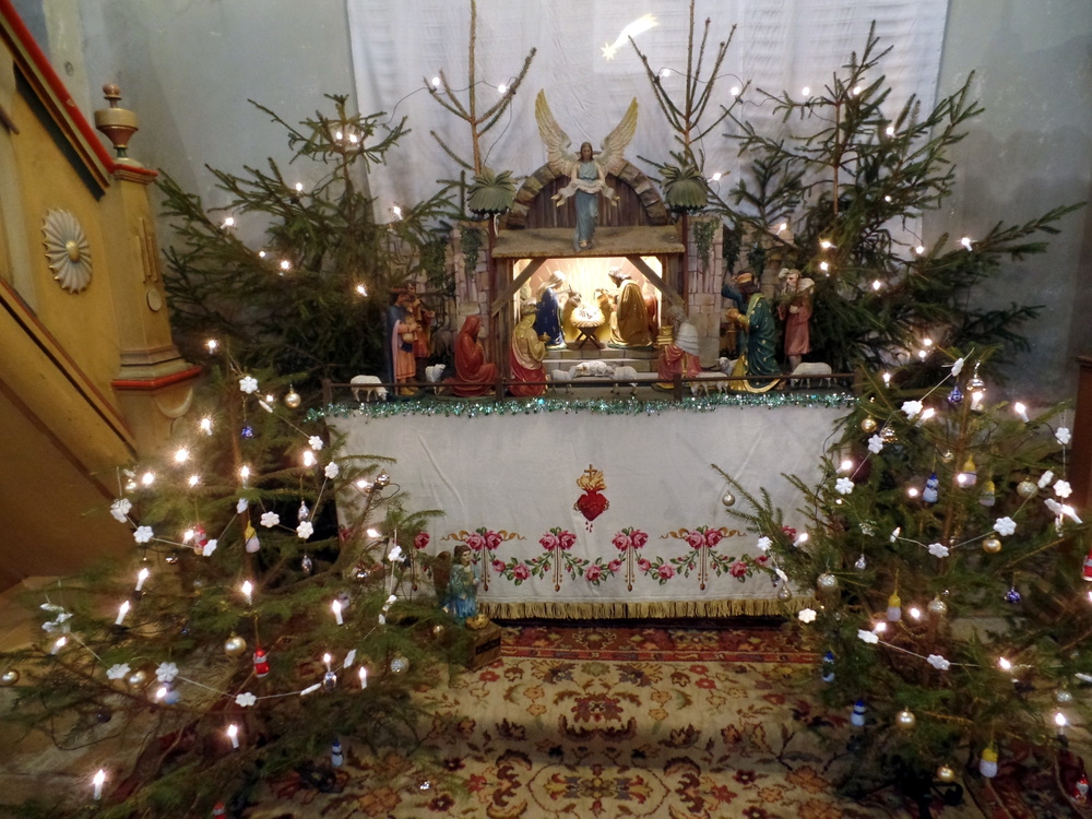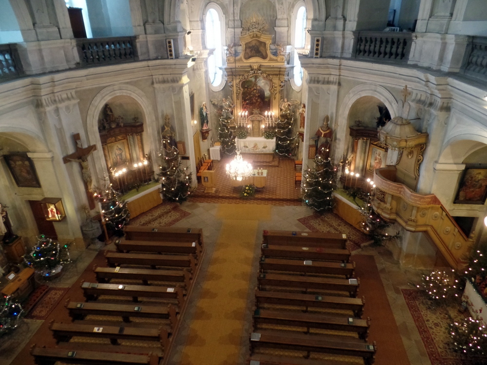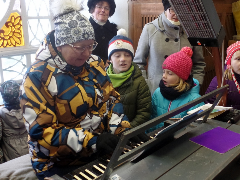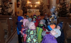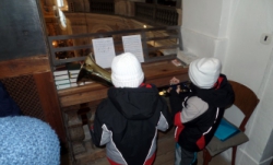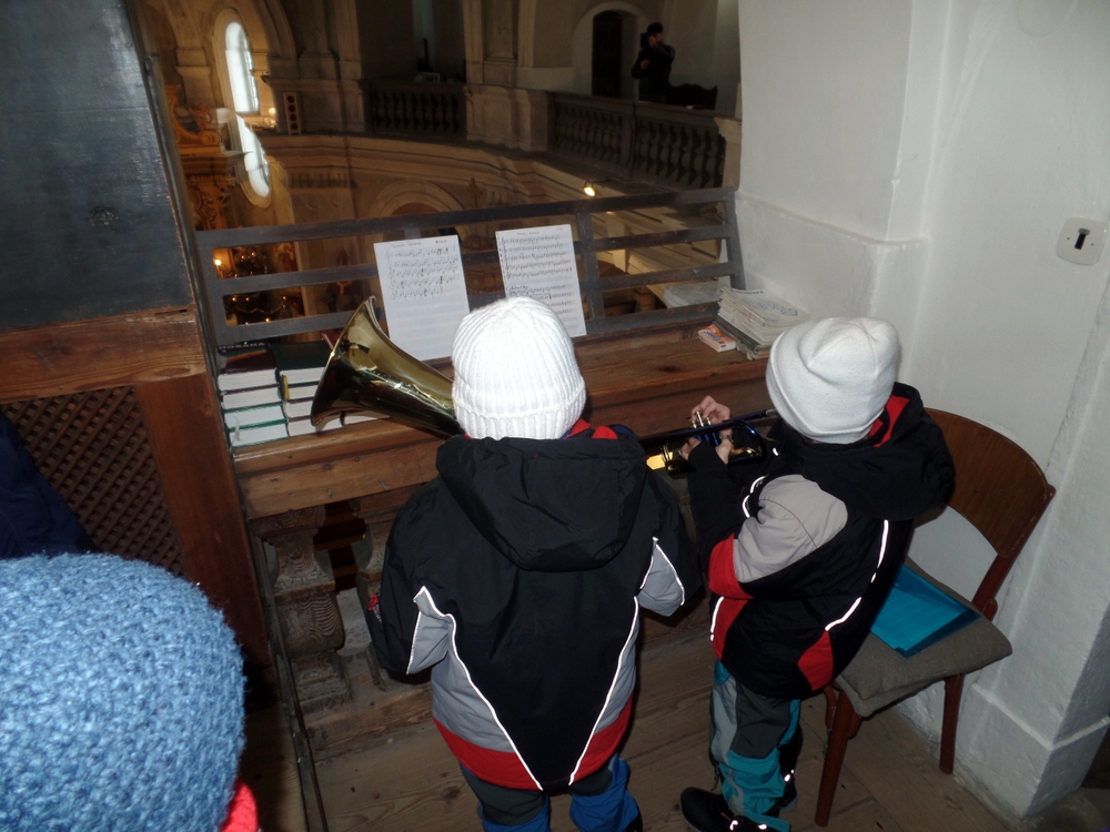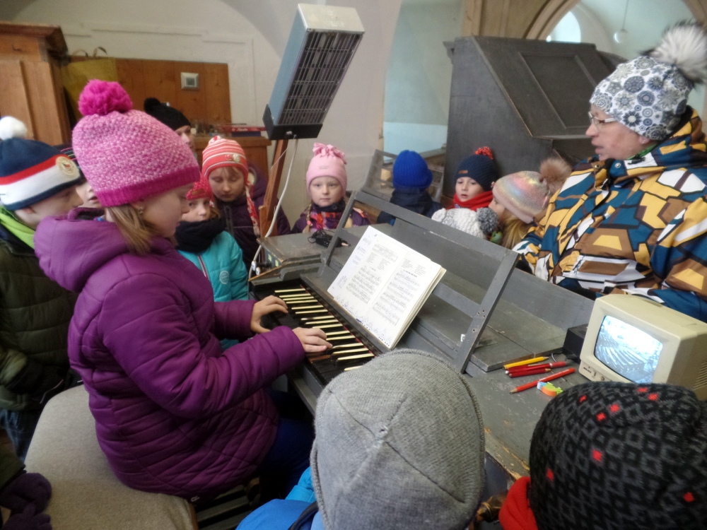 Celý kostel s vánoční výzdobou i betlémem jsme si podrobně prohlédli a vystoupali jsme po točitých schodech k varhanům. Za varhanního doprovodu pí Genertové, sester Beranových a pí učitelky Vrabcové a za troubení trumpet bratrů Němcových jsme si zazpívali několik Vánočních koled a zavzpomínali tak na již uplynulé Vánoce.