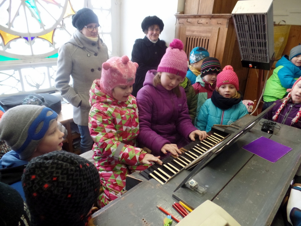 Velkým zážitkem pro děti byl pohyblivý mluvící andělíček, výstup po točitých schodech a výhled zhora od varhanů jednak ven přes okno s barevnou vitráží , tak i dovnitř na veliký prostor kostela.