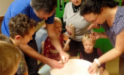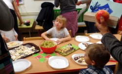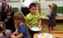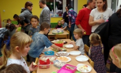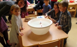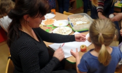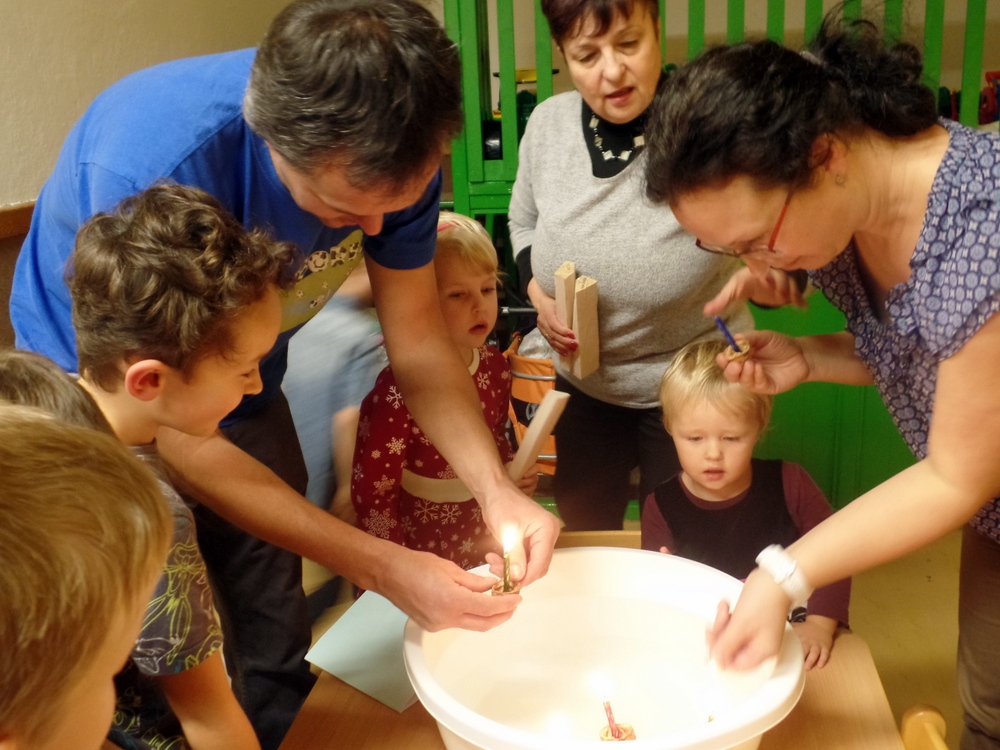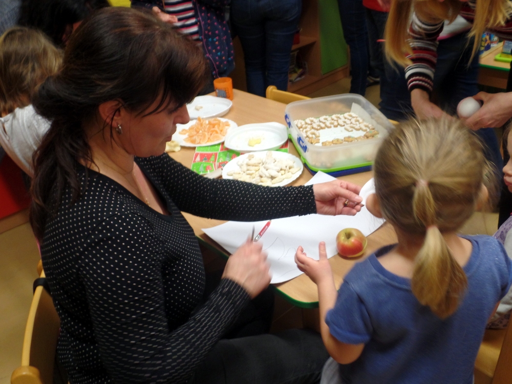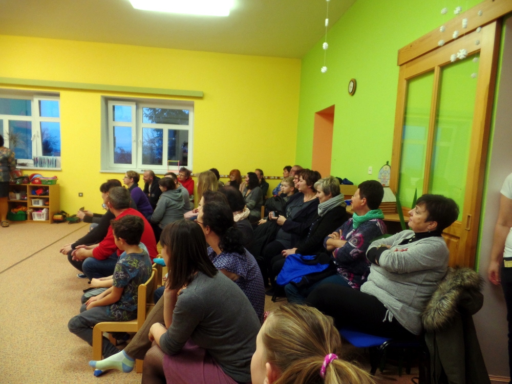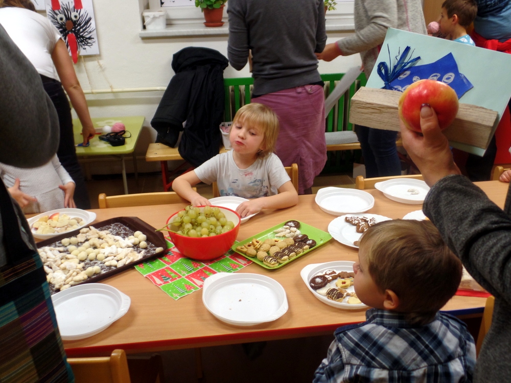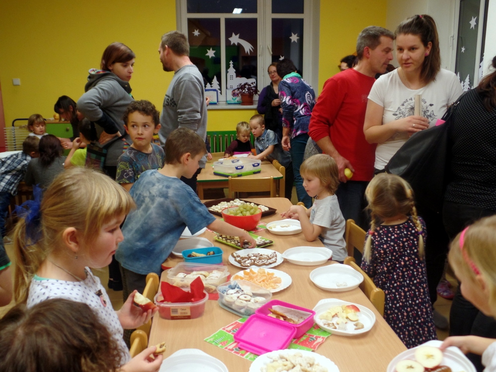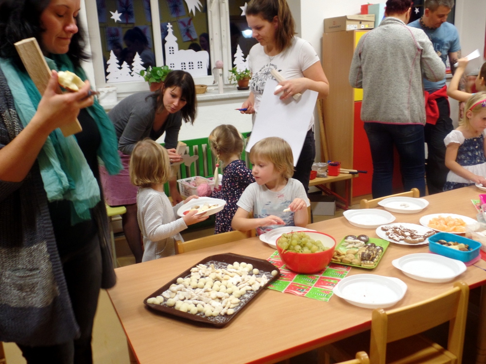 Děti se v prostředí školky chovaly více uvolněně. Po skončení programu jsme pro všechny zúčastněné připravily vánoční zvyky - rozkrajování jablíček, pouštění lodiček a vyrábění andílků. Rodiče se do aktivit zapojili společně se svými dětmi, atmosféra byla velmi přátelská a milá. Během aktivit všichni ochutnali cukroví, které přinesly maminky a rodiče na oplátku cukroví vyrobené dětmi. Všem děkujeme za přinesené cukroví a ovoce.