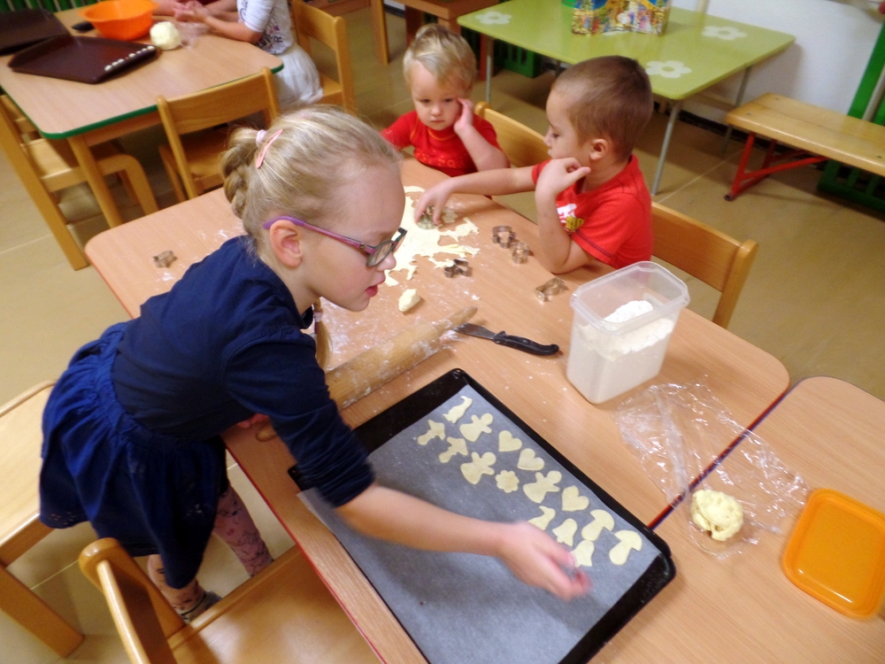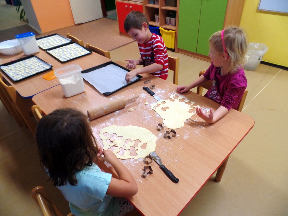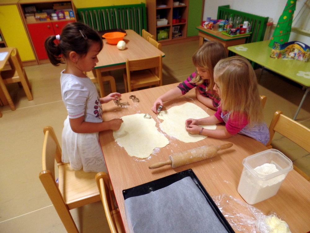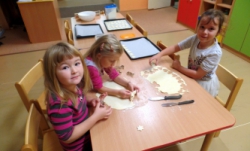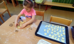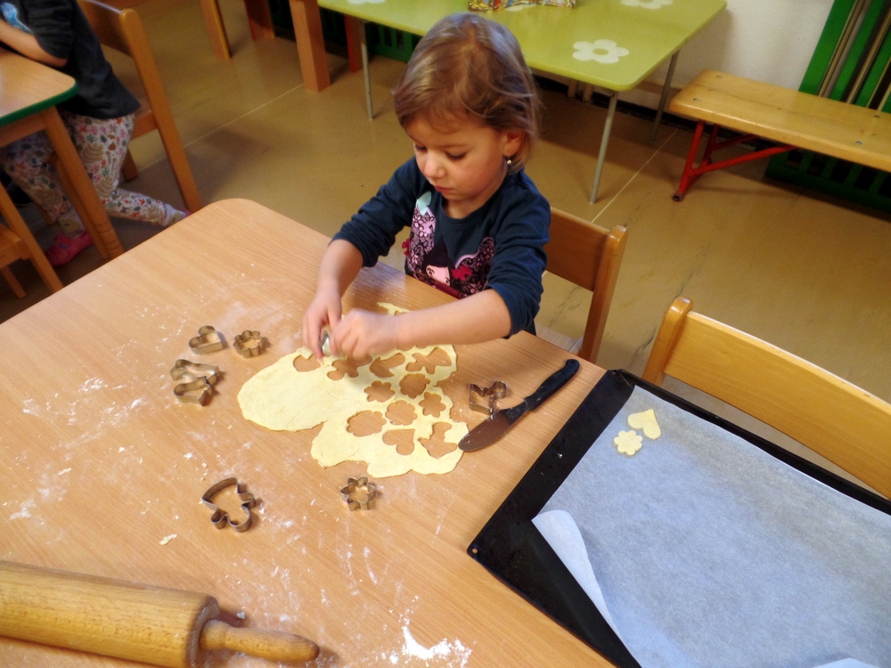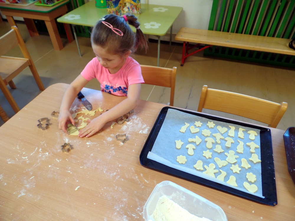 Vyzkoušely si vykrajování různých tvarů vykrajovátky a tvořily kuličky. Postupně se vystřídaly a velmi je to bavilo.