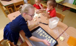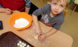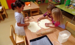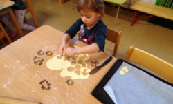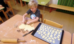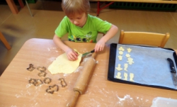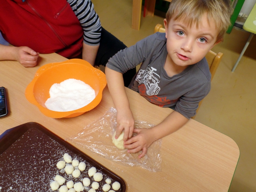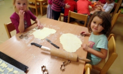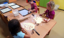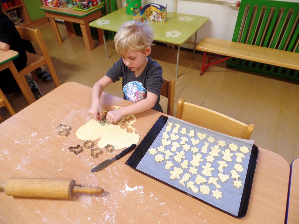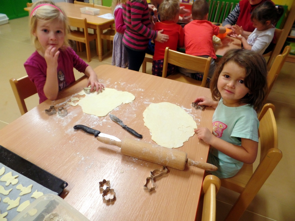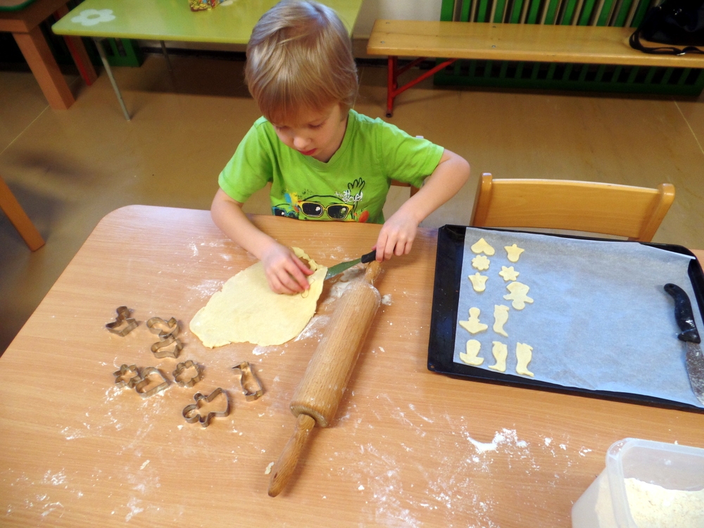 Vyzkoušely si vykrajování různých tvarů vykrajovátky a tvořily kuličky. Postupně se vystřídaly a velmi je to bavilo.