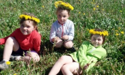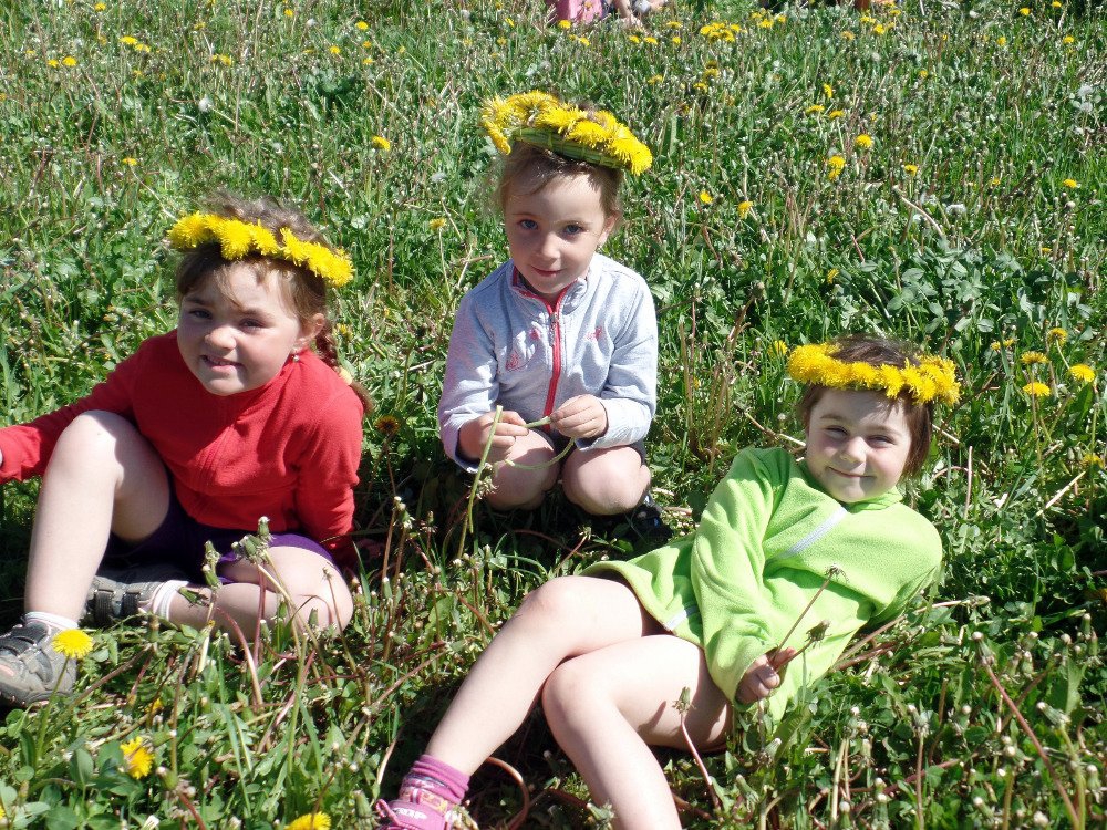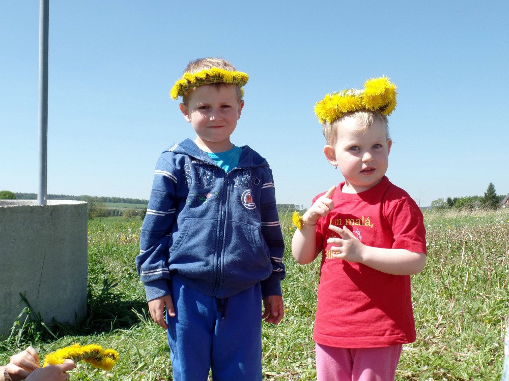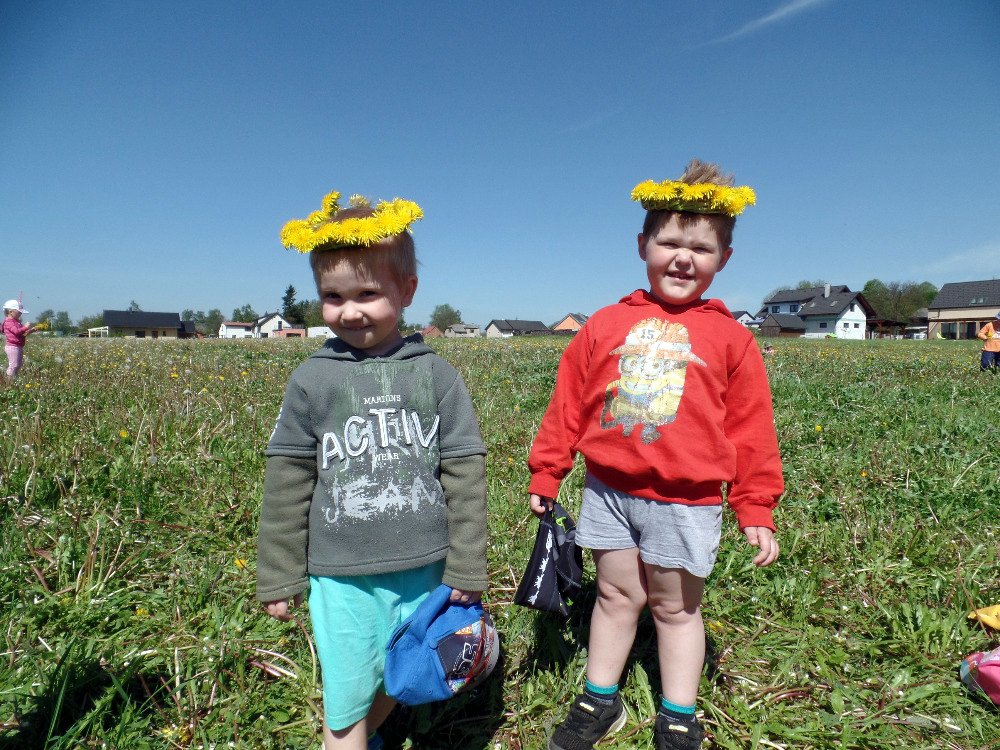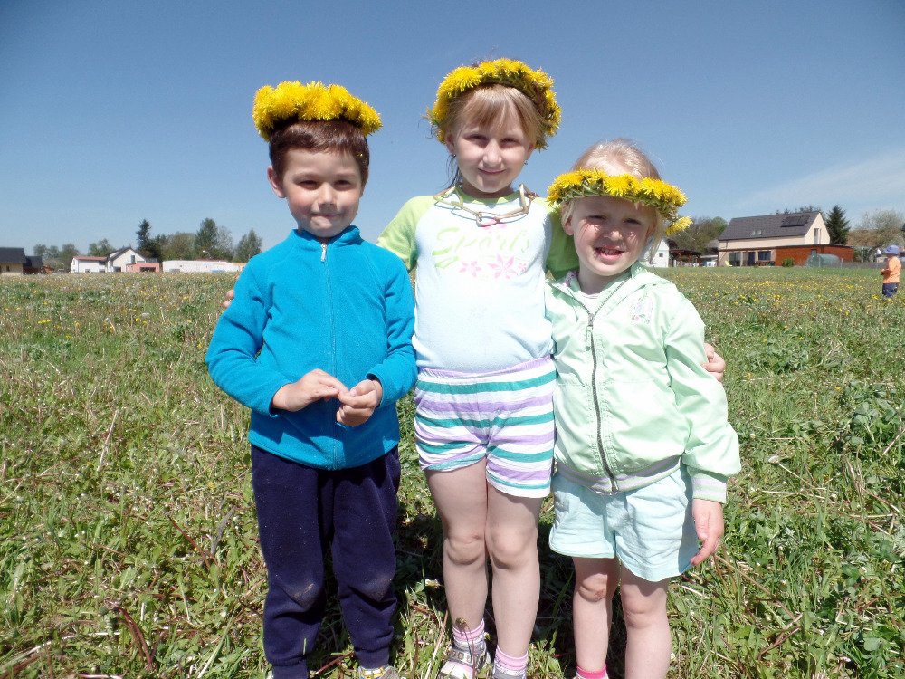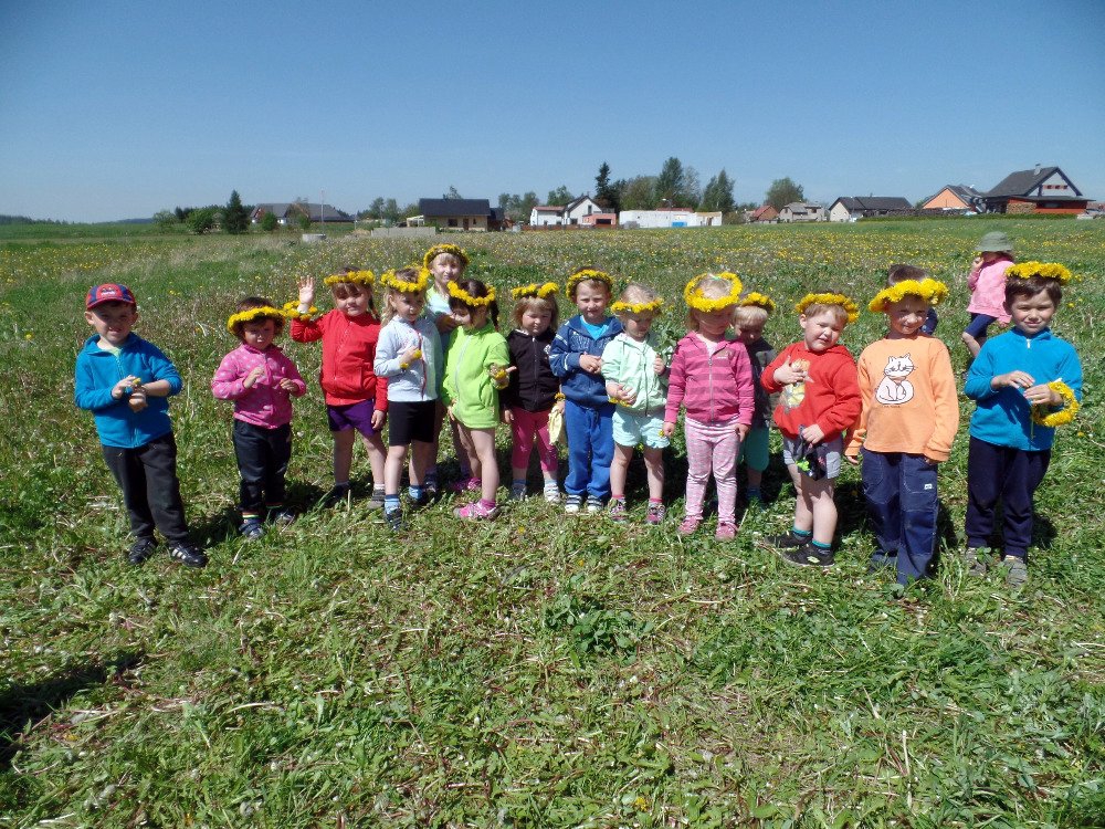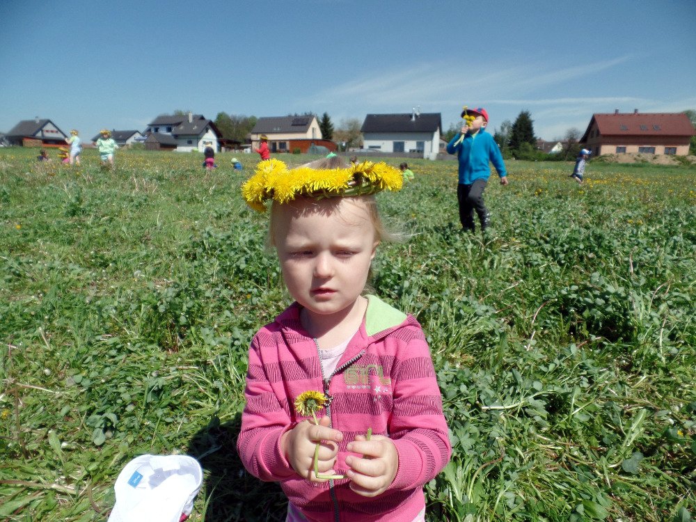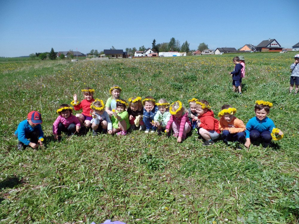 Ve čtvrtek 18.5. jsme vyrazili s dětmi na pampeliškovou louku plést věnečky, řetízky, náramky, prstýnky. Děti trhaly pampelišky a paní učitelky pletly a pletly. Starší holčičky už zkoušely plést samy. Děti, které nechtěly věnečky, si na louce hrály různé hry a vydupávaly cestičky a domečky v trávě.