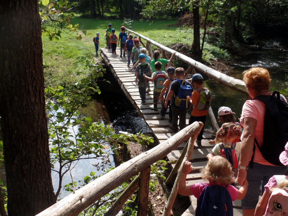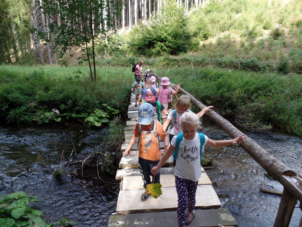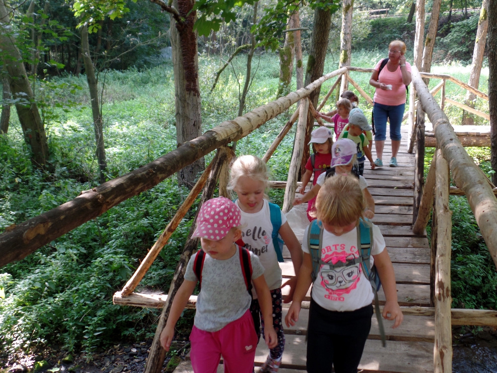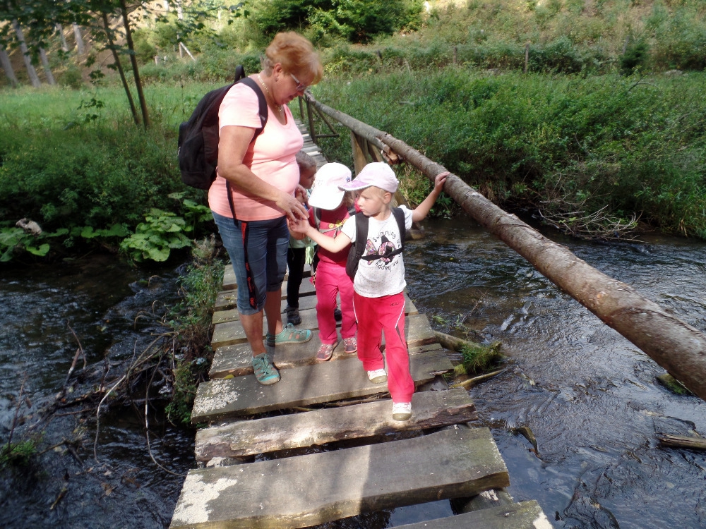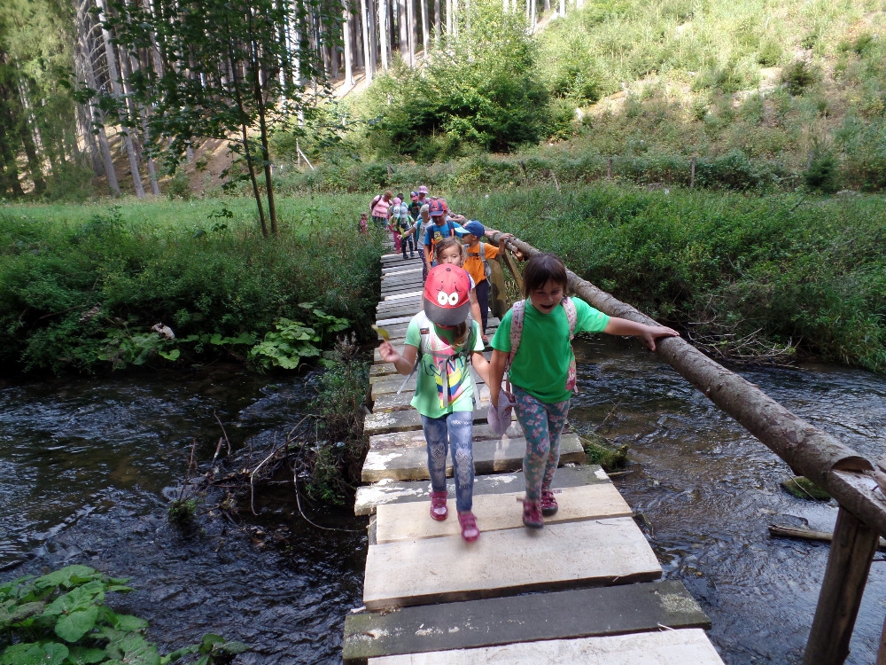 Cestou jsme si udělali zastávku na svačinku, kterou nám připravila paní kuchařka. Zvířátka v oboře se nám přišla ukázat až k plotu, podívaná na ně byla velkolepá. Nechala se dětmi nerušeně krmit kaštany, listy a travou a tak jsme u obory vydrželi dosti dlouho.Pak jsme pokračovali přes louky do Maršova, kde jsme pro změnu obdivovali domácí zvířectvo. Maršovským údolím jsme prošli až k autobusové zastávce ve Velkých Petrovicích. Cesta vede lesem podél řeky Metuje, je příjemná a pro děti zajímavá. Naše děti hnala vpřed motivace čtyř dřevěných lávek přes řeku. Užili jsme si spoustu chvil pozorováním přírodních krás a zajímavostí. Čas, který jsme věnovali zvířátkům nám ke konci cesty chyběl a tak jsme si museli trochu přispíšit, abychom stihli autobus.