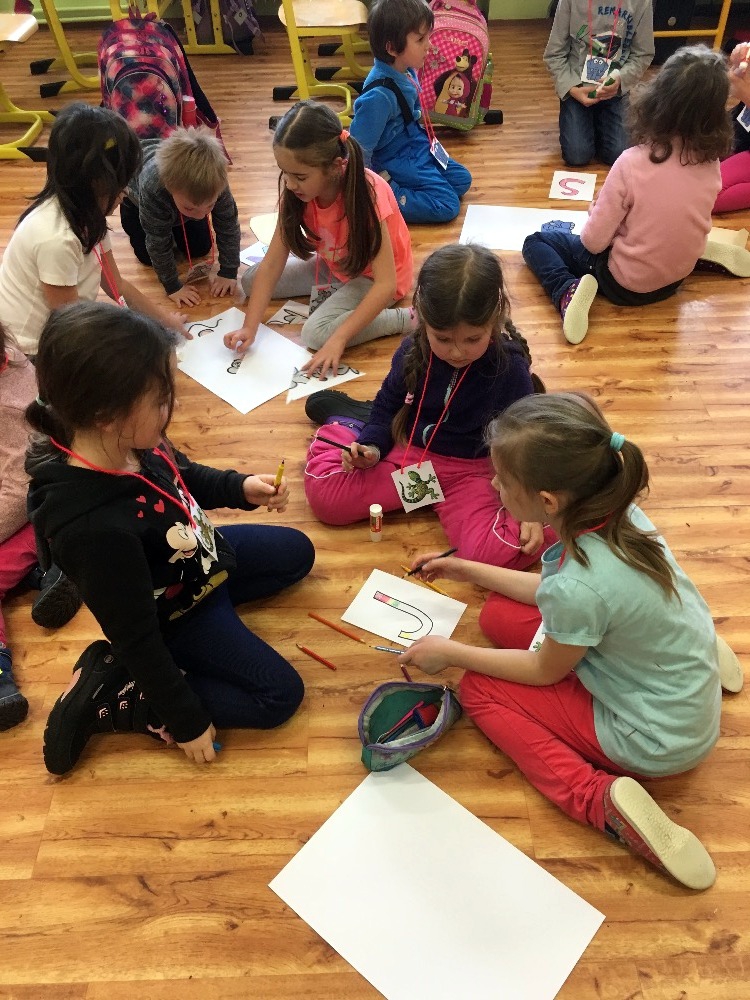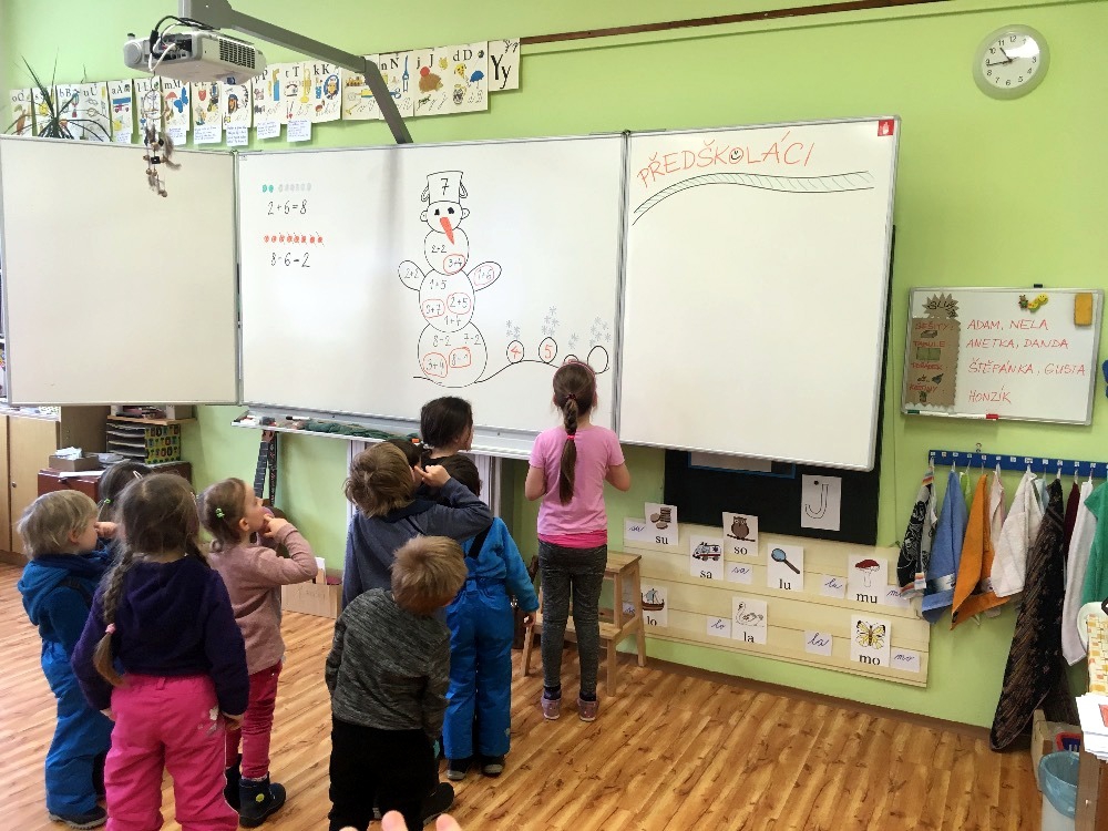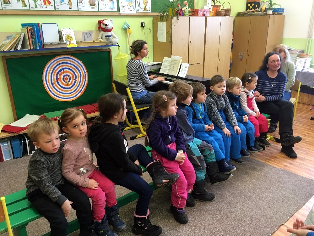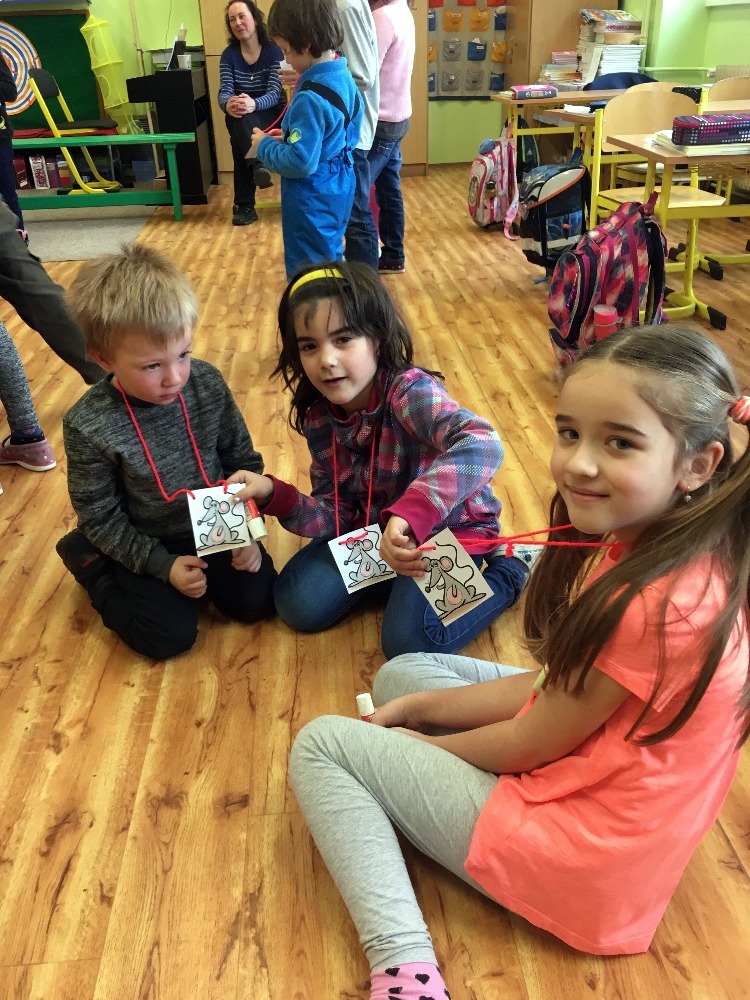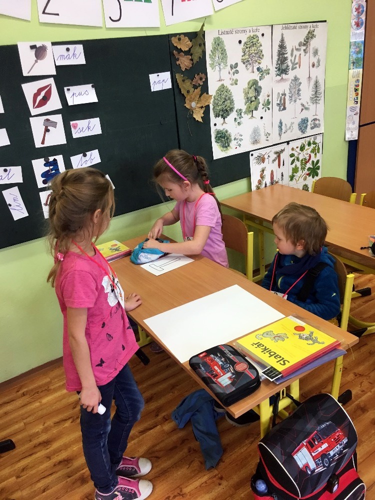 Ukázali nám, jak už se naučili číst a počítat. Zazpívali nám. Společně jsme hledali písmenko a skládali obrázek zvířátka. Na památku jsme dostali drobné dárečky. Děkujeme.