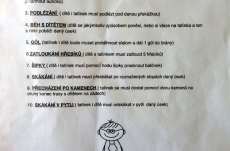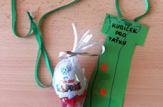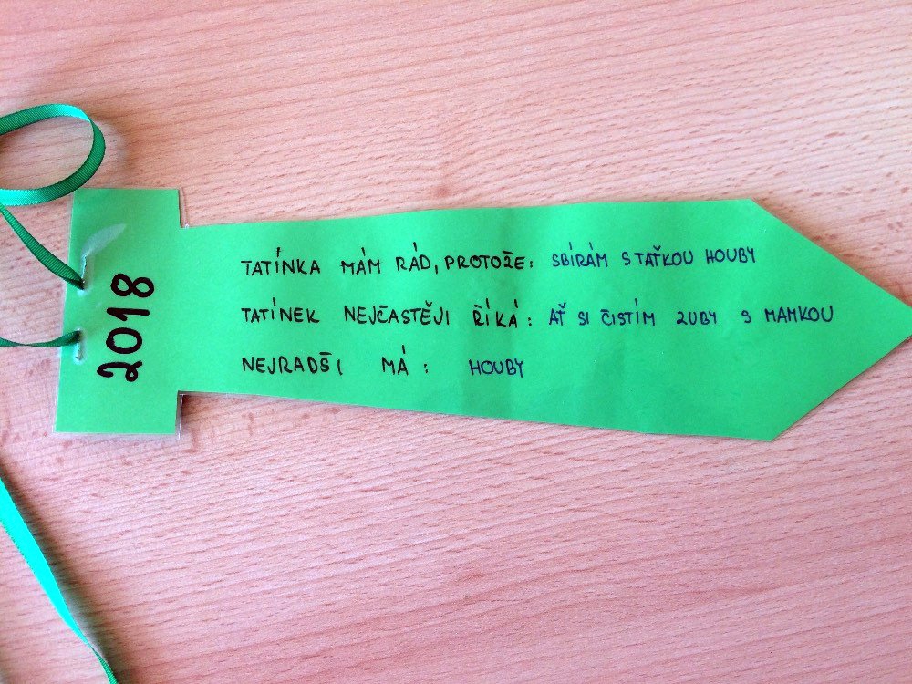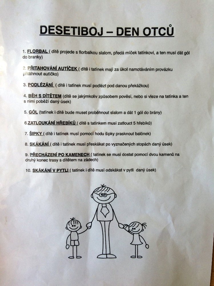 Účast byla stoprocentní. Soutěžní klání - desetiboj přišli podpořit i ostatní rodinní příslušníci. Soutěžilo se ve dvojicích tatínek - dítě v různých disciplínách: florbal, přitahování autíček, podlézání, běh s dítětem, gól, zatloukání hřebíků, šipky, skákání, přecházení po kamenech, skákání v pytli. Určitě si to všichni užili, včetně přihlížejících. Snaha tatínků, aby se také maminky zapojily do soutěží, vyšla naprázdno. Papírová kravata, kterou tatínkové dostali za odměnu od dětí, všem moc slušela, a zároveň se na ní něco vtipného dočetli. Povídalo a opékalo se dlouho do večera. Děkujeme manželům Haitlovým za pomoc při přípravě akce a sponzorský dar v podobě basy piva. Maminkám předškoláků díky za výborné pohoštění. Prožili jsme společně pěkné odpoledne.