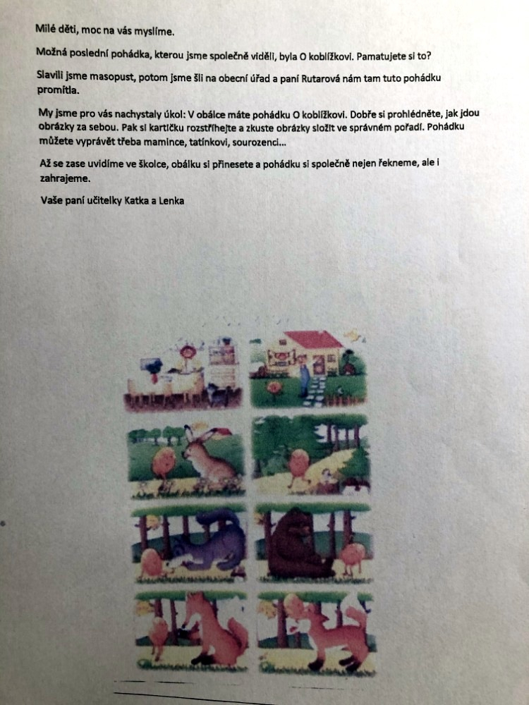 Rok s rokem se sešel a máme tu opět zavřenou školku. Loni to pro nás byla nová neznámá situace. Letos už víme více, jak do toho. Předškolákům jsme povinny zajistit distanční výuku. Nechceme ztratit kontakt ani s mladšími dětmi.
