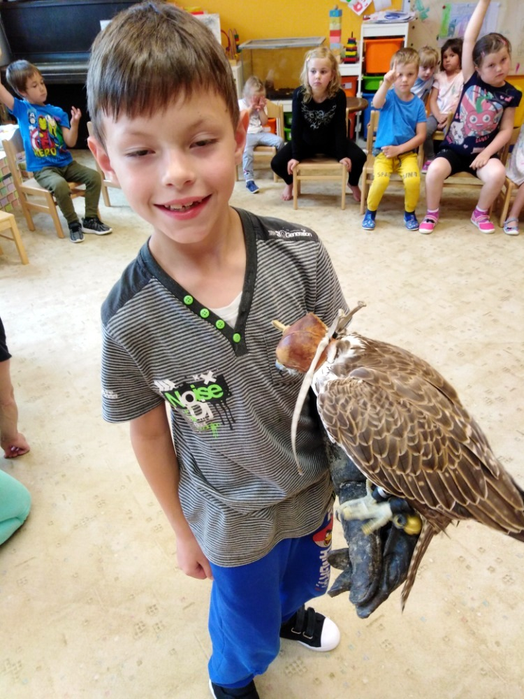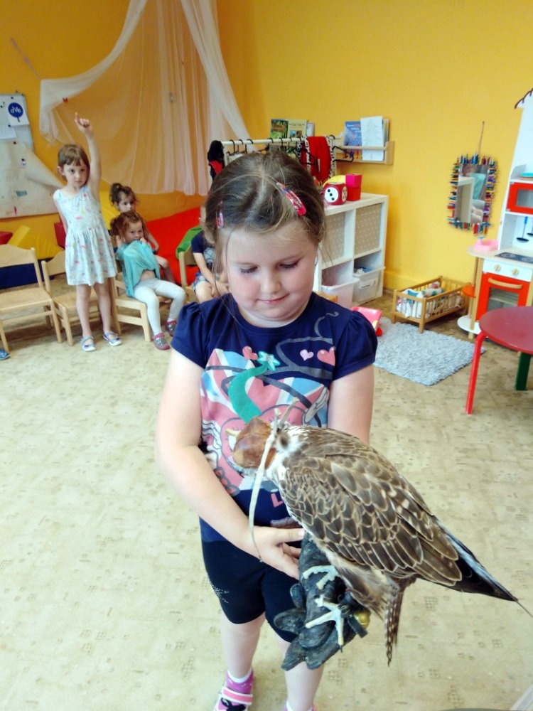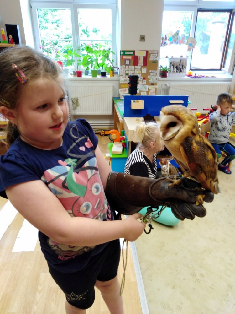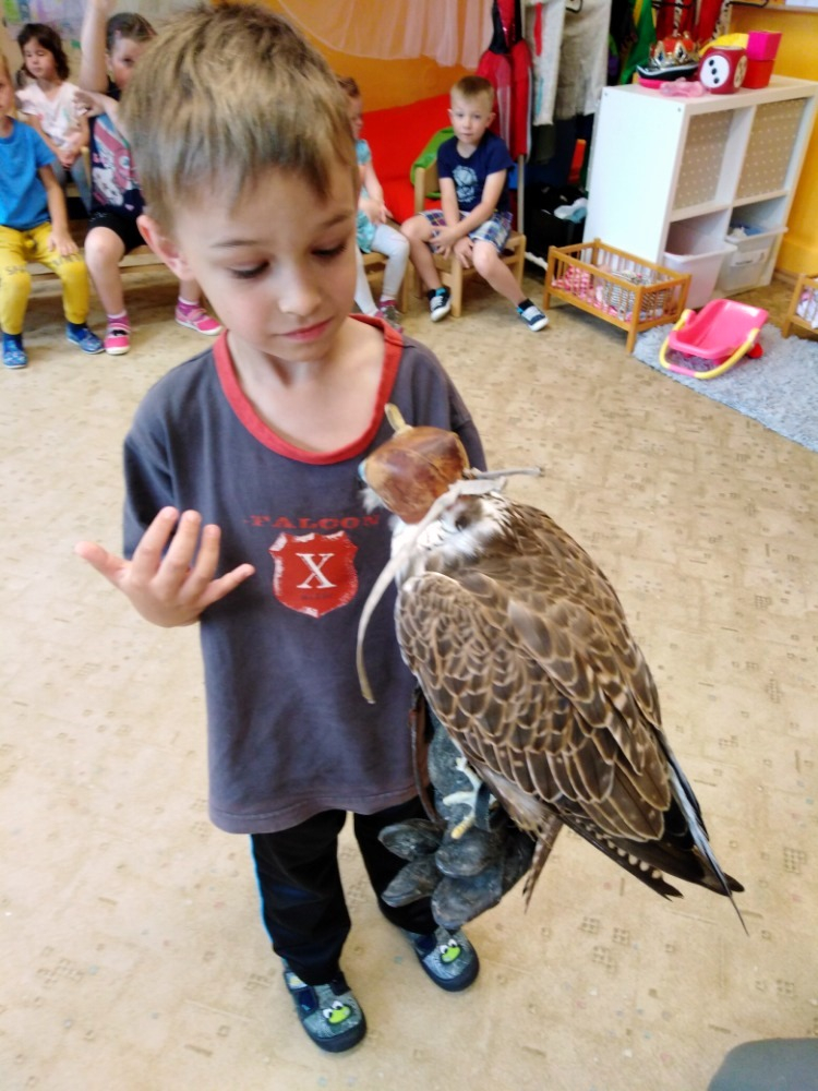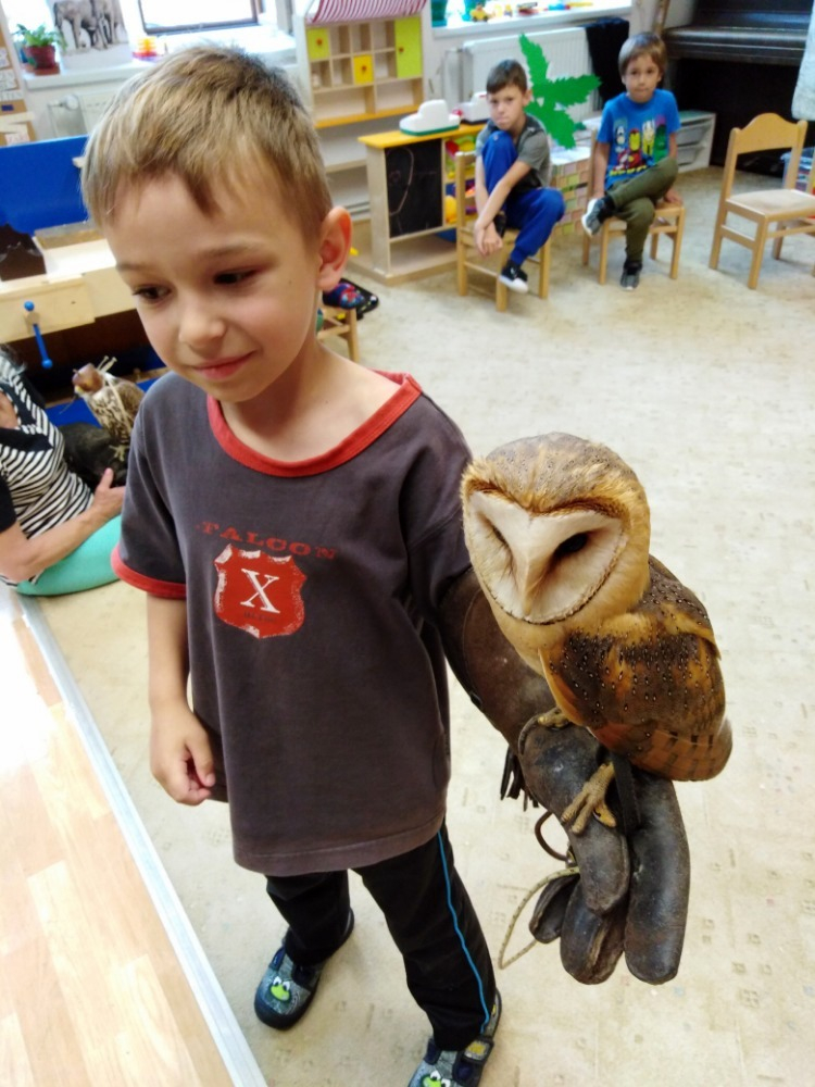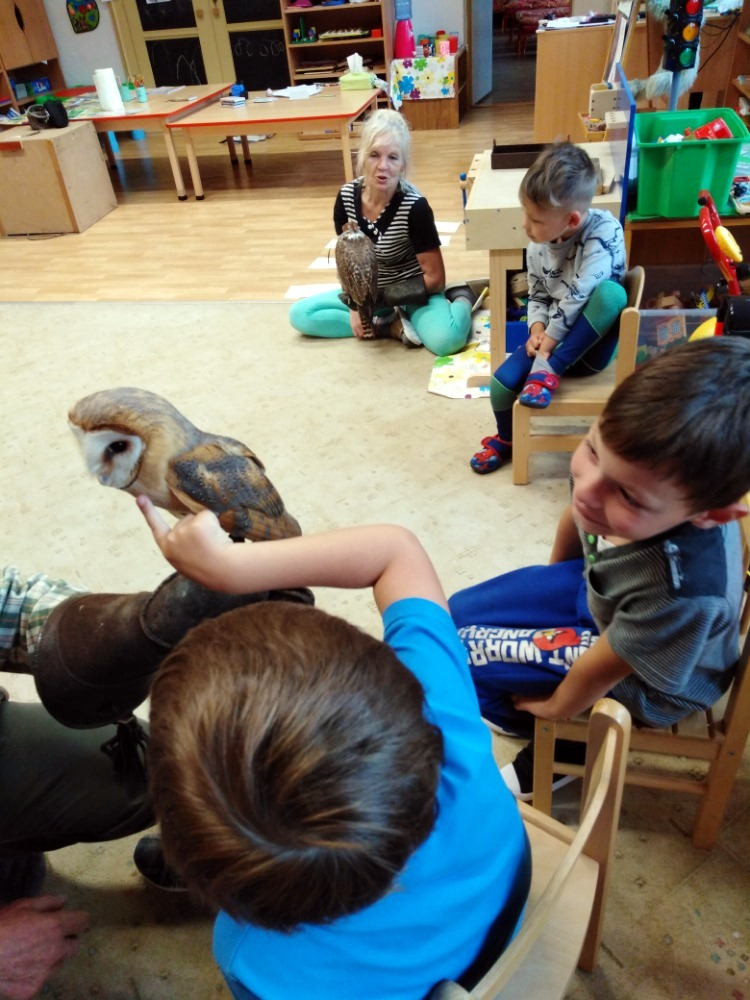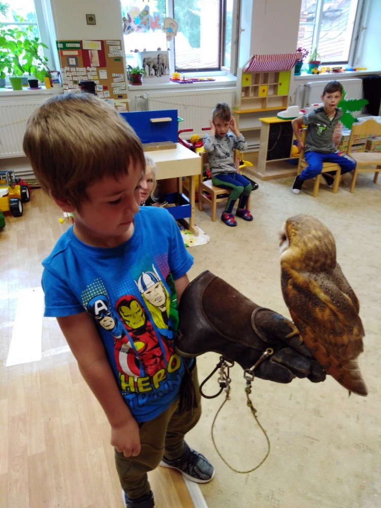 Ve školce nás navštívili sokolníci z ekocentra Dotkni se křídel. Pro děti to byl pěkný zážitek vidět dravce a sovy v živém kontaktu. Dozvěděly se i zajímavosti z jejich života, např. čím se živí, jak rychle létají... Kdo se nebál, mohl si některé z nich podržet a pohladit.