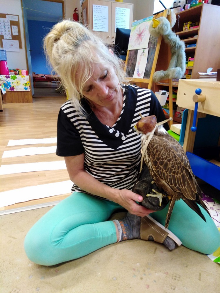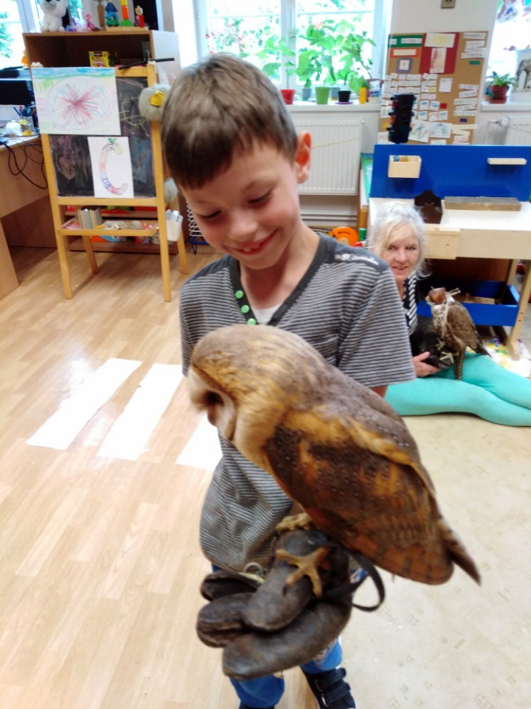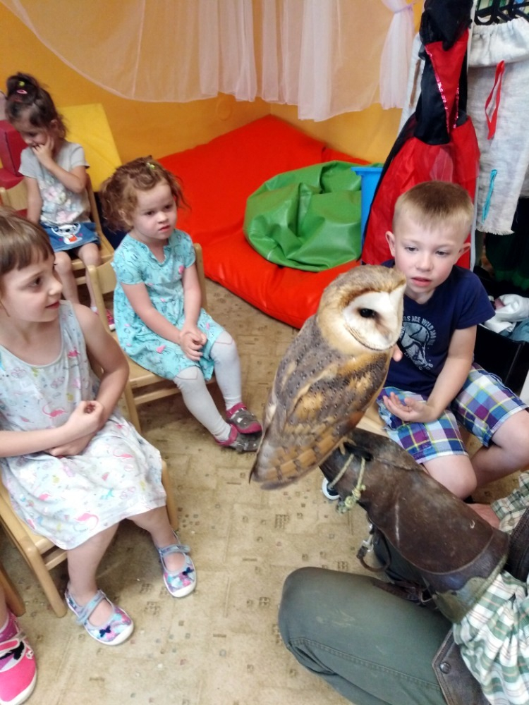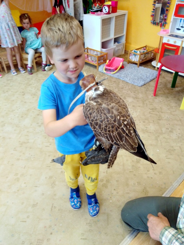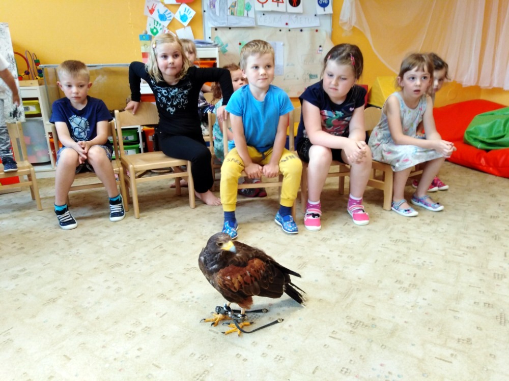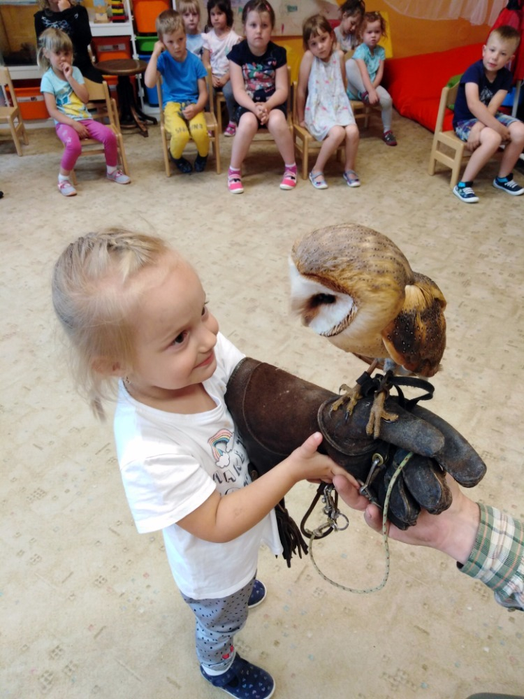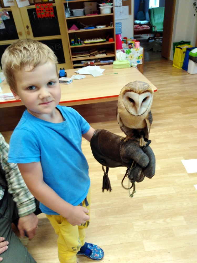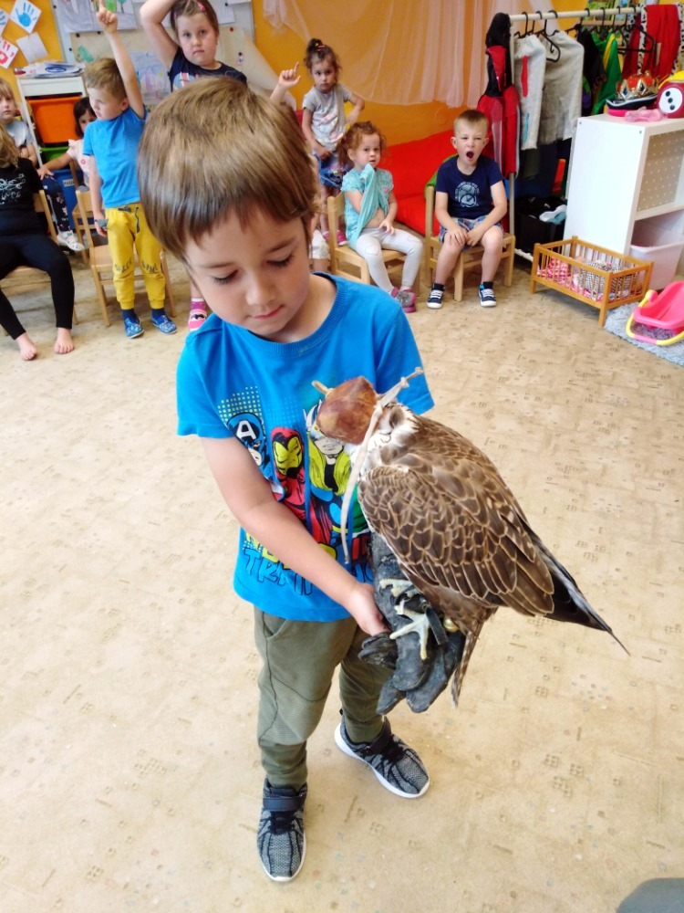 Ve školce nás navštívili sokolníci z ekocentra Dotkni se křídel. Pro děti to byl pěkný zážitek vidět dravce a sovy v živém kontaktu. Dozvěděly se i zajímavosti z jejich života, např. čím se živí, jak rychle létají... Kdo se nebál, mohl si některé z nich podržet a pohladit.
