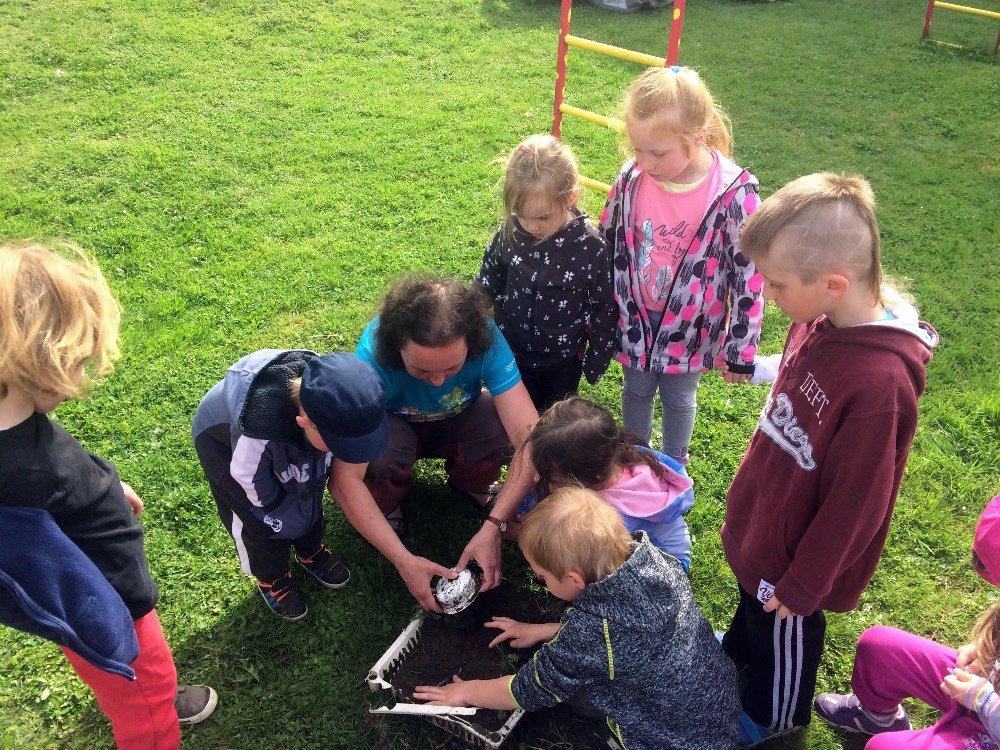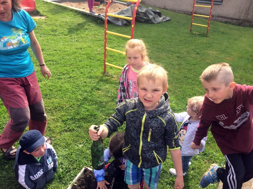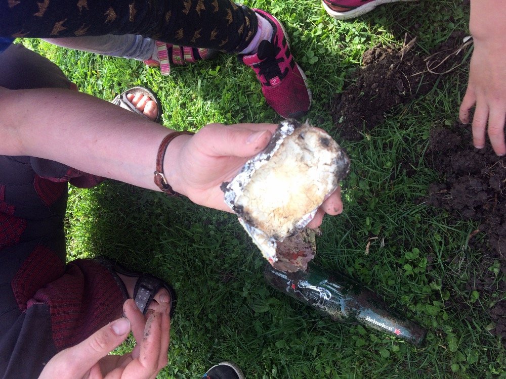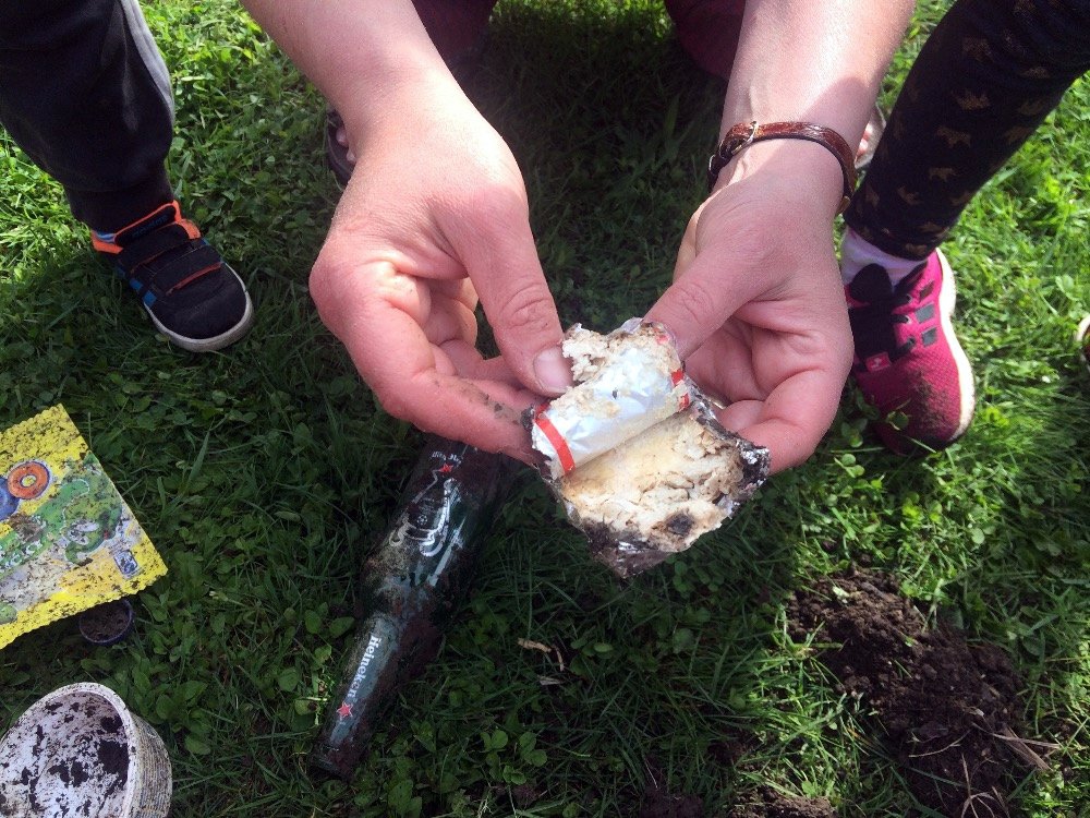v přírodě, a po uplynutí jednoho roku zjistit, v jakém stavu rozkladu se nacházejí. Nález to byl zajímavý. Něco úplně zmizelo a něco jsme vyhrabali zcela neporušené. Totálně se rozložil biologický odpad (banán, chléb, citrón). Nenašli jsme ani noviny a pytlík s čajem. Naopak sáček od bonbonů, plastová nádoba, plastové víčko a skleněná lahev zůstaly celé. Překvapivě neporušený, i když už trochu zapáchající byl také tavený sýr. Teď už víme, proč chránit přírodu a třídit odpad.