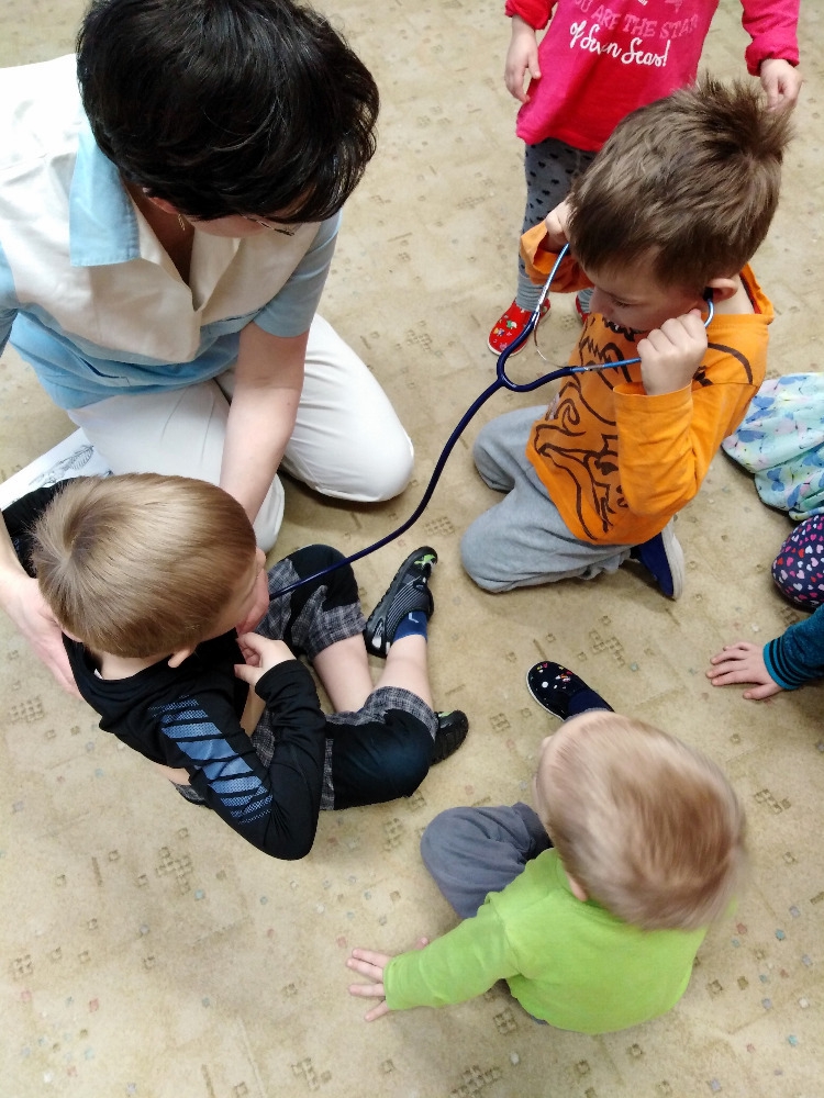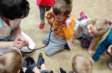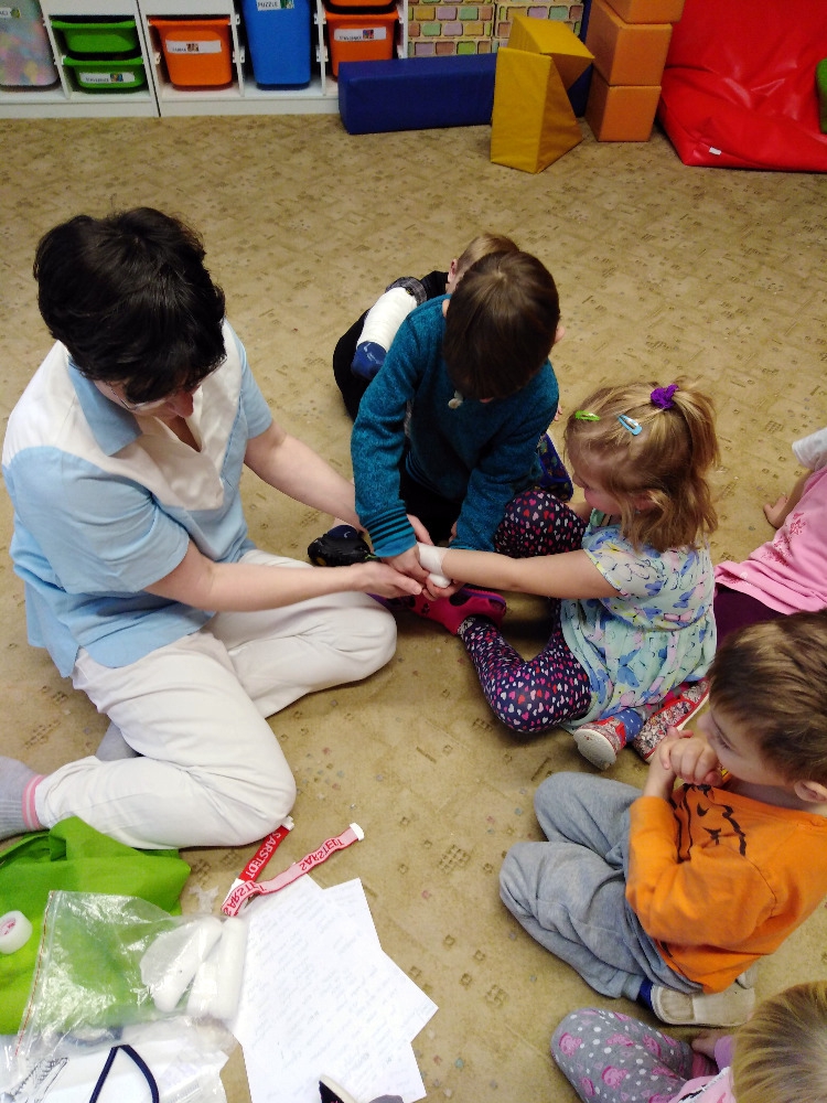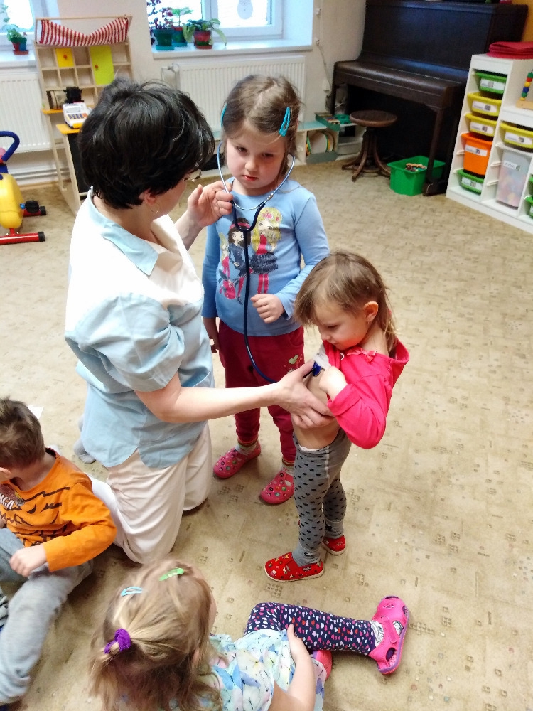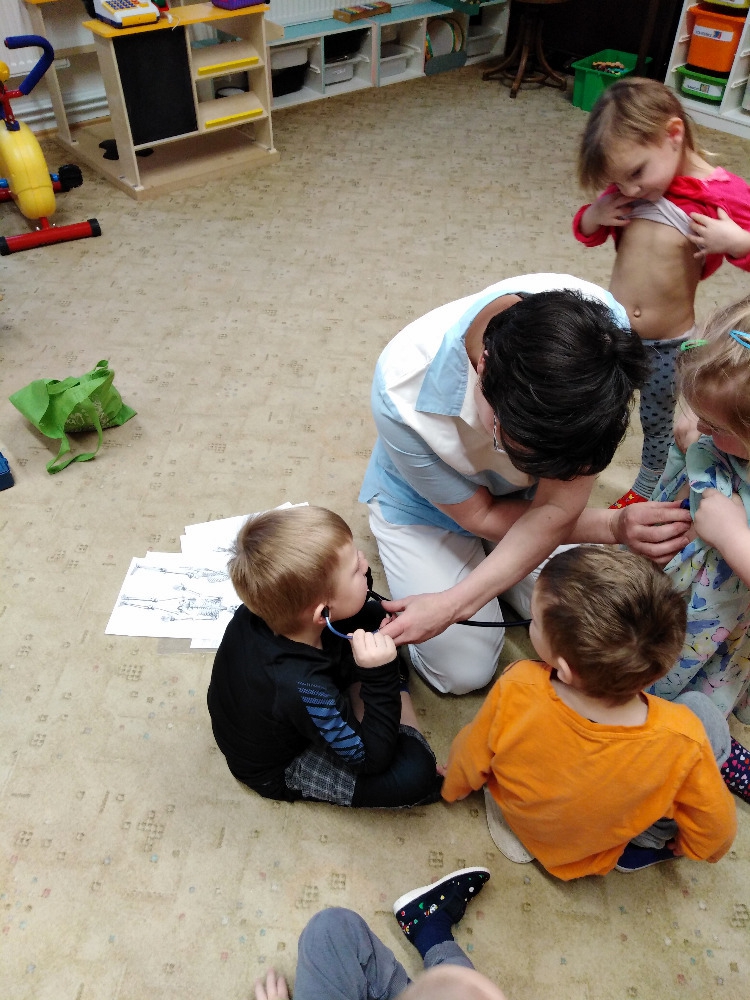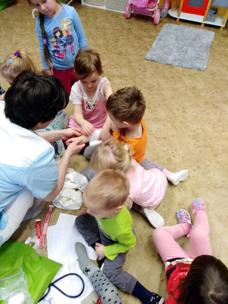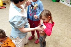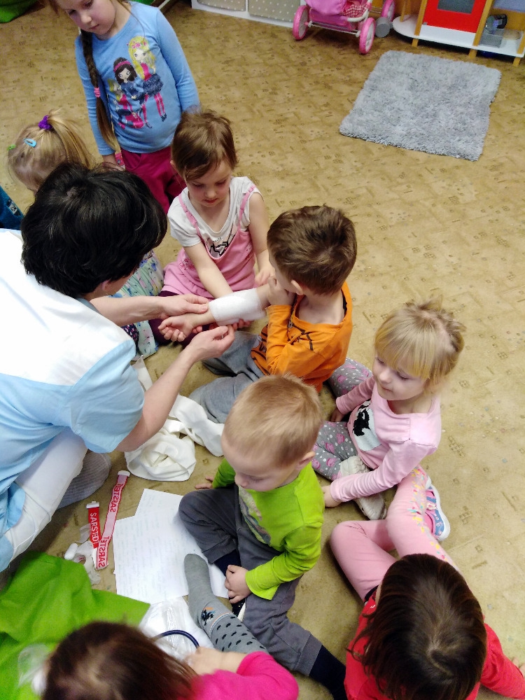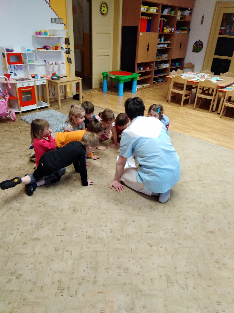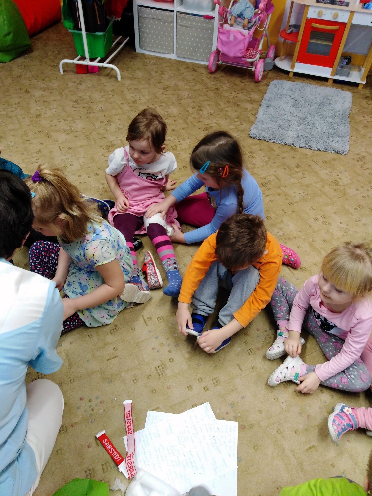 Ve školce proběhla beseda se zdravotní sestrou. Děti získaly informace o lidském těle, dozvěděly se, jak se odebírá krev, jak poskytnout první pomoc. Poslouchaly srdíčko a vzájemně se obvazovaly.
