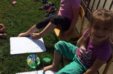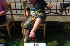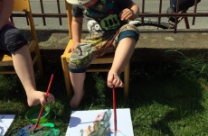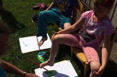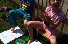 Děti si vyzkoušely trochu netradiční malbu temperovými barvami. Uchopily štětec mezi prsty na noze a malovali pouze nohou.