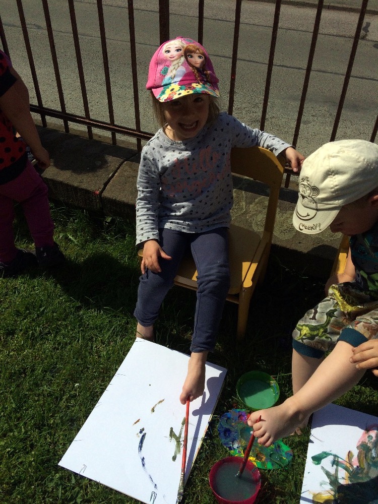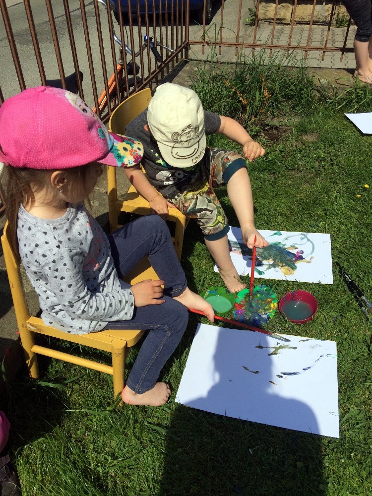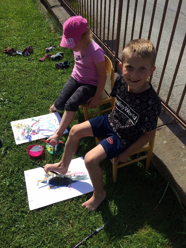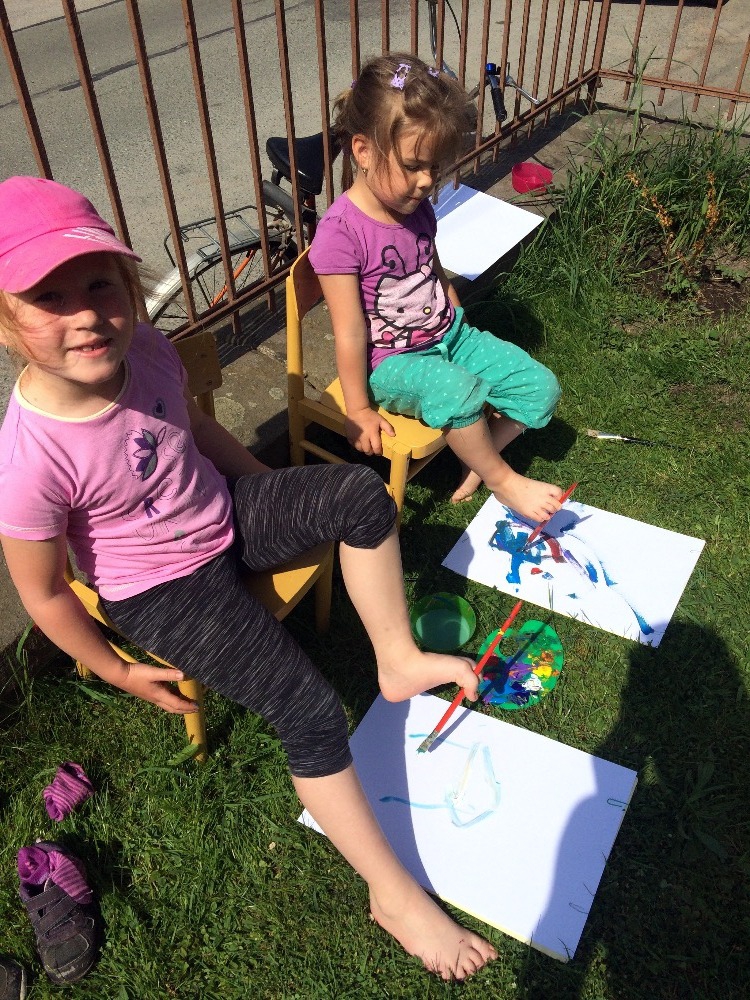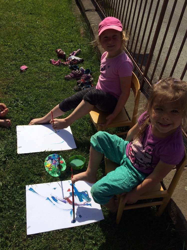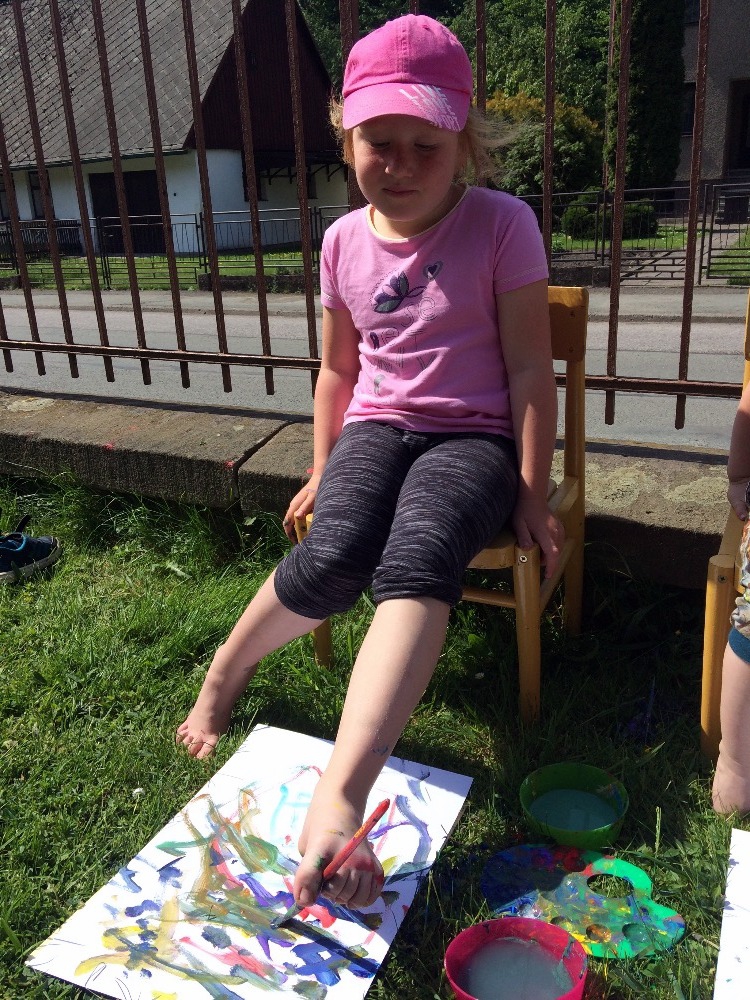 Díky pěknému počasí jsme mohli malování udělat na zahradě. Přeci jen tato technika vede k většímu zašpinění. Vzpomněli jsme při tom i na to, jak jsme si vyprávěli o paraolympiádě a postižených lidech.