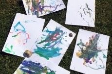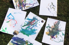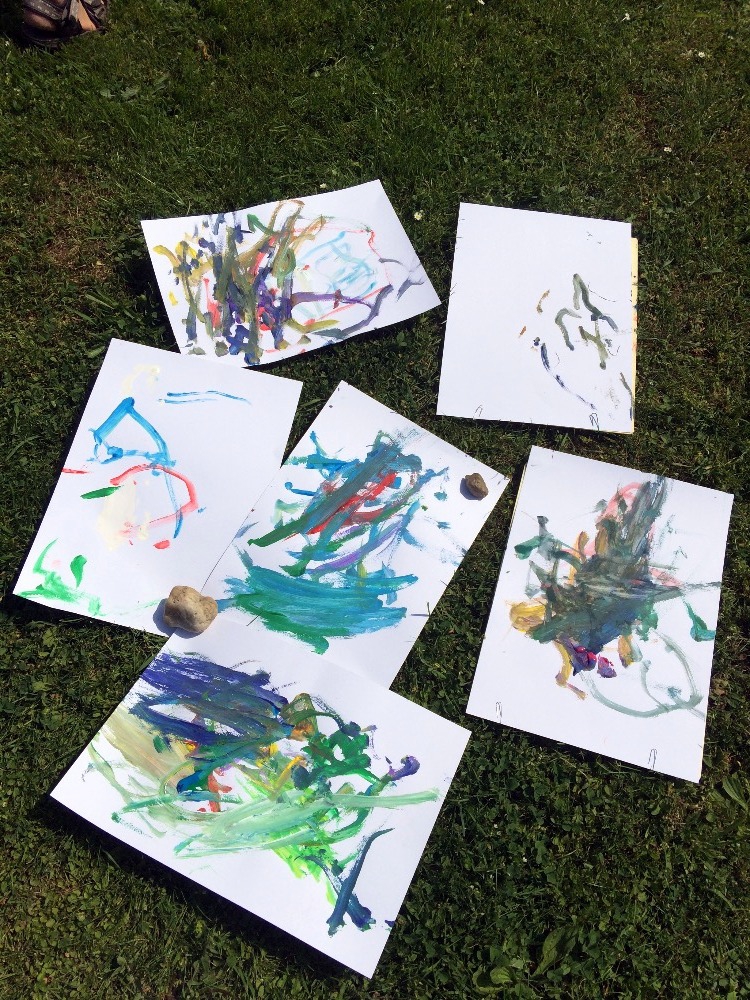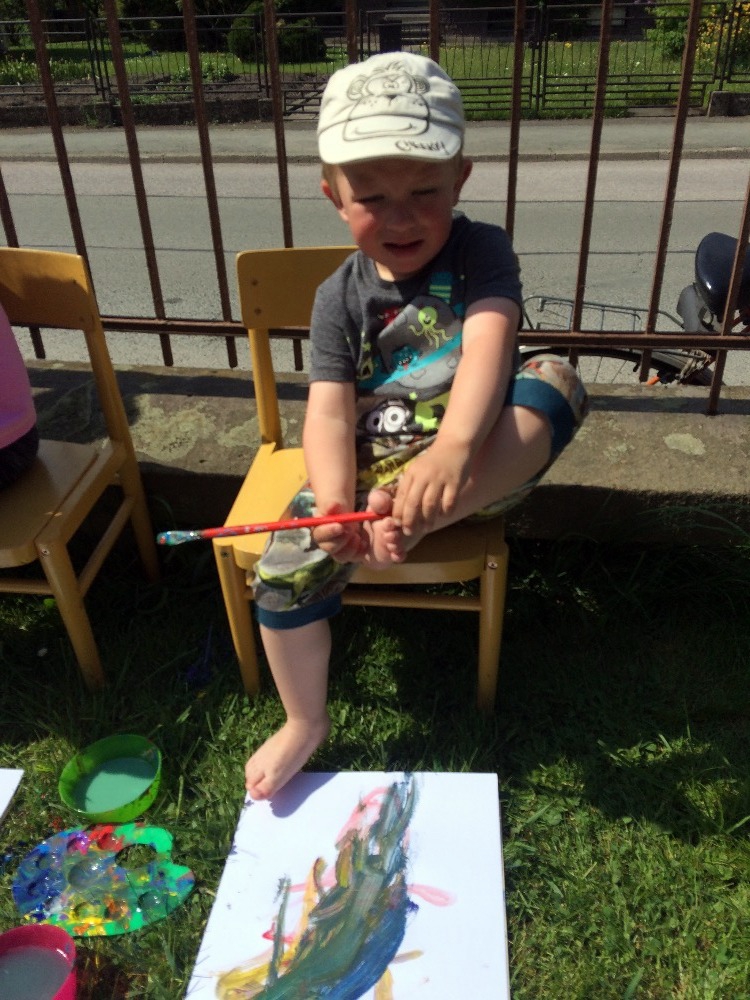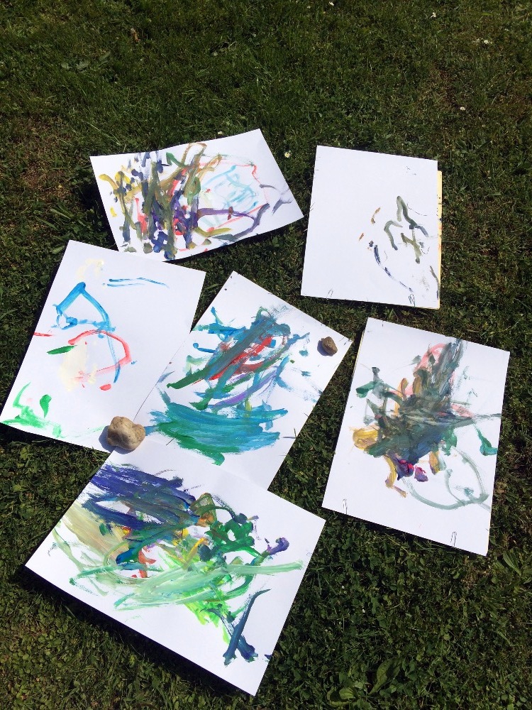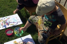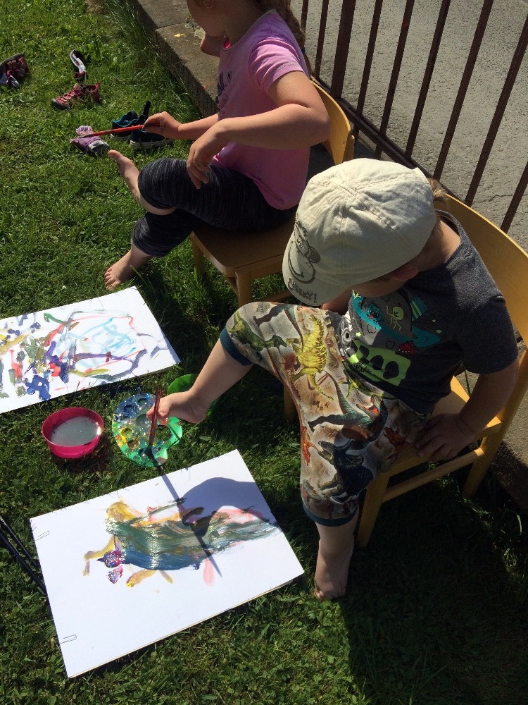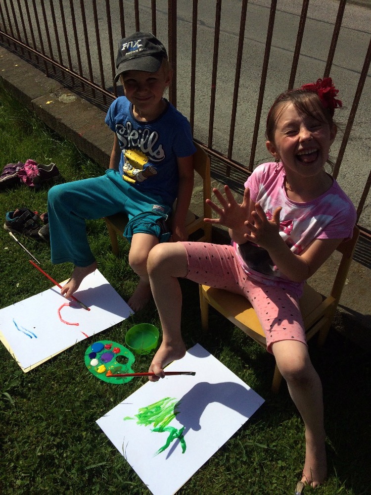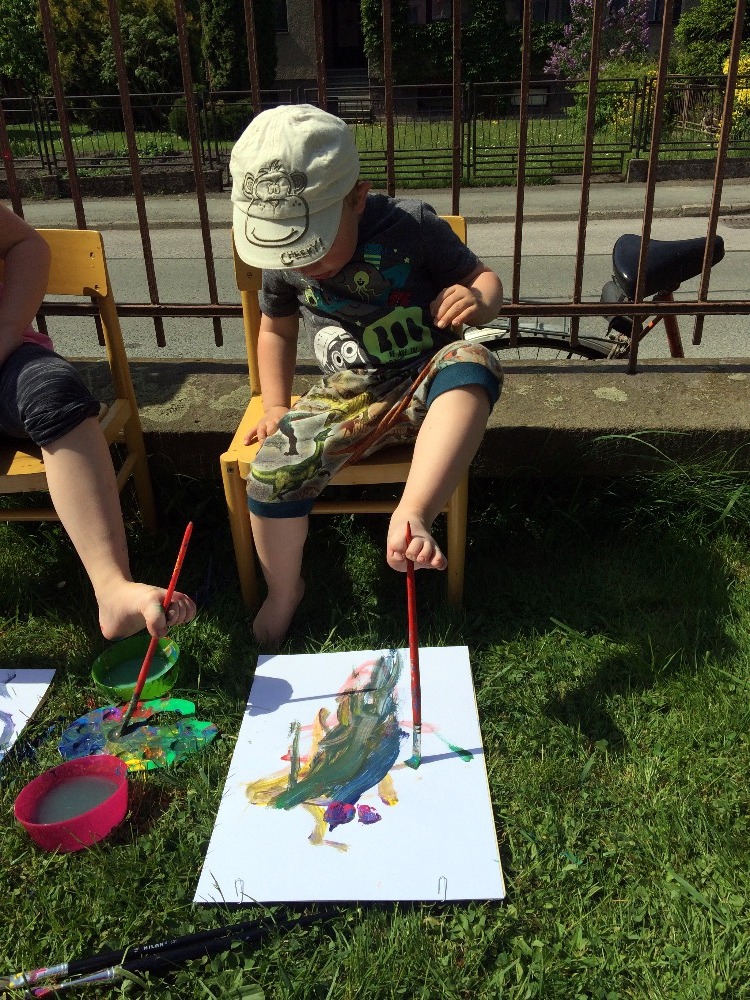 Díky pěknému počasí jsme mohli malování udělat na zahradě. Přeci jen tato technika vede k většímu zašpinění. Vzpomněli jsme při tom i na to, jak jsme si vyprávěli o paraolympiádě a postižených lidech.