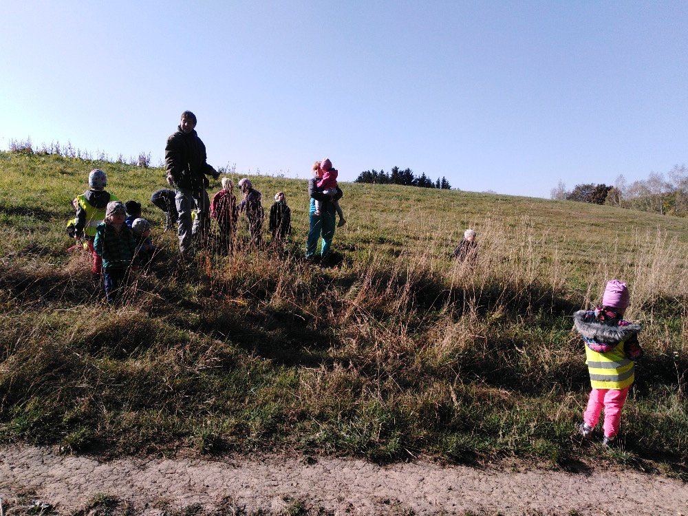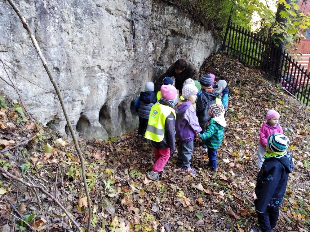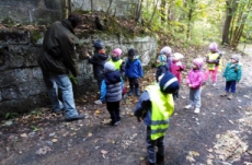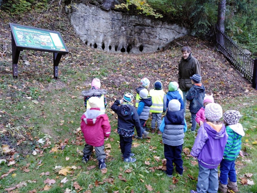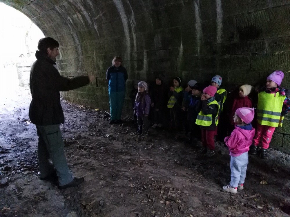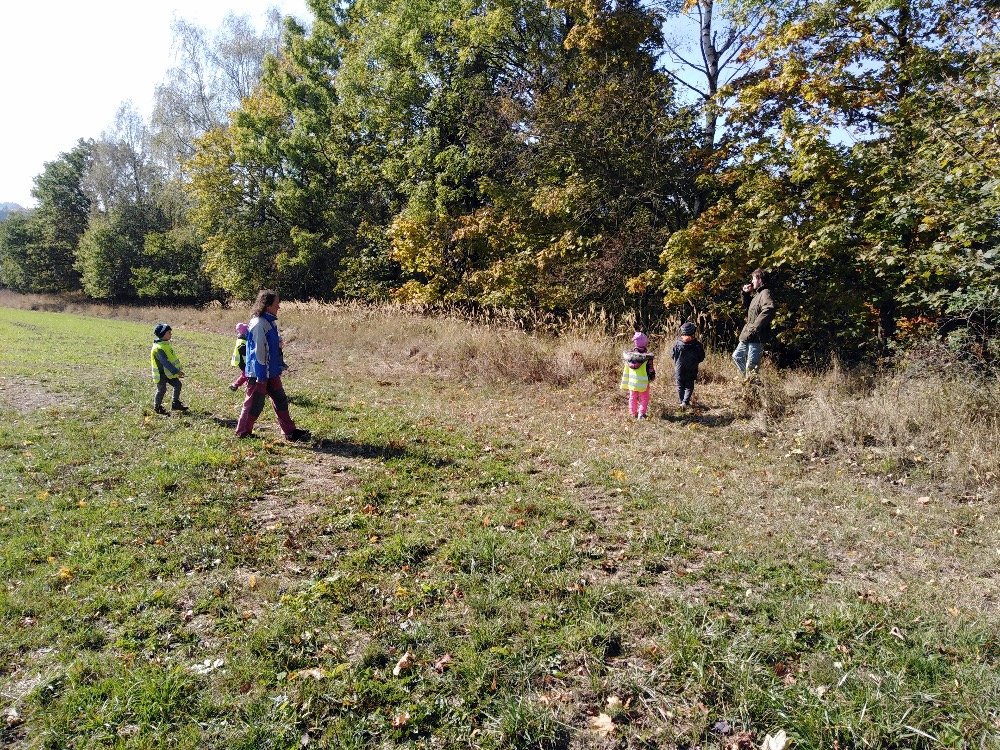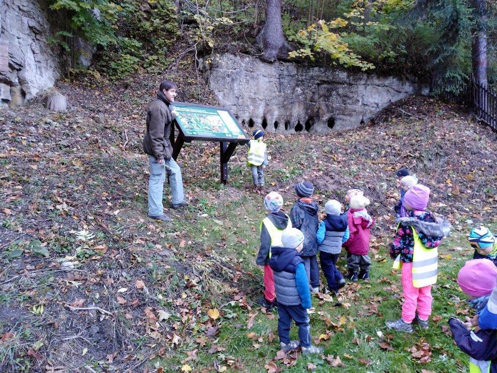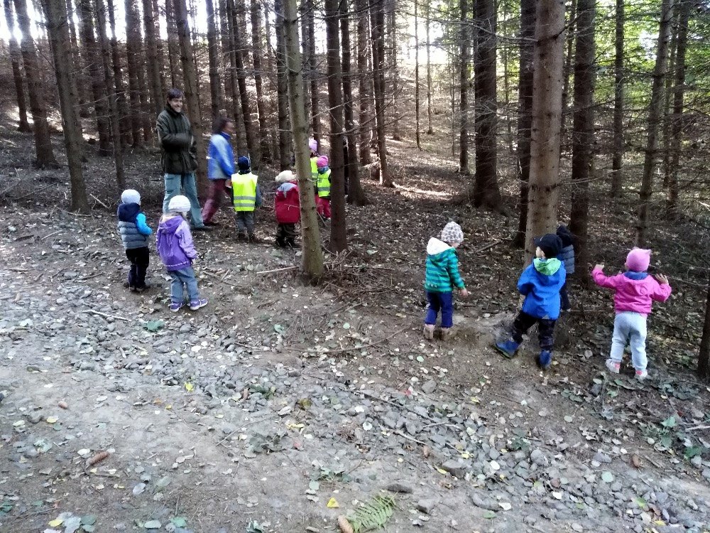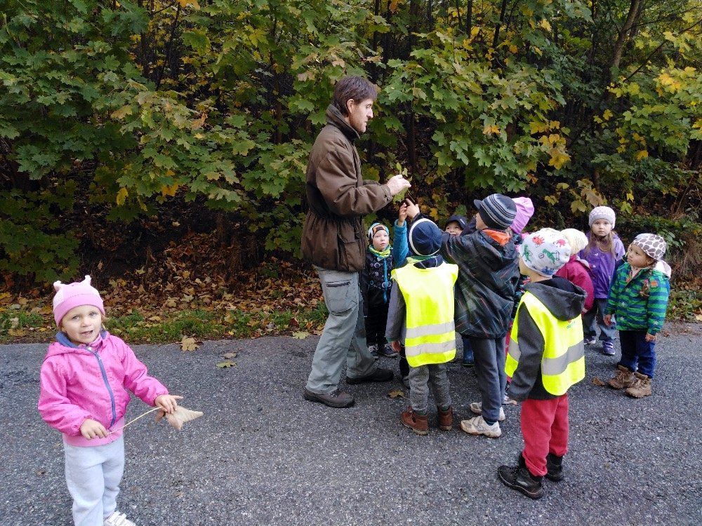 Potom přijel pan Koppl ze Správy CHKO Broumovsko. Strávil s námi celou vycházku. Cestou přírodou jsme se zastavili u vzácného metujského skalního útvaru - pískovcových sloupků. V tunelu jsme poslouchali zvuky ptáků a také jsme si o nich povídali. V lese jsme si ukazovali stromy a na louce jsme si prohlíželi stopy po divočácích. Stejně jako dění ve školce, tak i příroda je pestrá, zvláště teď na podzim.