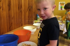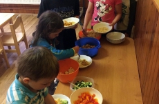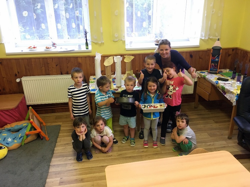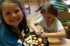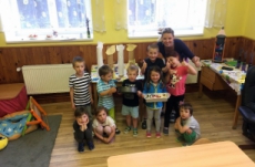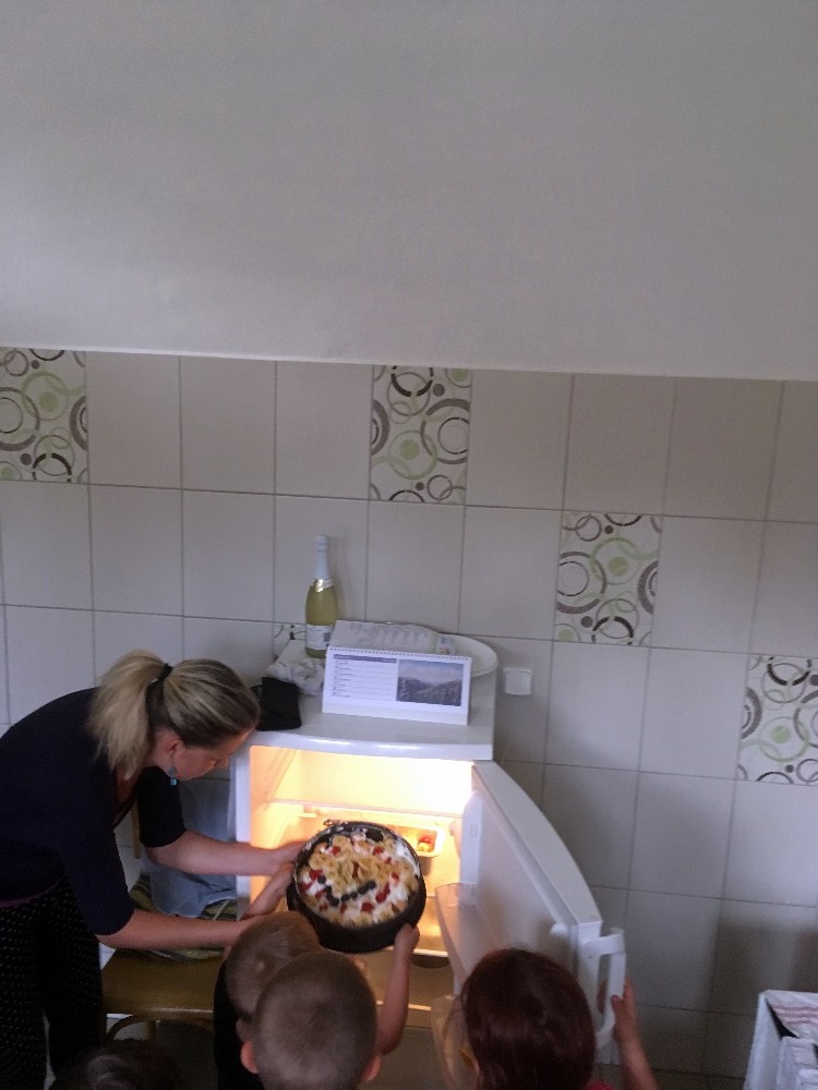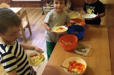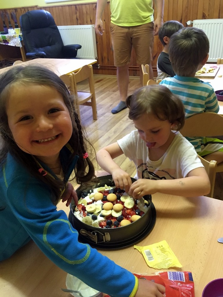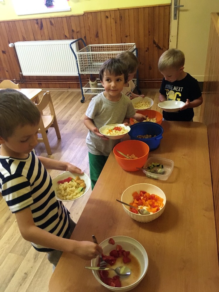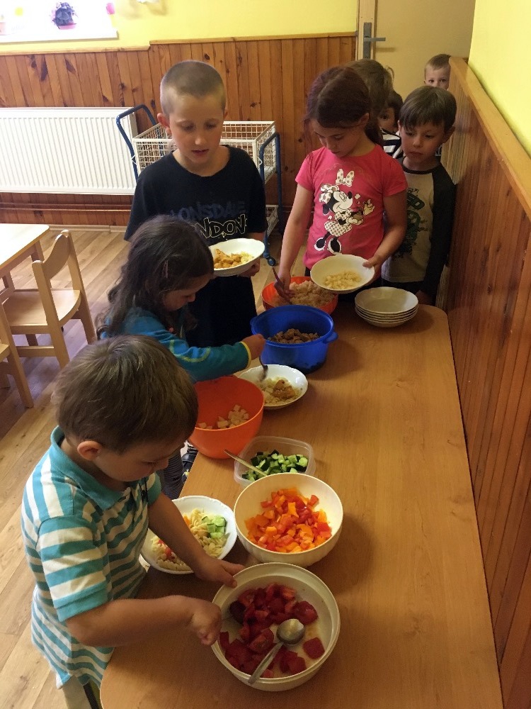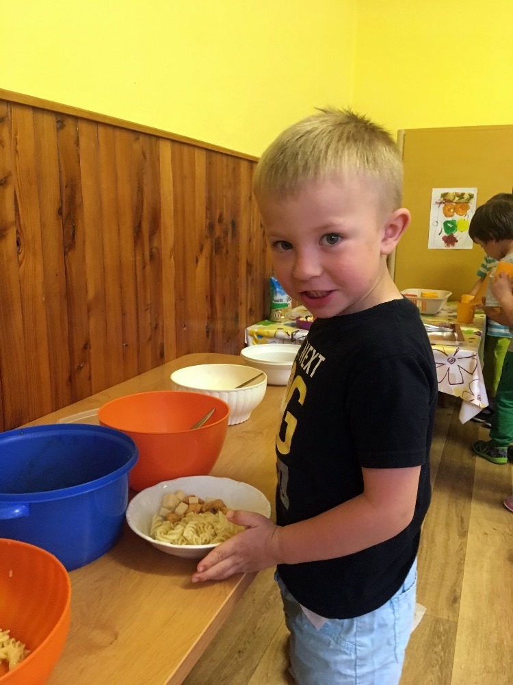 Dopoledne se děti učily nakupovat. Každá ze tří skupinek byla vyslána s penězi a se seznamem doplněným obrázky potravin do jiného obchodu. Z nakoupených potravin jsme si pak připravili k večeři těstovinový salát s kuřecím masem. Ráno jsme si pochutnali na piškotovém dortu s ovocem.