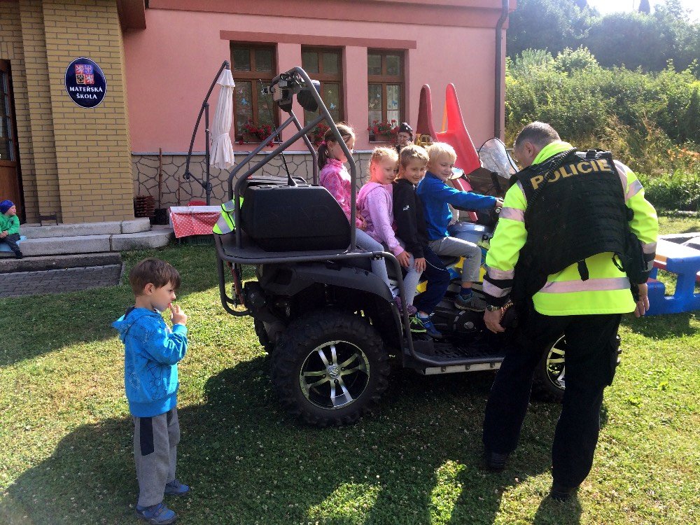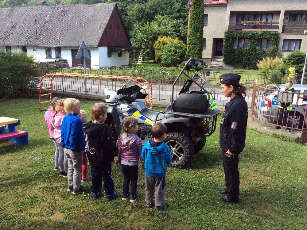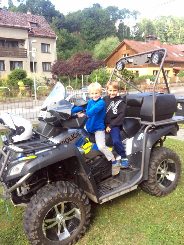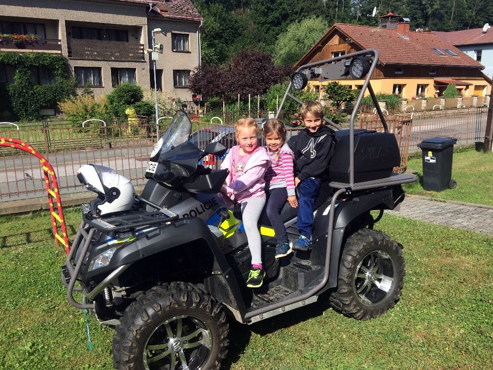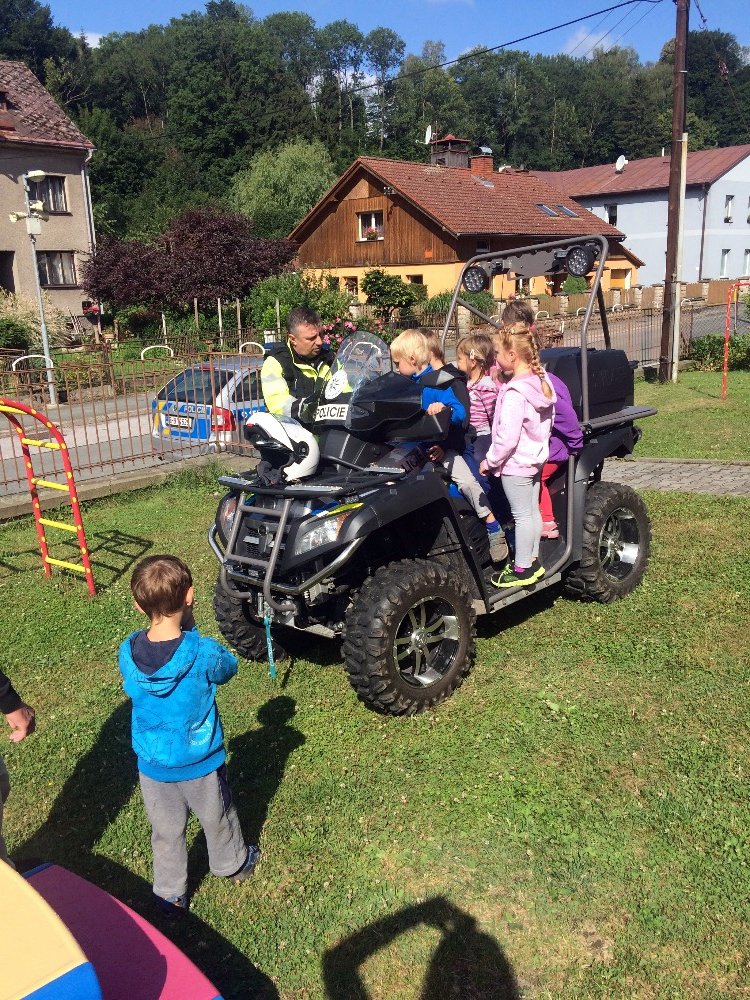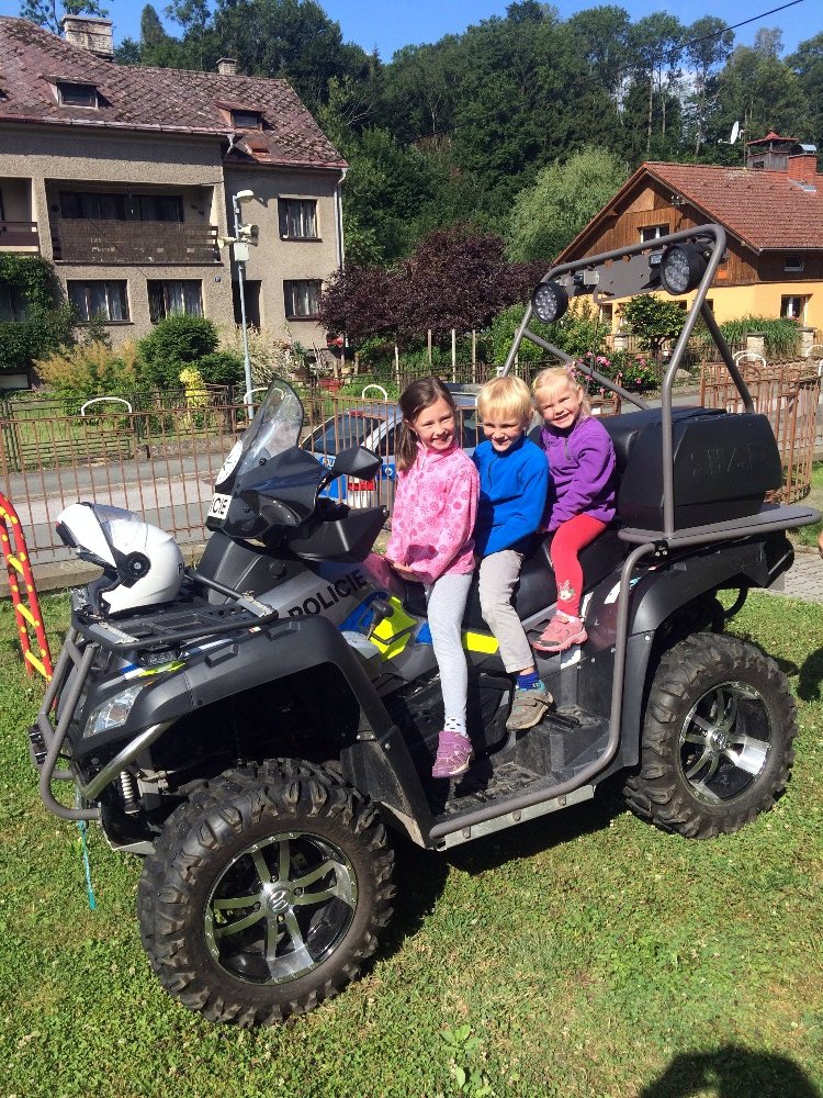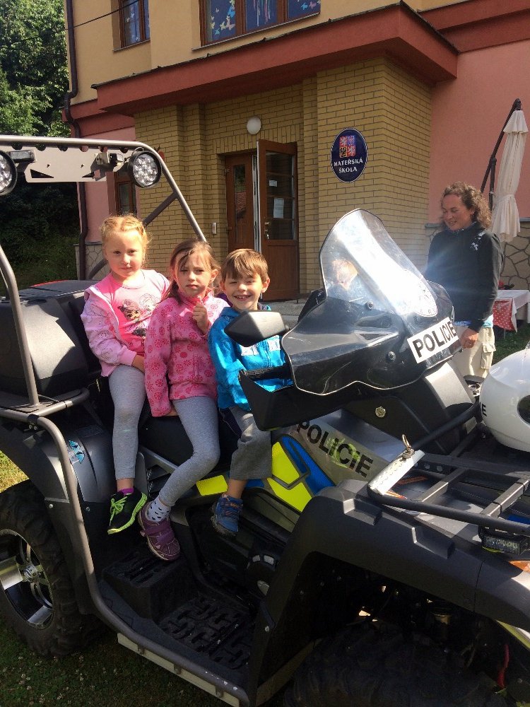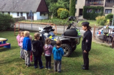 V červnu naši školku navštívili policisté. S krásnou policejní čtyřkolkou zajeli až na naši zahradu.