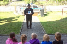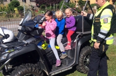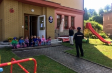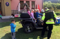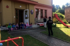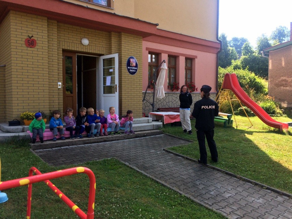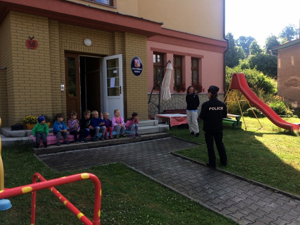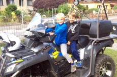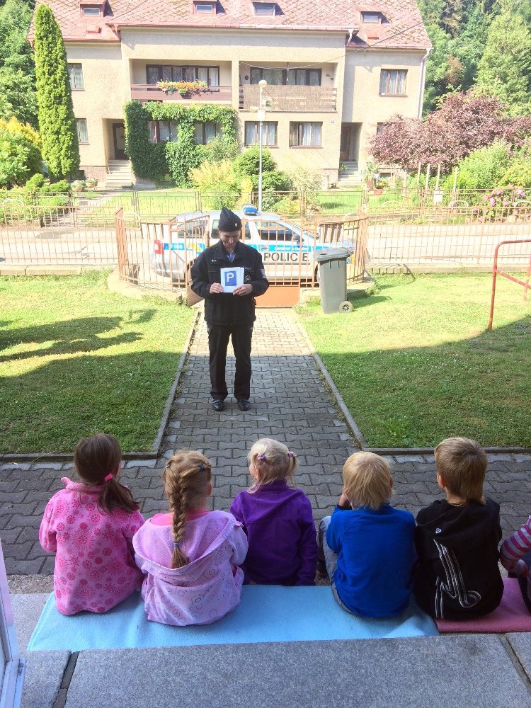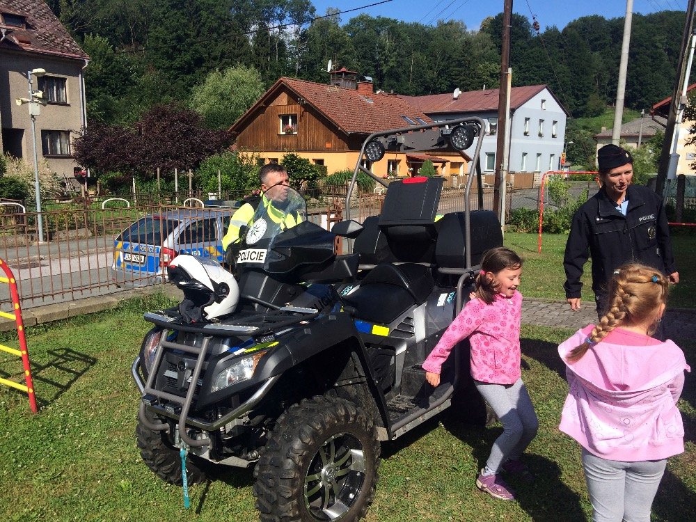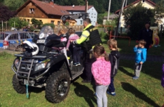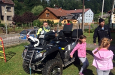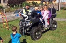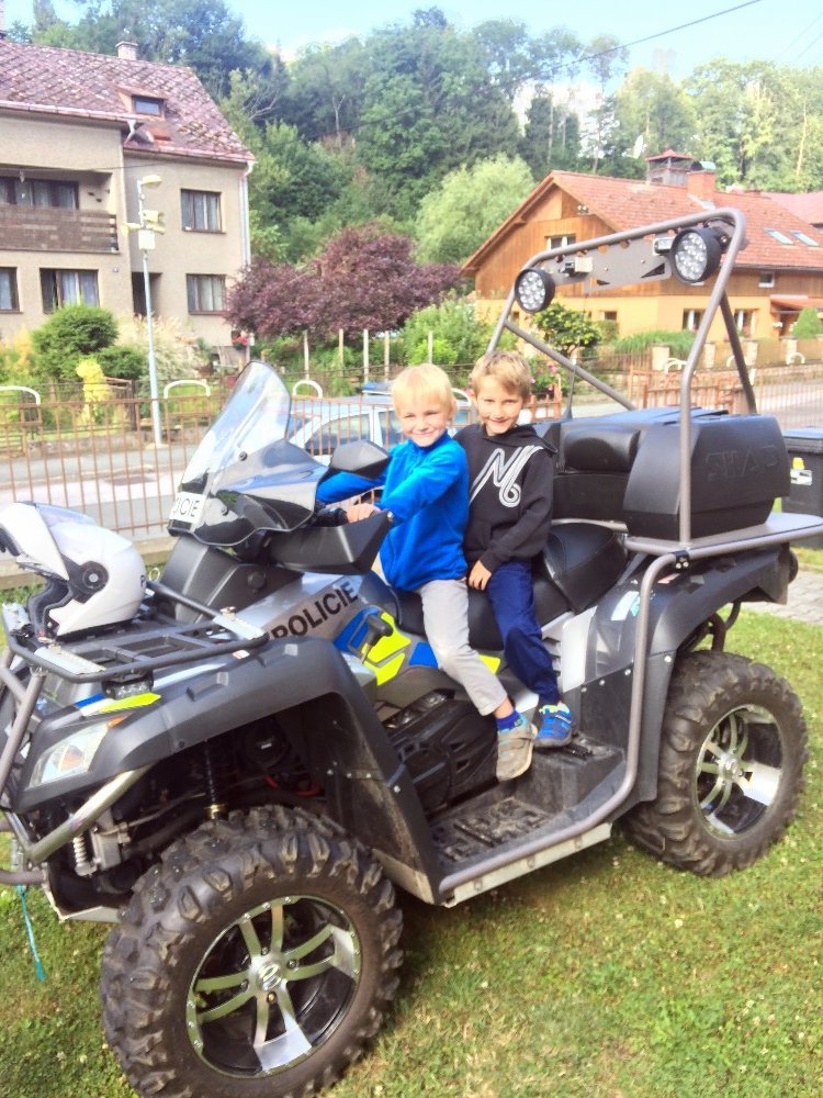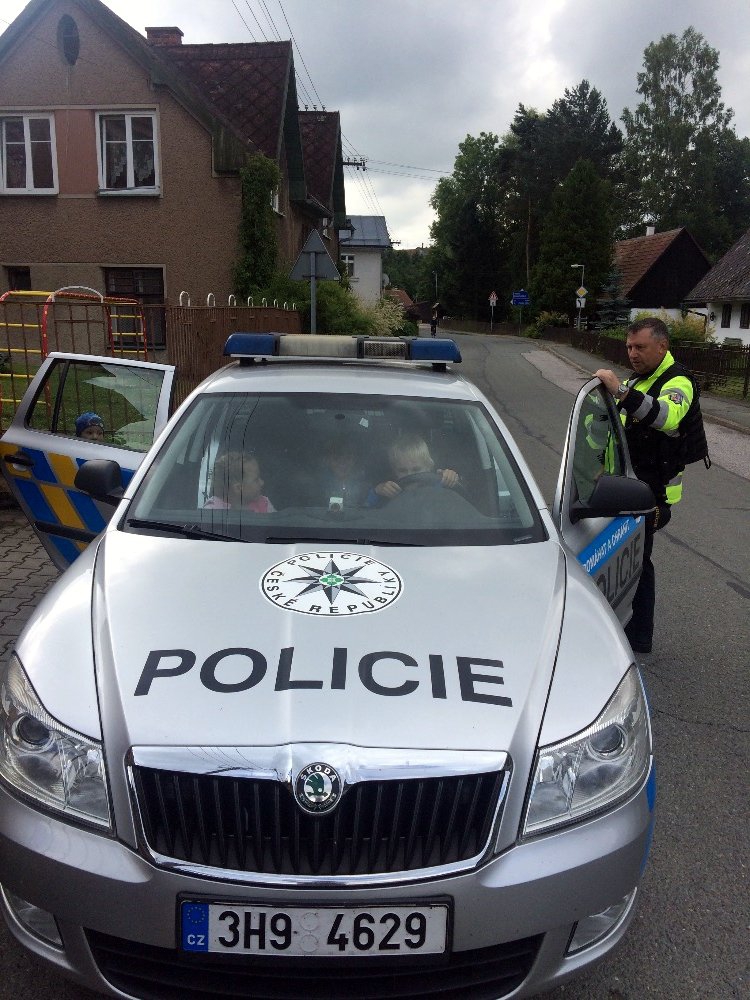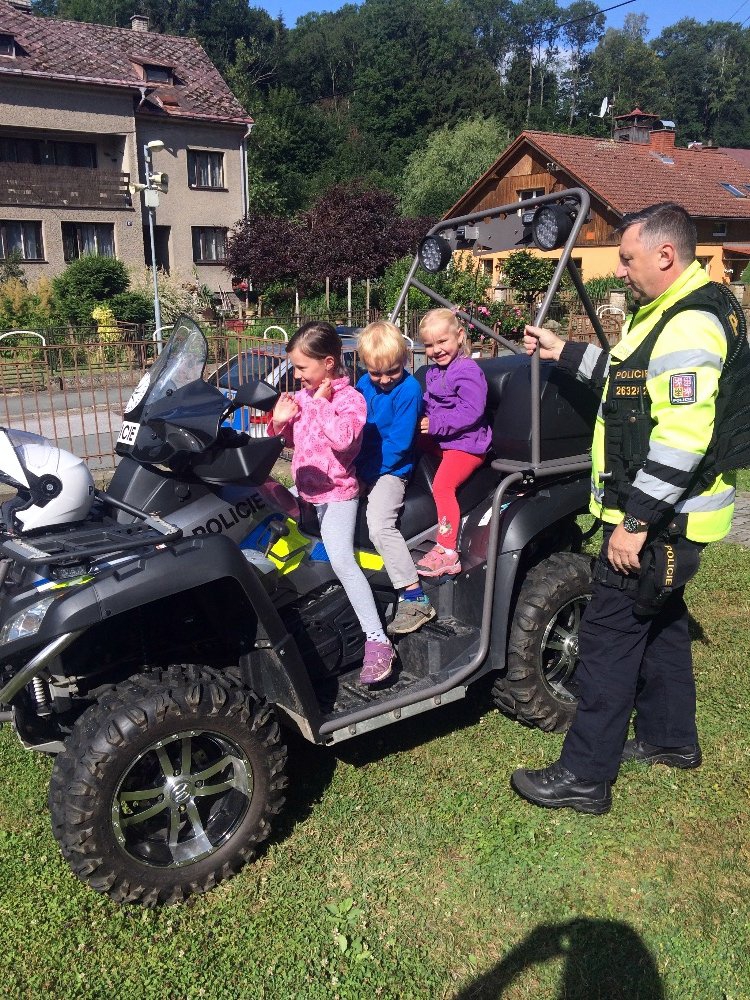 V červnu naši školku navštívili policisté. S krásnou policejní čtyřkolkou zajeli až na naši zahradu.
