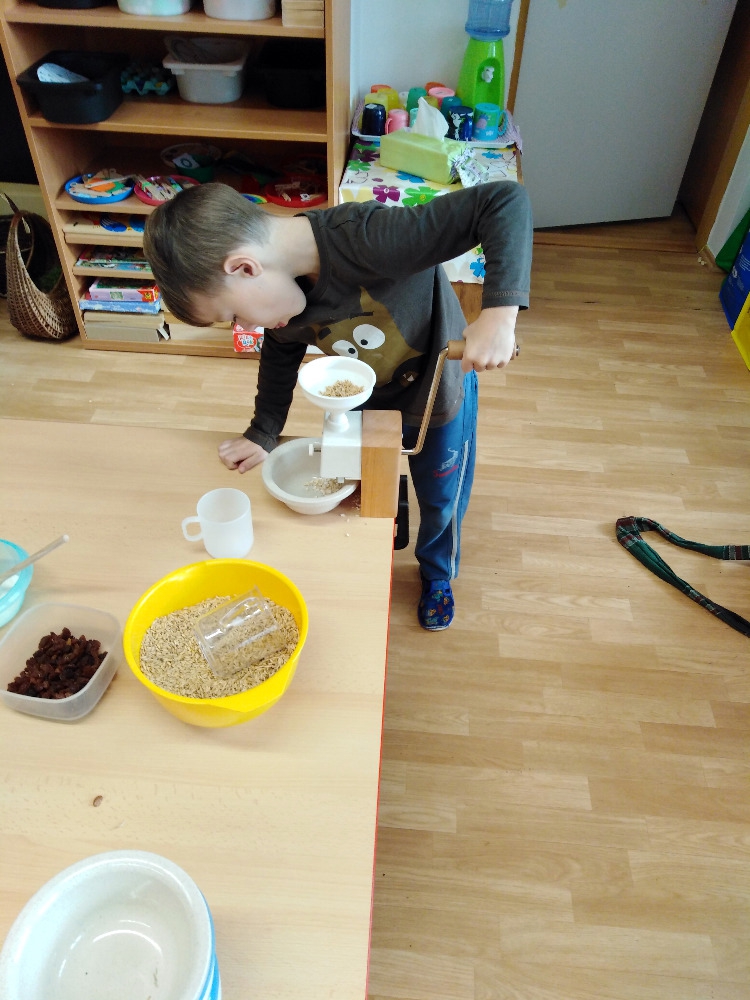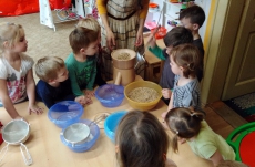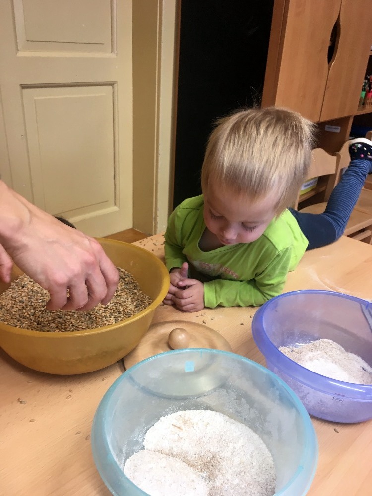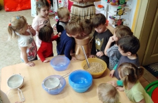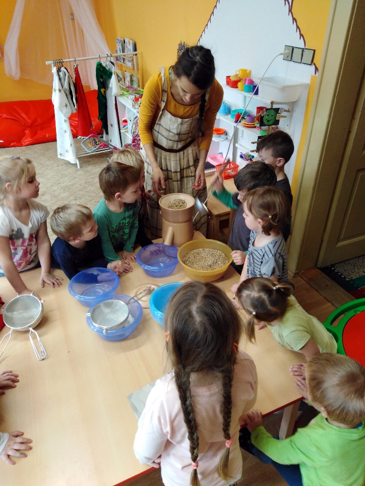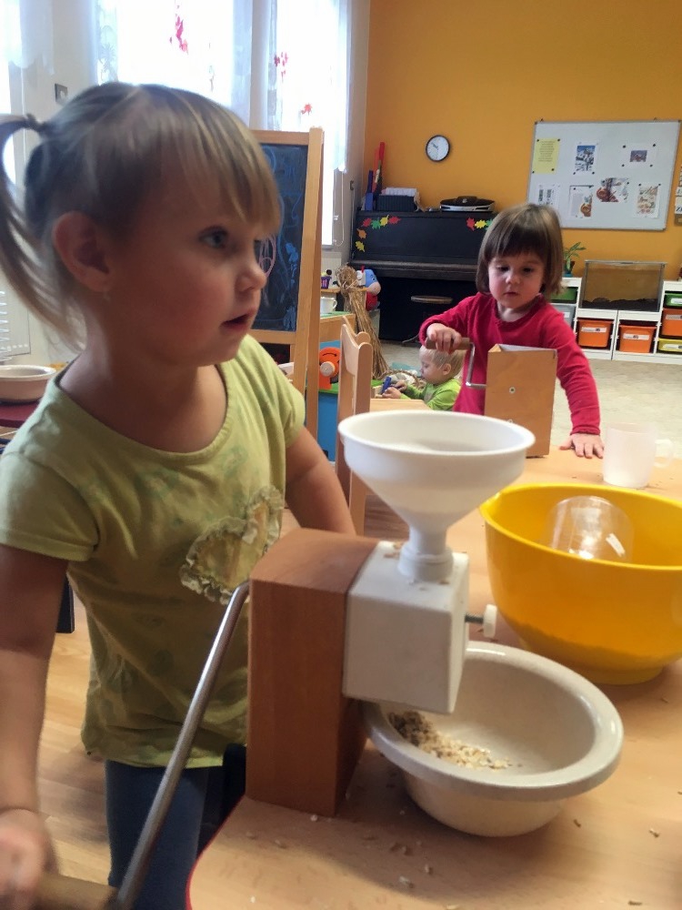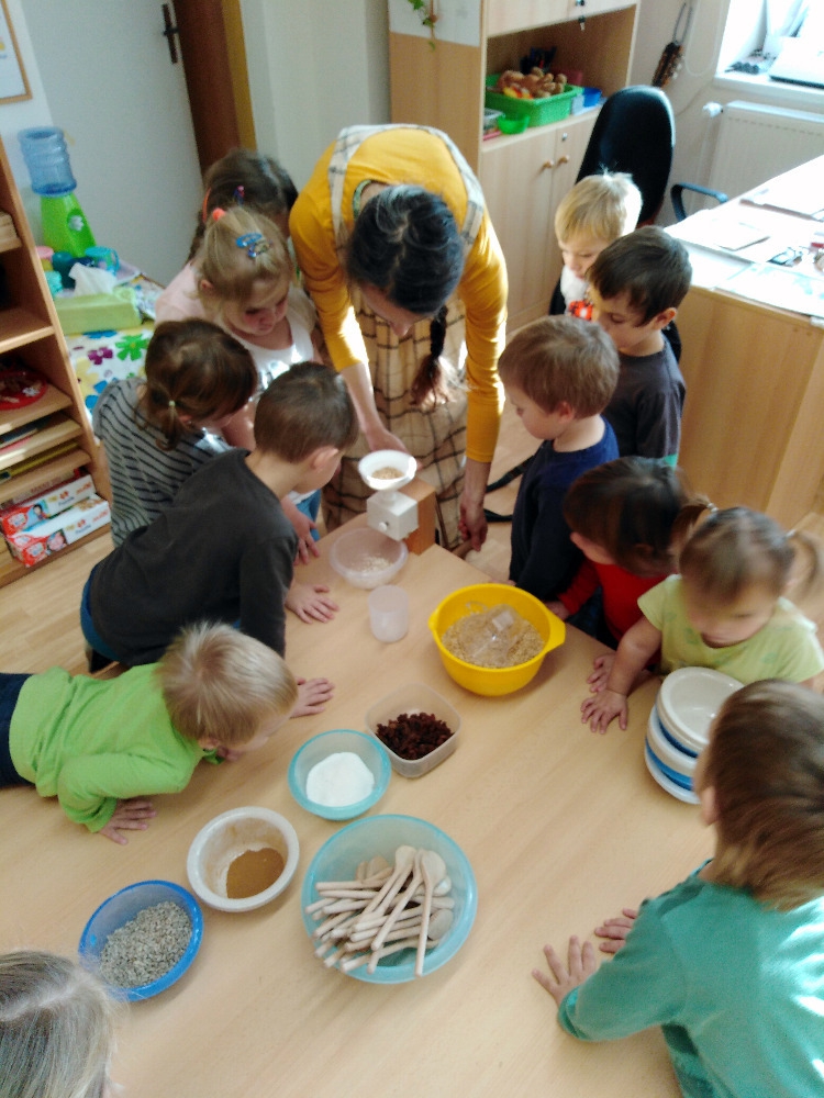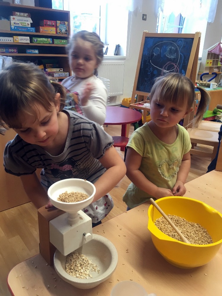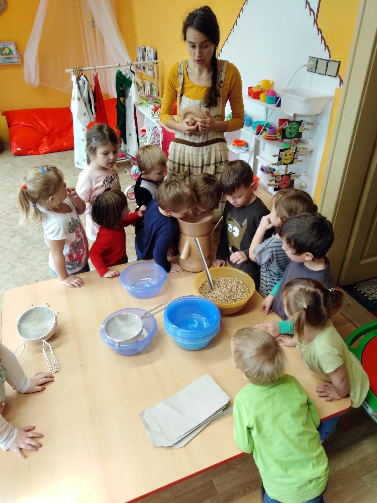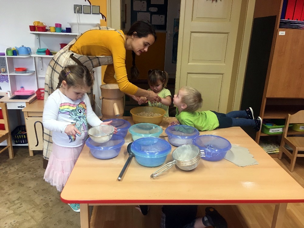 Do školky přijela paní Šárka Vávrová z broumovského kláštera s enviromentálním programem "Příběh obilí". Prožitkové učení děti velmi bavilo. Na mlýncích si umlely mouku, vločky a domů si odnesly svoje udělané musli.