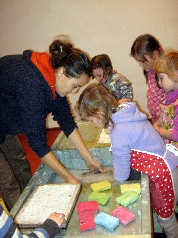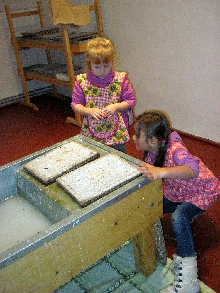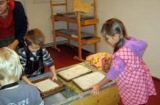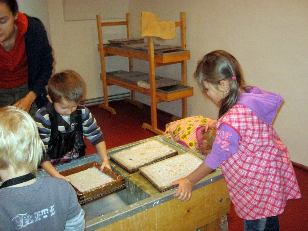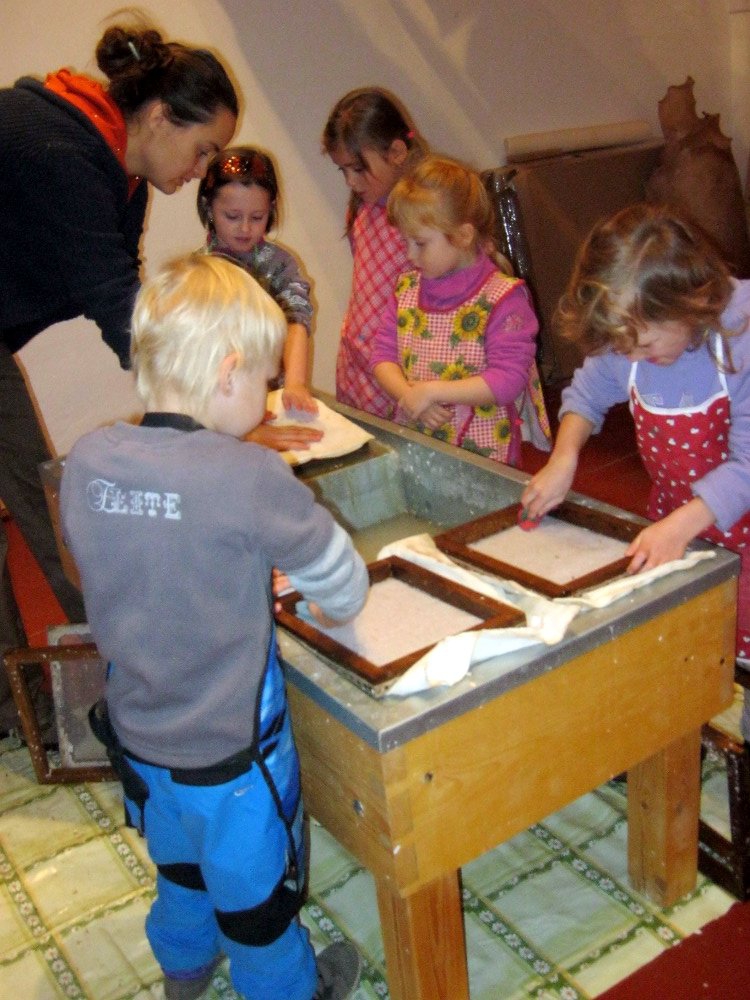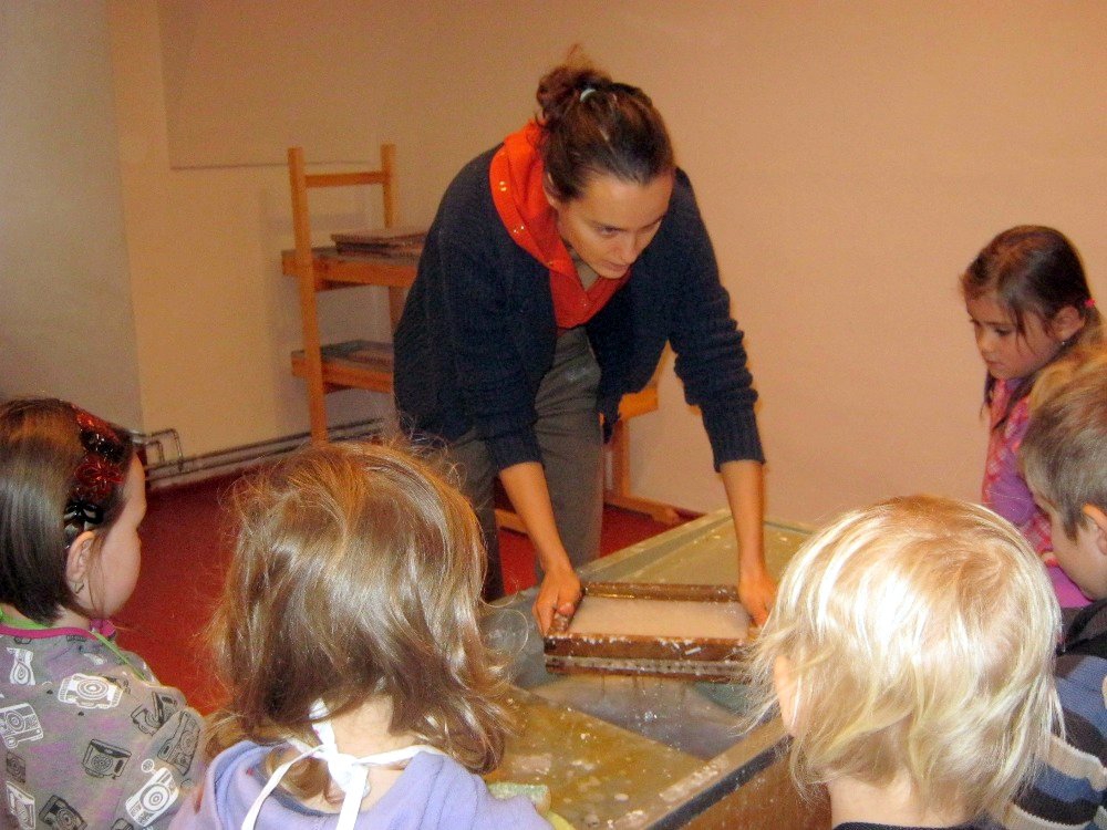 Vyráběli jsme ruční papír, ten teď musí tři dny schnout, než si ho budeme moci vzít na památku domů. Vyzkoušeli jsme si broušení zvířecí kůže, na kterou se dříve psalo. Zahráli jsme si na písaře, když jsme pomocí brka, tuže, štětců a barev vytvářeli obrázky podle své fantazie. Bavila nás i práce s razítky. Děkujeme paní Šárce za užitečně strávený čas.
