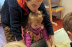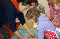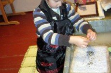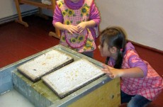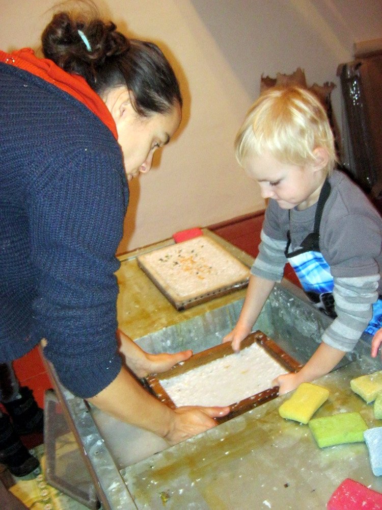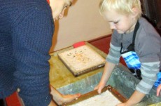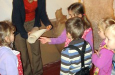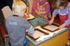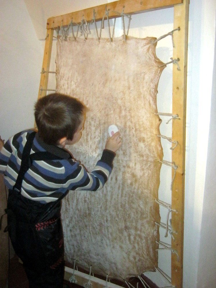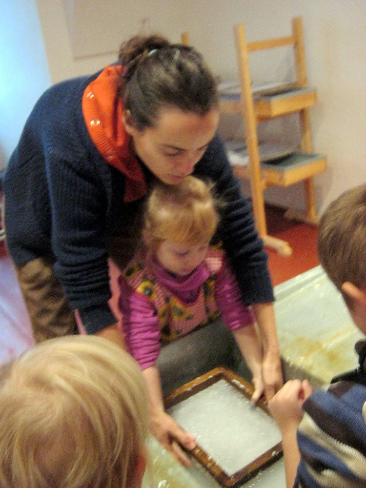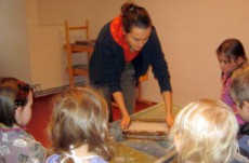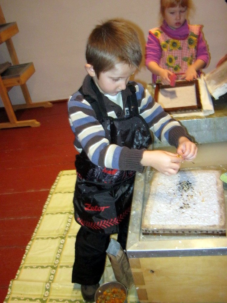 Vyráběli jsme ruční papír, ten teď musí tři dny schnout, než si ho budeme moci vzít na památku domů. Vyzkoušeli jsme si broušení zvířecí kůže, na kterou se dříve psalo. Zahráli jsme si na písaře, když jsme pomocí brka, tuže, štětců a barev vytvářeli obrázky podle své fantazie. Bavila nás i práce s razítky. Děkujeme paní Šárce za užitečně strávený čas.