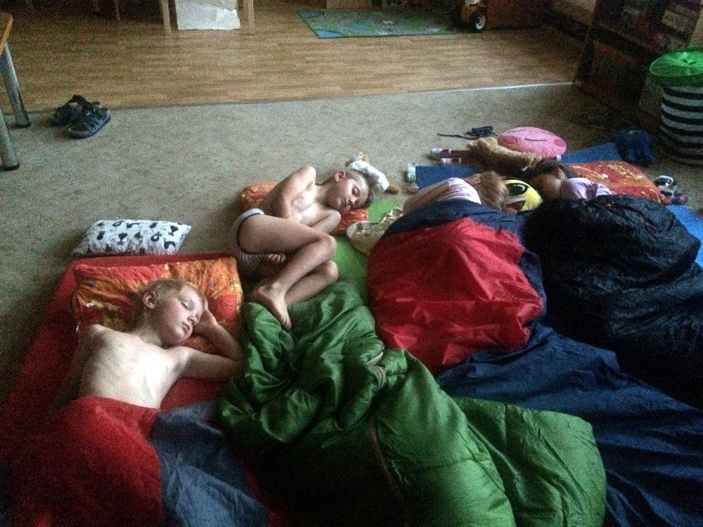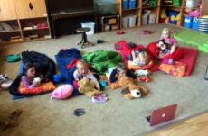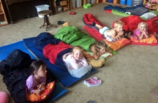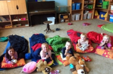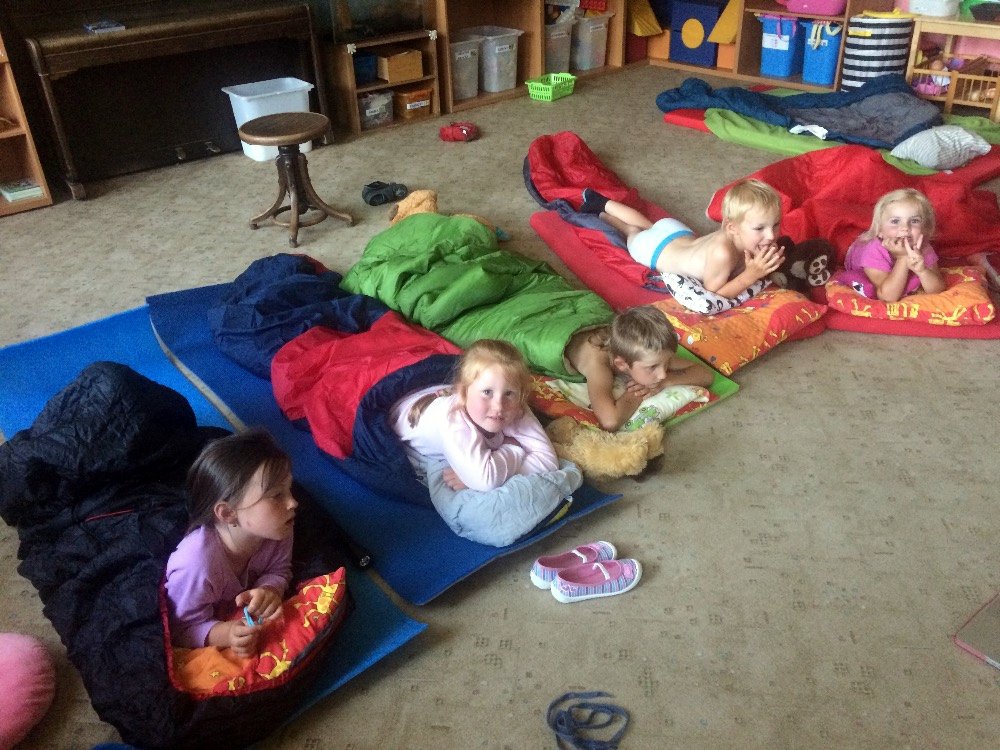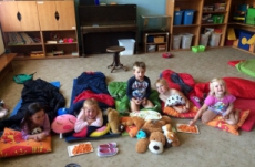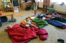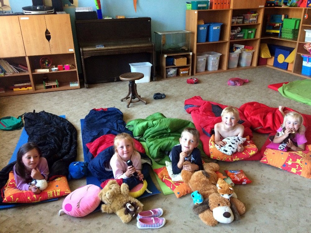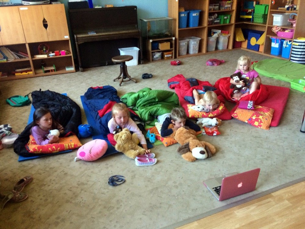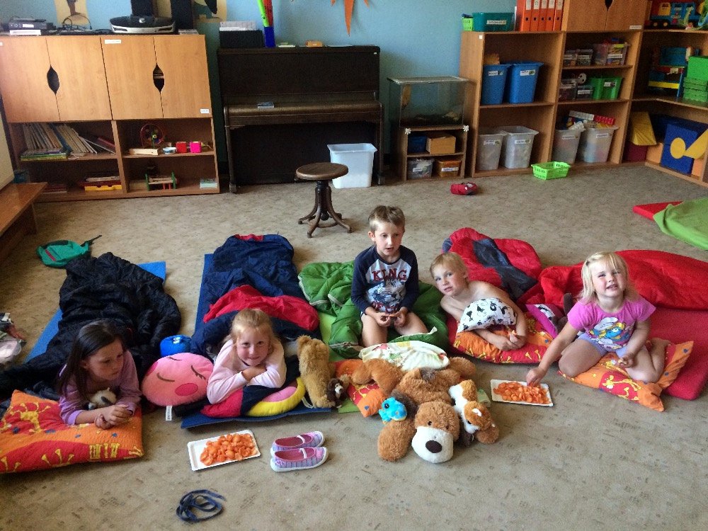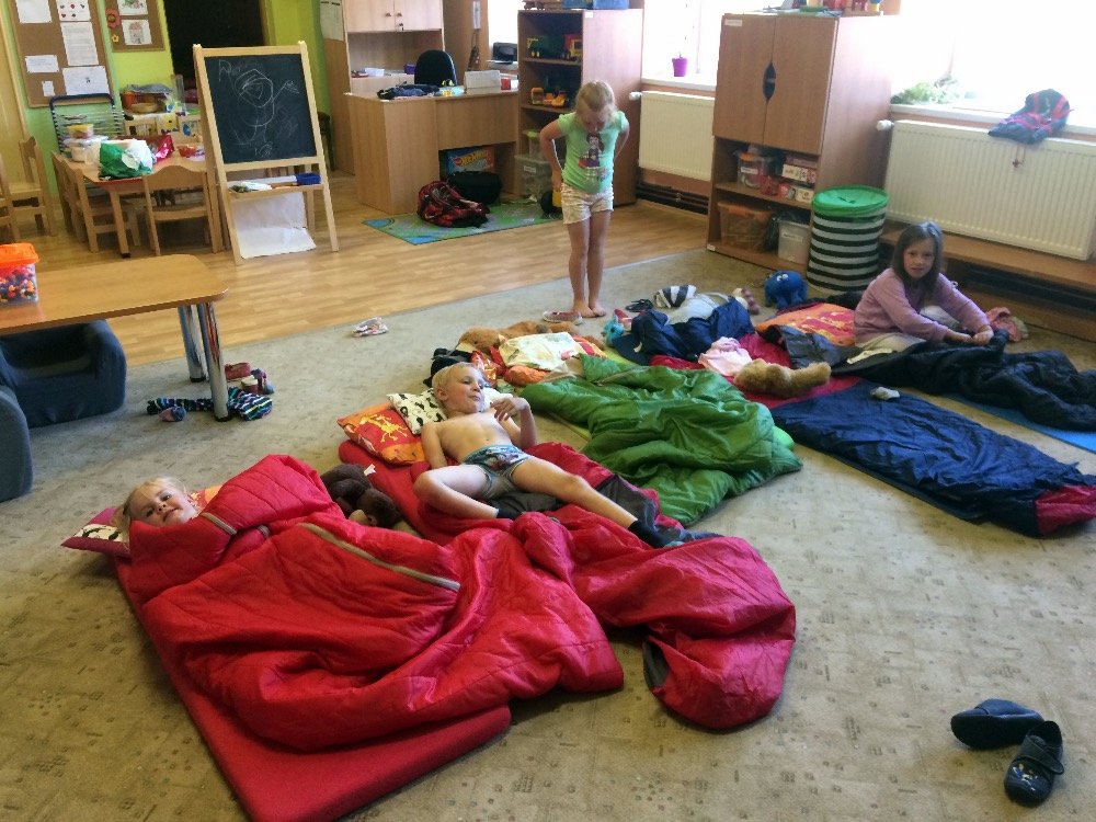 Přespat ve školce je pro děti atraktivní záležitost. Ty nejstarší to zvládají bez problémů. Tentokrát jsme večer zahájili za hezkého počasí na zahradě. Potom jsme si k tématu "emoce" pustili pohádku V hlavě.
