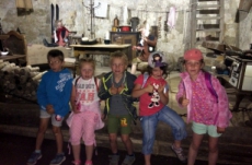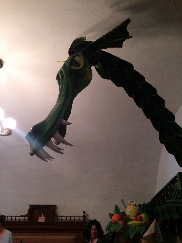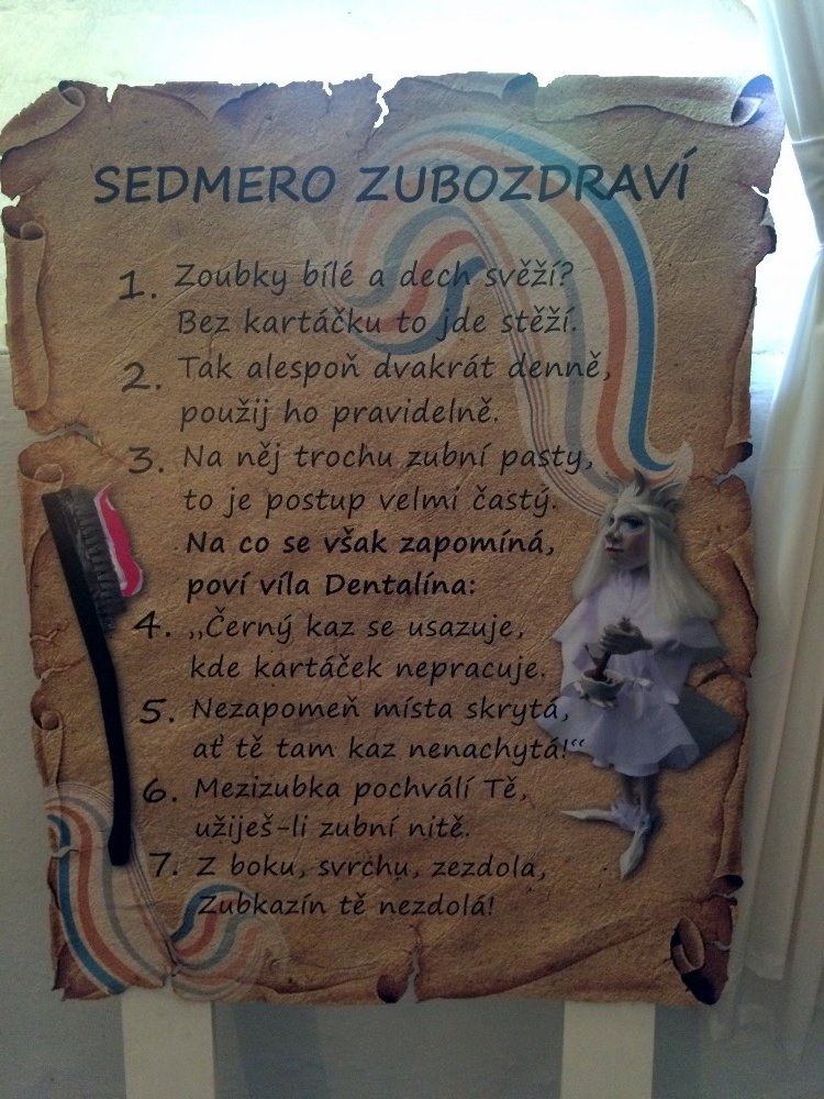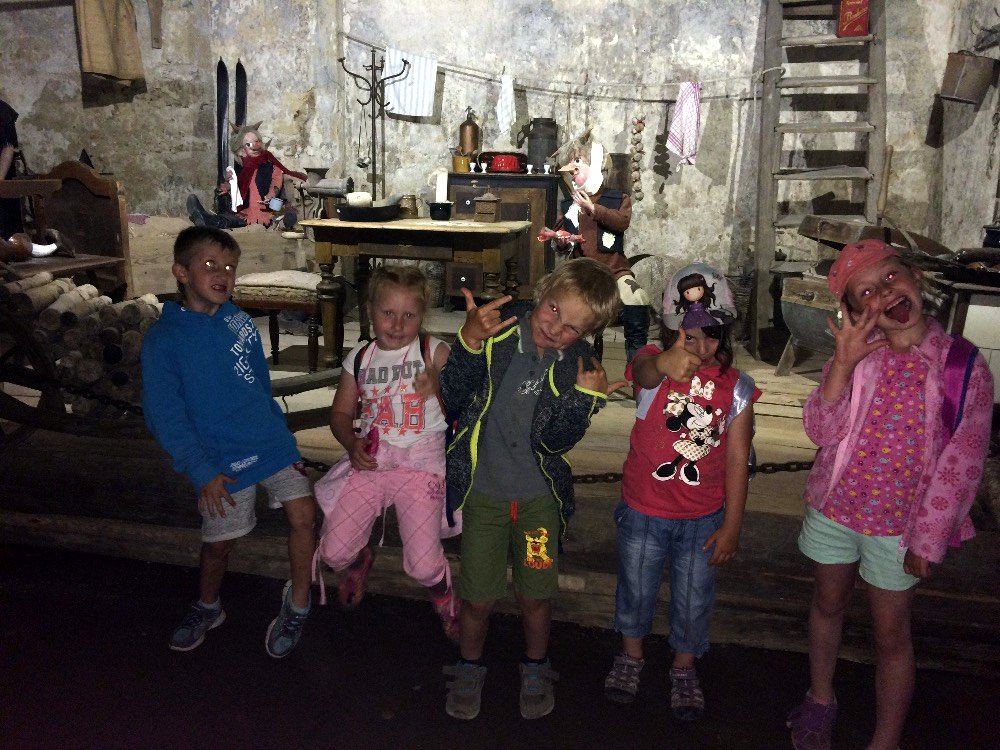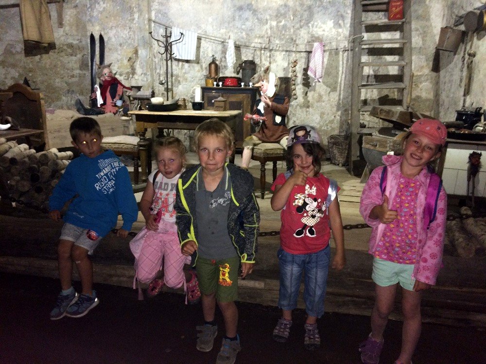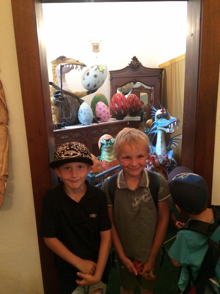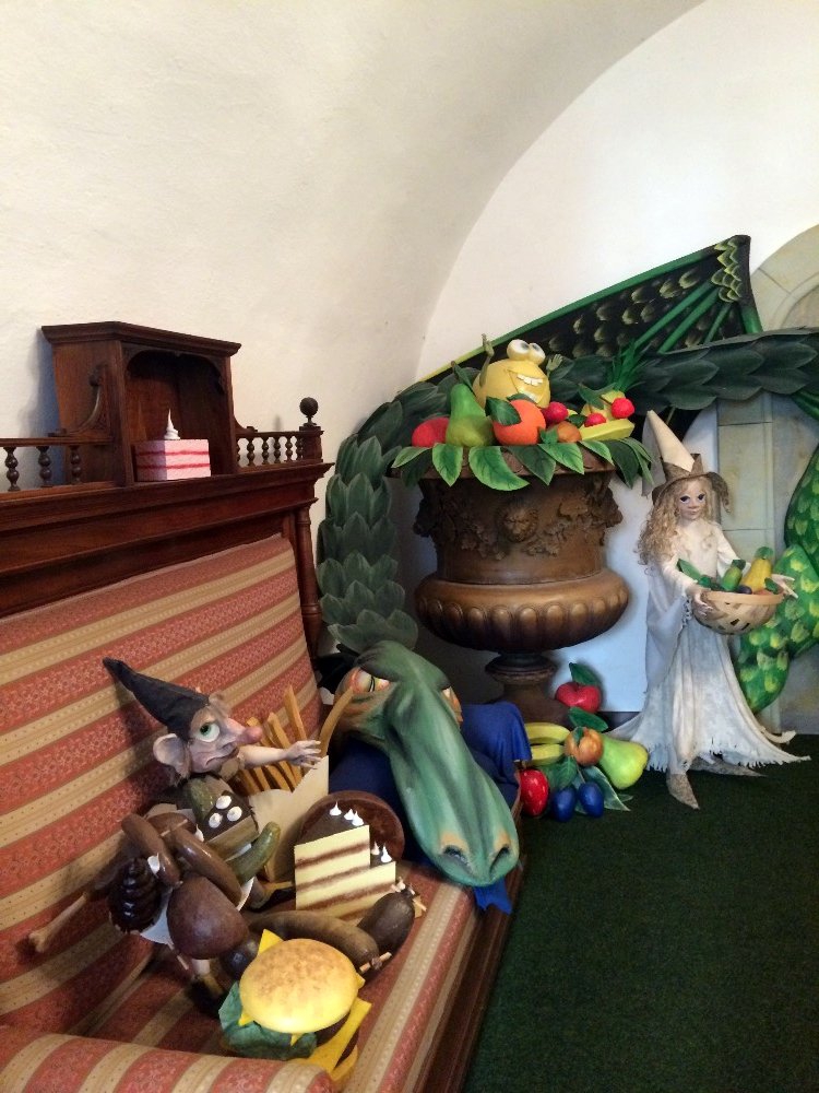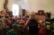 Na zámku nás čekaly dva prohlídkové okruhy: Zdravosvět a Dračí království a Zámecké pohádkové sklepení. První cesta nás zavedla do světa zdraví mezi skřítky ovocňáky a saláťáky, do dračí porodnice a zuboopravny, za vílou Vitamínou a skřítky baciláky, do zdravoškoly a do dračího světa. V pohádkovém sklepení jsme se ocitli v lesním a ledovém království, u rodinky obra, u vodníků, u draka, v paláci plném skřítků a v čertovské domácnosti. Během přestávky jsme se stihli nasvačit a ještě si projít čarodějnou Bestyjolu plnou živých zvířátek.