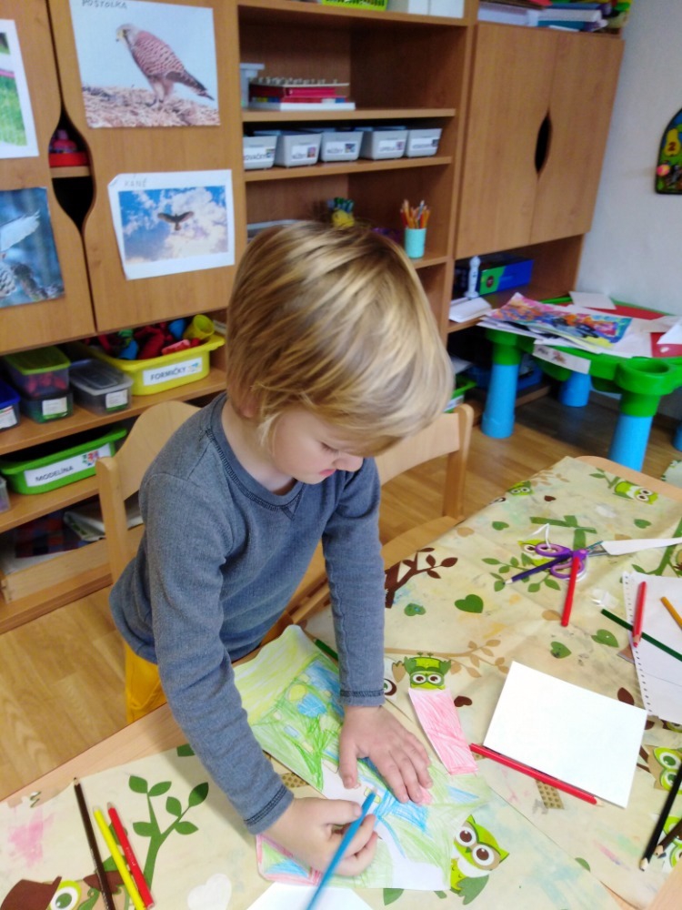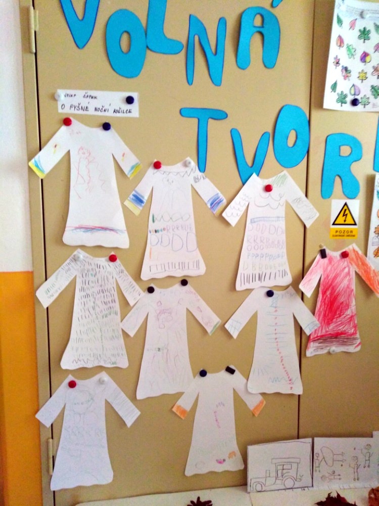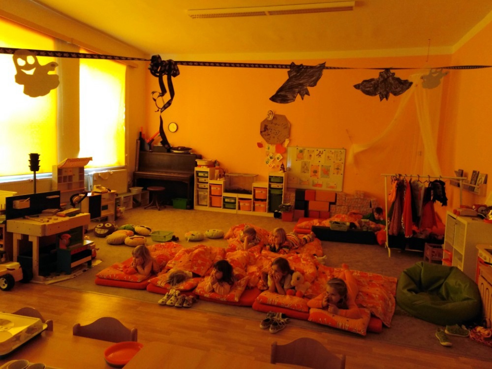 V říjnu jsme se seznámili s tradicí Dušiček a Halloweenu. Zapálili jsme svíčku u místního památníku. Dlabali jsme dýně, které nás teď rozsvícené každé ráno vítají při příchodu do školky. Prožili jsme stezku odvahy. Celý týden jsme zakončili pyžamovou párty. Den v pyžamkách a netradiční spaní v herně s pohádkou O pyšné noční košilce bylo prima.
