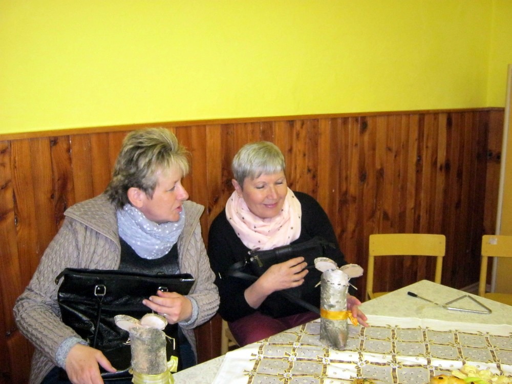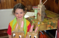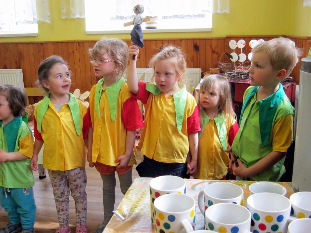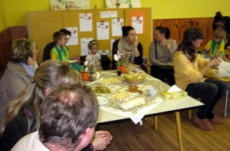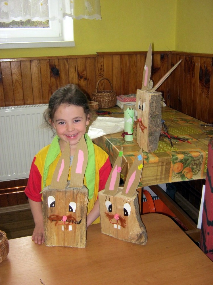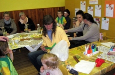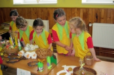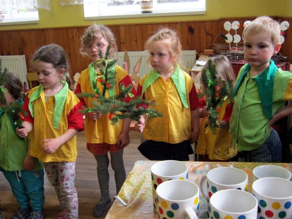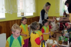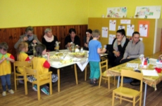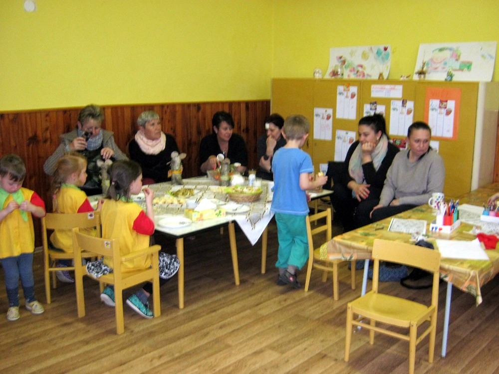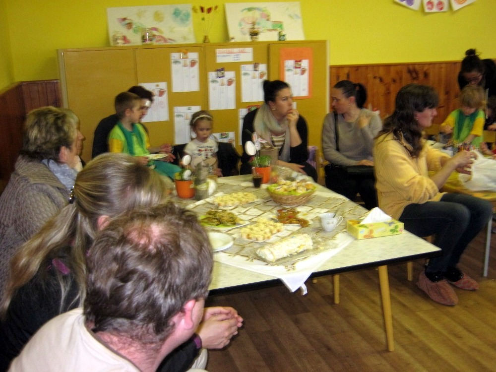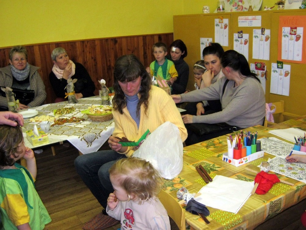 Poté jsme pozvali obecenstvo na pohoštění a ke stolečku plnému velikonočních dekorací, které jsme s dětmi vyrobili.