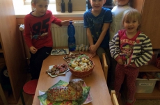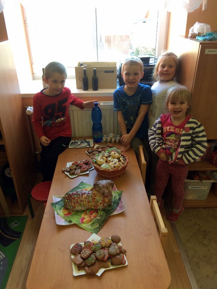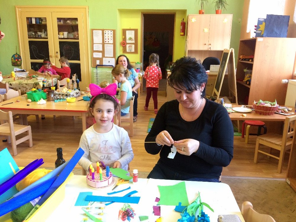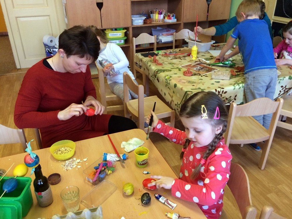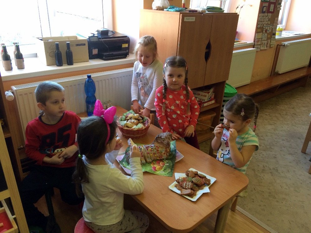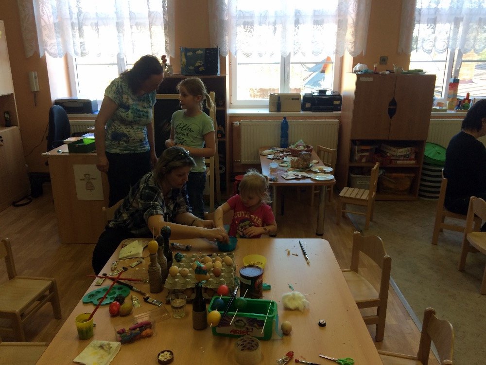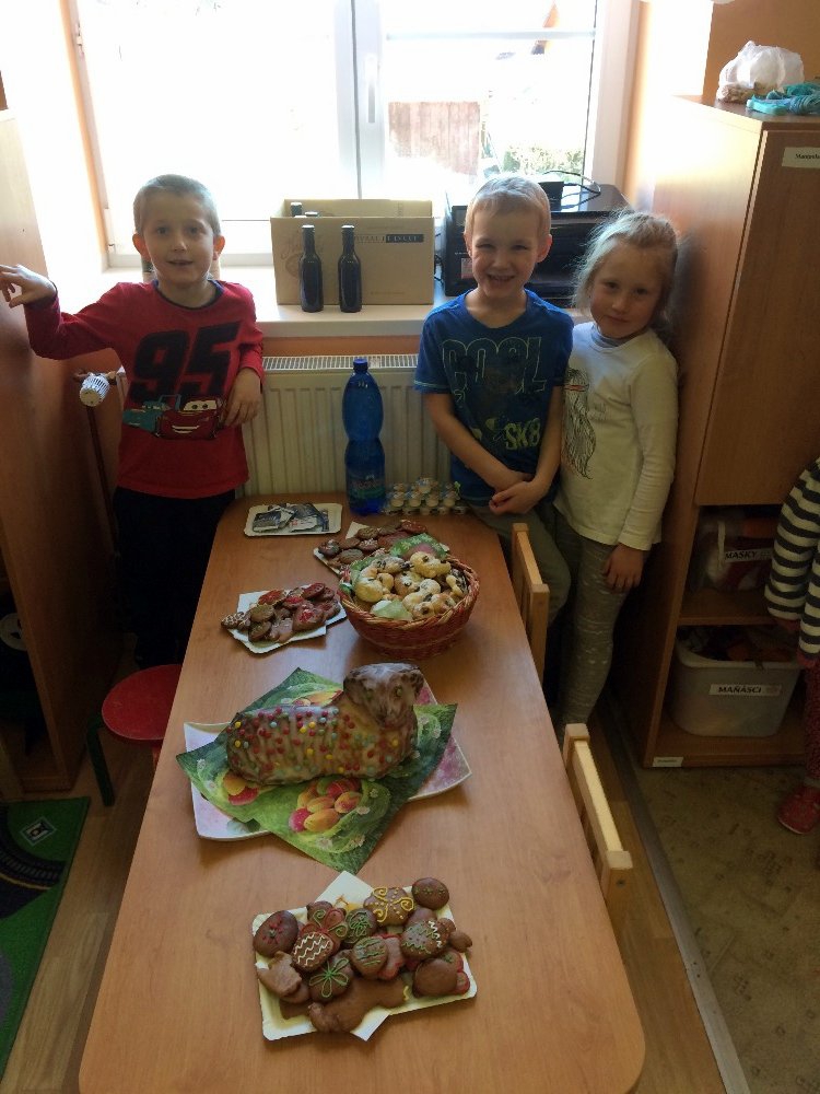 Vyráběli jsme kytičky z krepového papíru, zajíce, ptáčky a tulipány z přírodnin, mističky a zvířátka z keramické hmoty. Zdobili jsme vejdunky. Rodiče nám tak pomohli vytvořit plno krásných věcí na velikonoční výstavu. Měli jsme také dobrou hostinu. Pochutnali jsme si na perníčcích a jidášcích, které jsme si sami upekli. Paní Haitlová donesla beránka, kterého stačilo ozdobit a sníst.