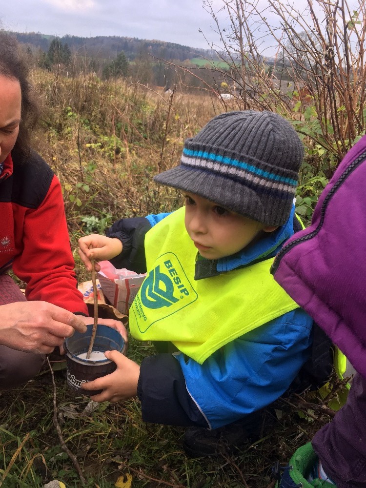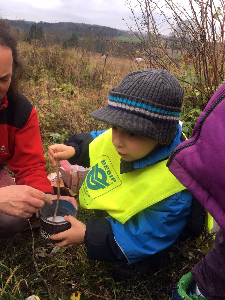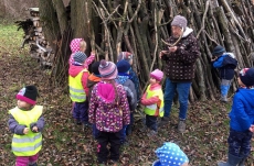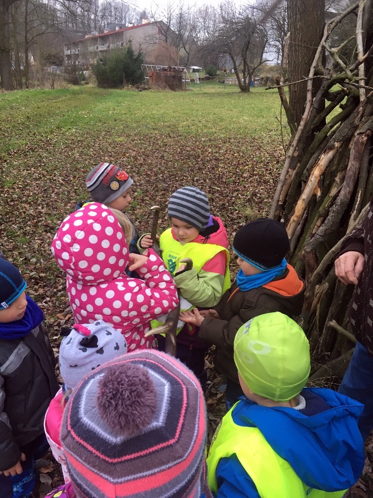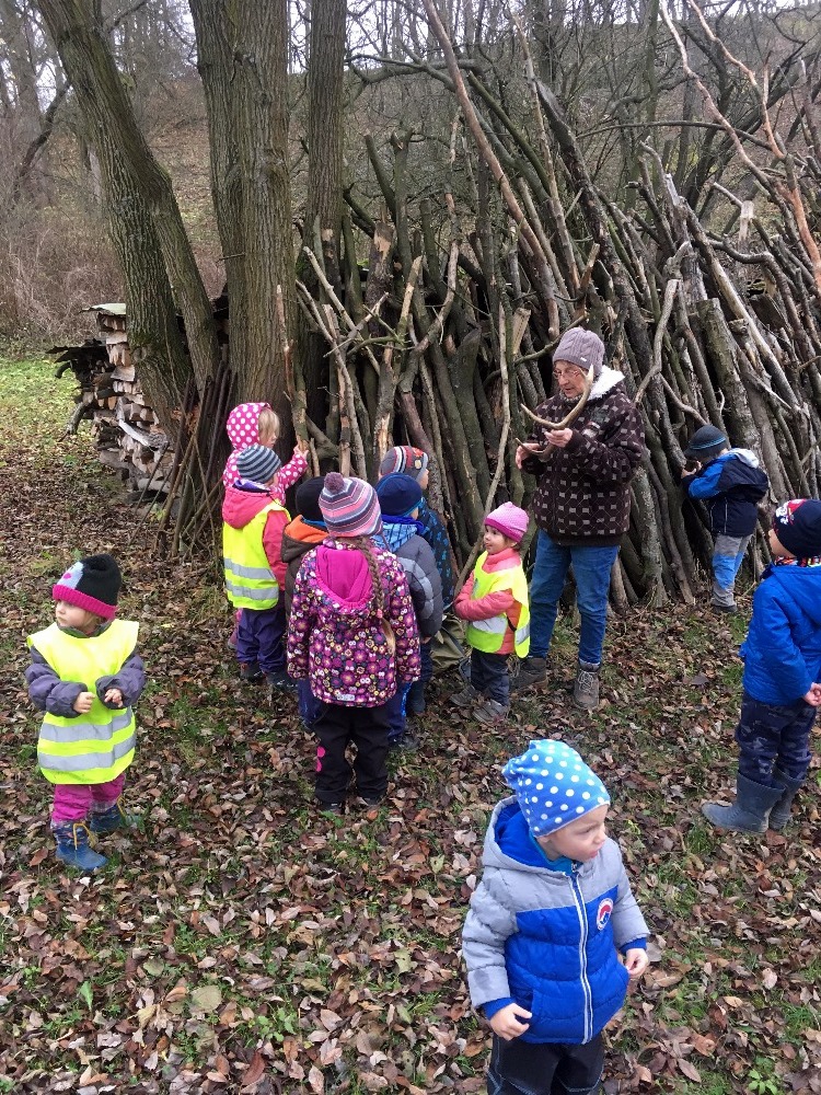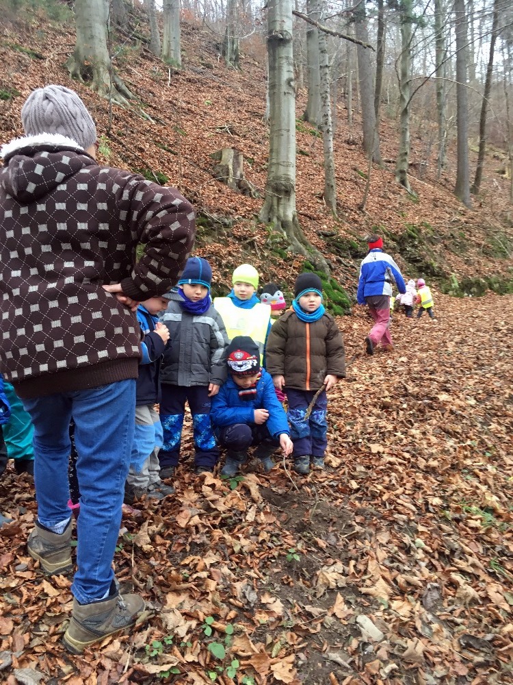 Na vycházku do lesa s námi šla paní myslivcová. Seznámila nás s pravidly chování v lese, ukázala nám různé typy parohů a stopy zvířátek. Ty jsme pozorovali již dříve a zkoušeli jsme je také odlévat. Dostali jsme stromky, které jsme ozdobili mimo jiné našimi vyrobenými krmítky ze šišek. Ptáčkové už si pochutnávají.