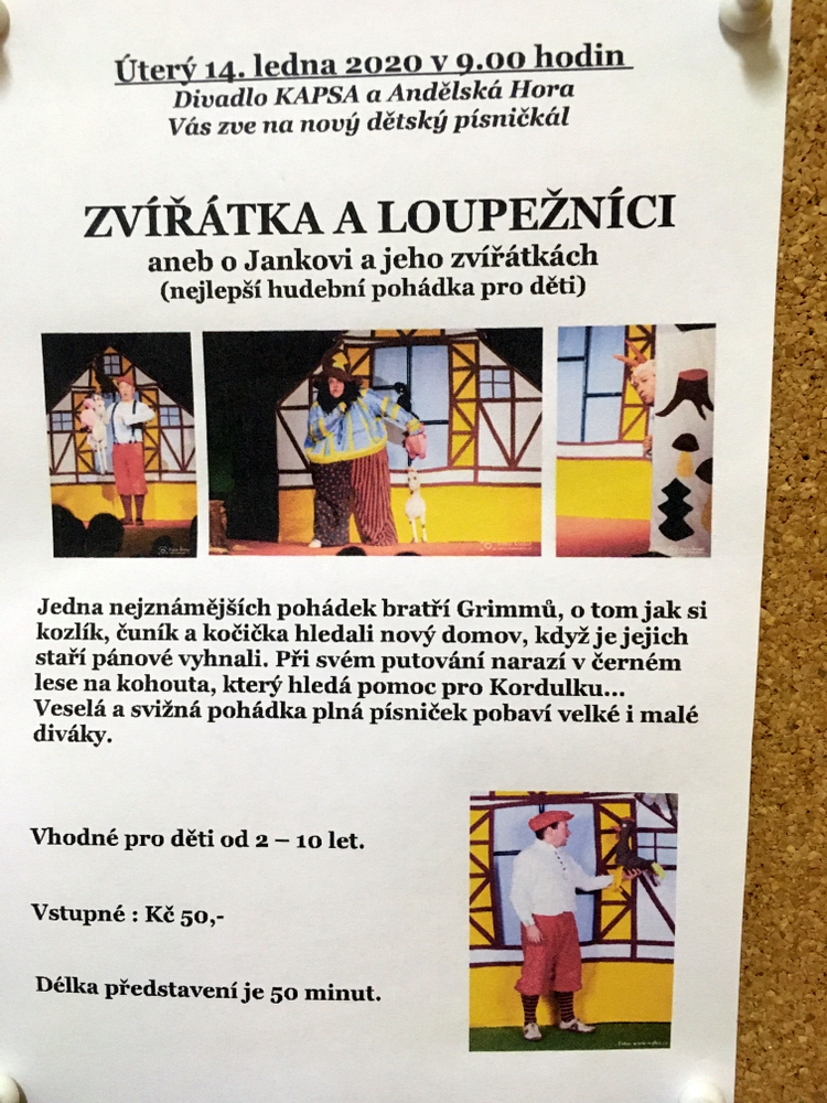 V Jiráskově divadle jsme viděli pěknou hudební pohádku Zvířátka a loupežníci. Jedna z nejznámějších pohádek bratří Grimmů o tom, jak si kozlík, čuník a kočička hledali nový domov, se dětem líbila. Zaznělo v ní také plno lidových písniček.