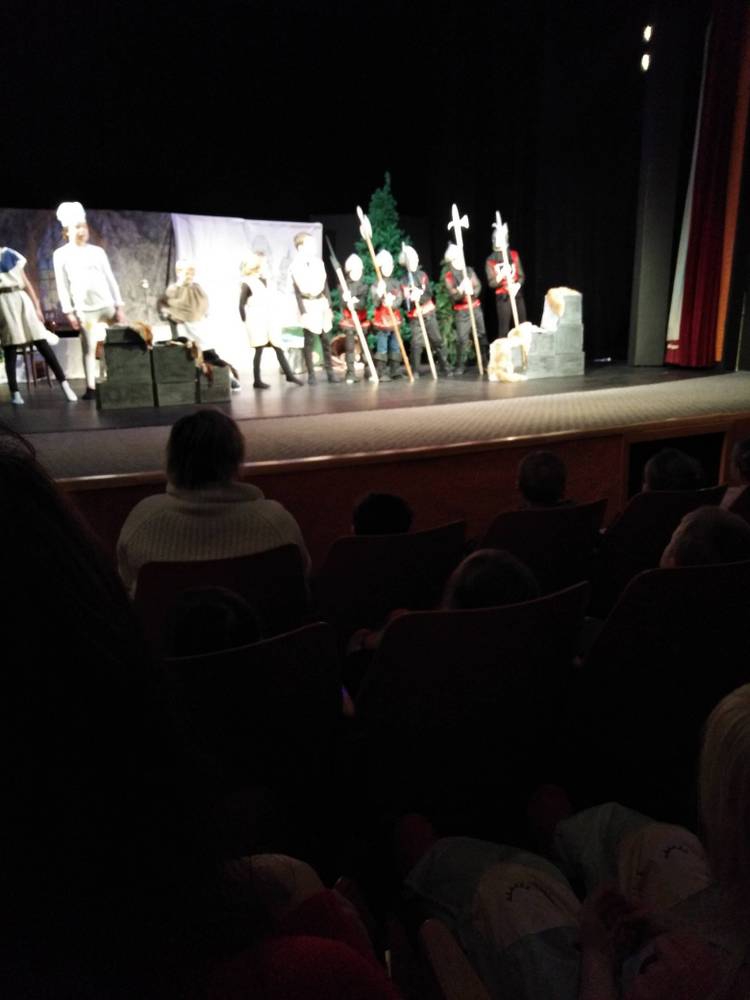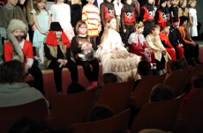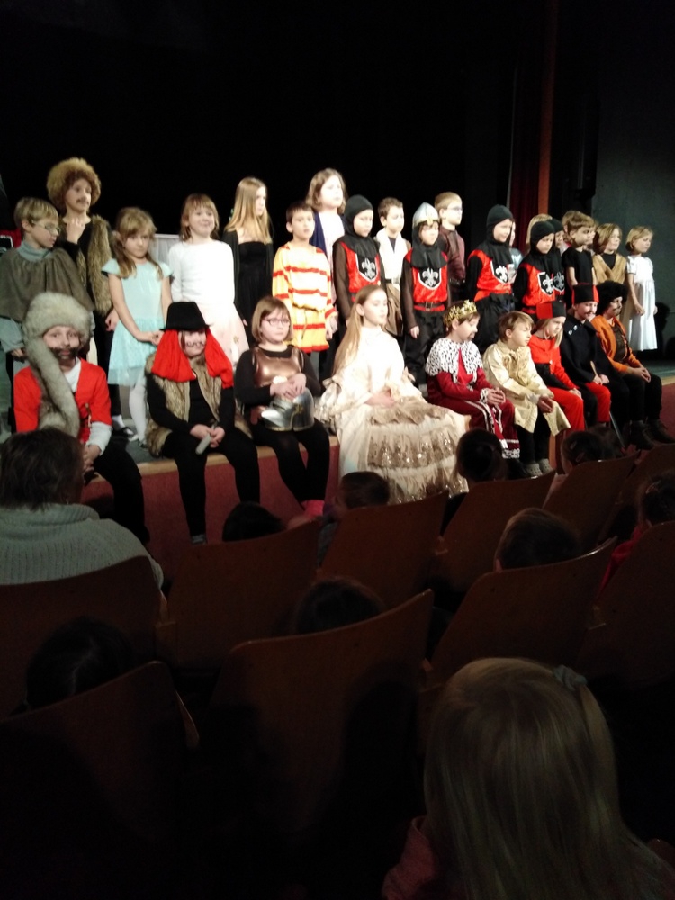 V divadle jsme shlédli představení Noc na Karlštejně, které nacvičili školáci ze Suchého Dolu. Hra trvala téměř hodinu a obsahově ji naše malé děti samozřejmě stěží mohly pochopit. Přesto vydržela většina z nich v klidu sedět a sledovat, co se děje na jevišti. Bylo to především díky tomu, že hrály "děti dětem", měly pěkné kostými a pěkně zpívaly. Jejich výkon byl skvělý. Tleskáme!!