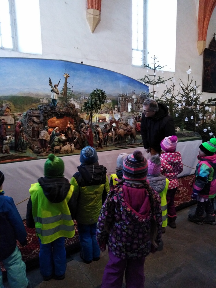 Nejprve jsme s dětmi navštívili místní kostel. Provedl nás zde pan Troutnar. Ukázal nám vystavený betlém a pověděl nám o jednotlivých postavičkách. Poděkovali jsme zpěvem koledy.