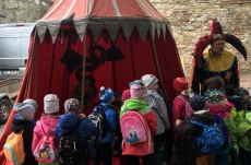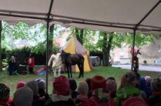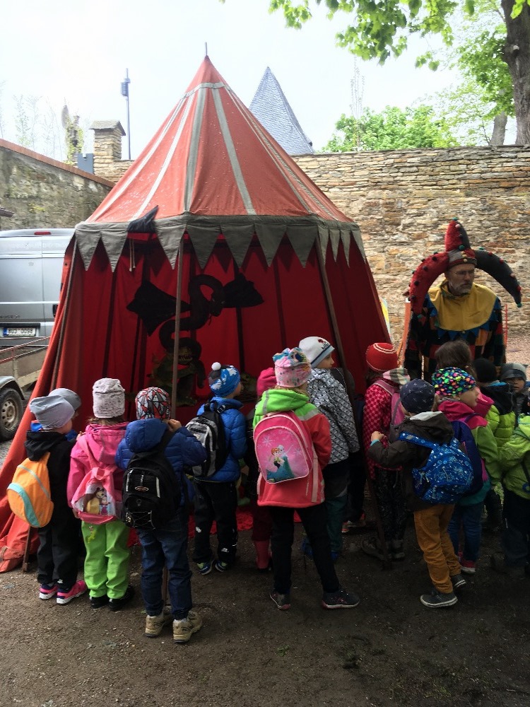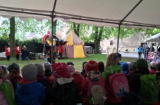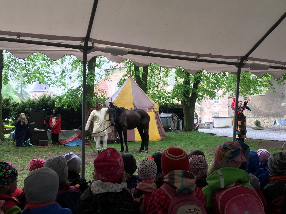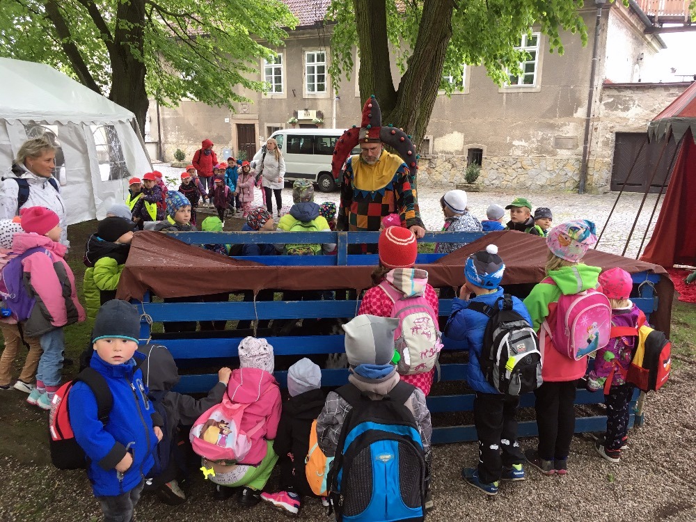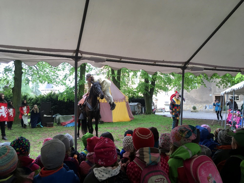 Společně s polickou a žďárskou MŠ jsme byli na výletě v Novém Městě nad Metují. Před zámkem se odehrála pohádka, ve které princ Bajaja na koni bojoval s drakem, aby zachránil princeznu.
