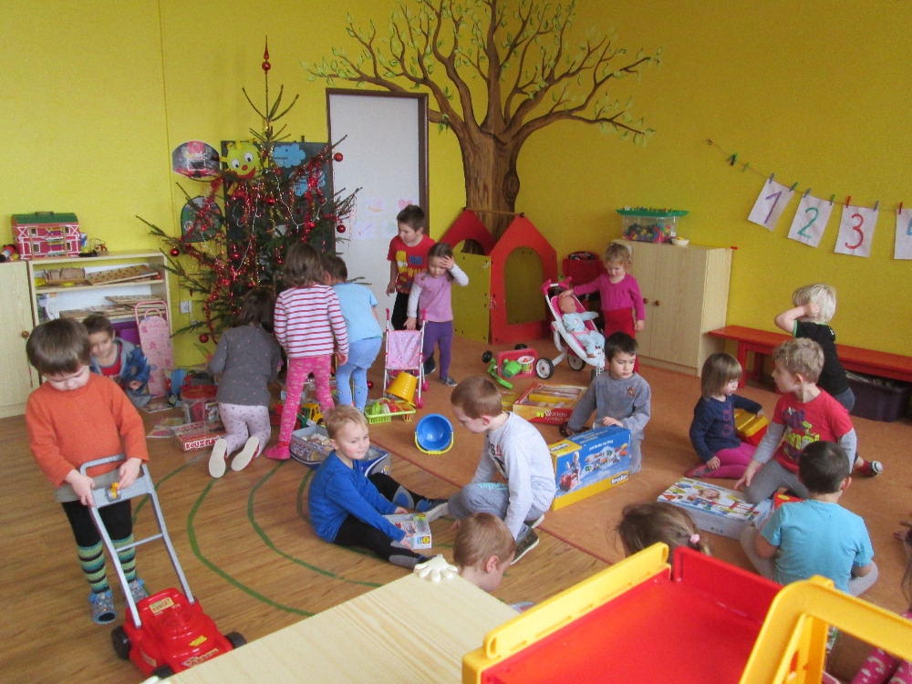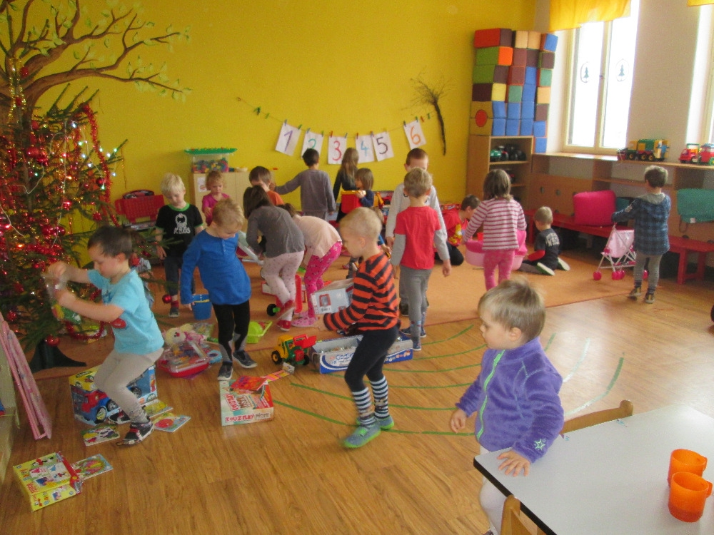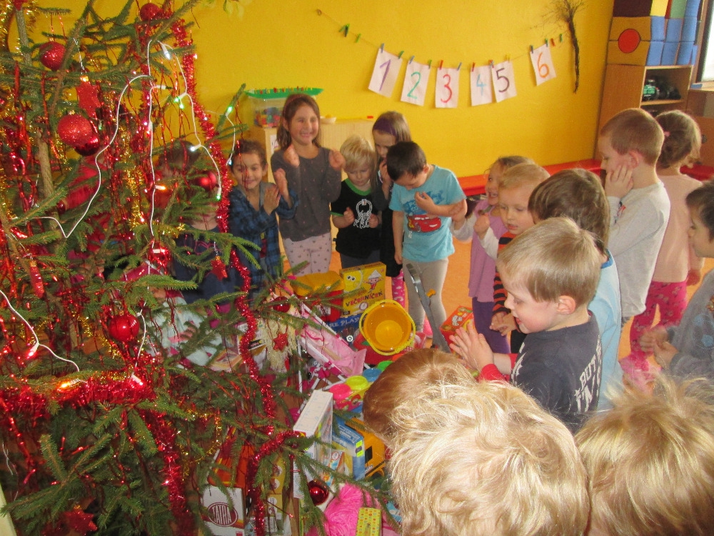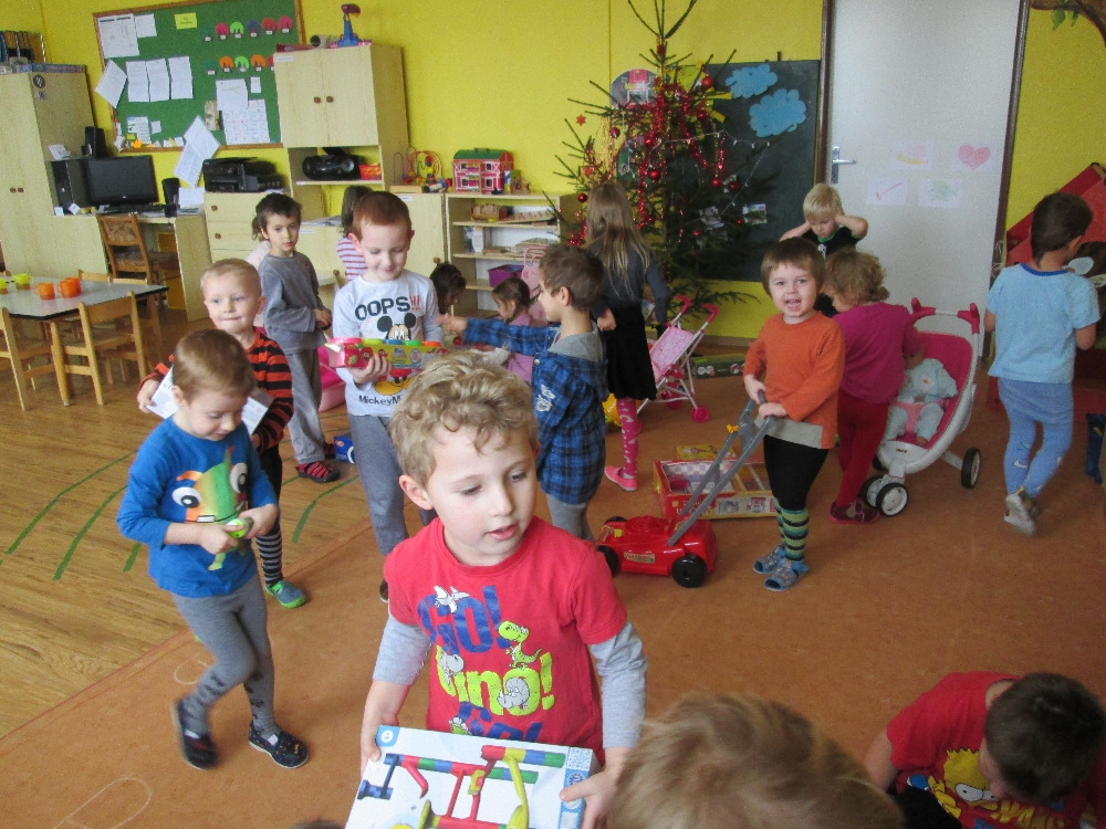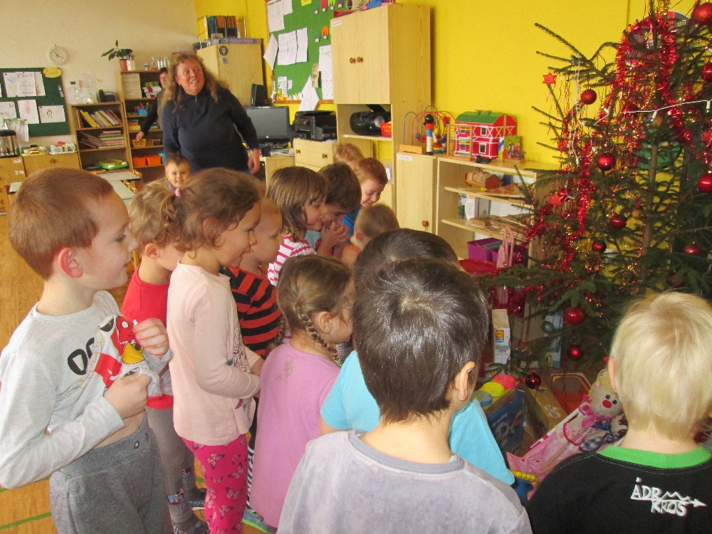 V úterý 20. prosince nás po příchodu z vycházky čekalo překvapení. Ve třídě svítil stromeček a pod ním byly dárky. Při jejich rozbalování se često ozývaly výkřiky radosti. Kromě hraček děti dostaly i nové hry, stavebnice a didaktické pomůcky.