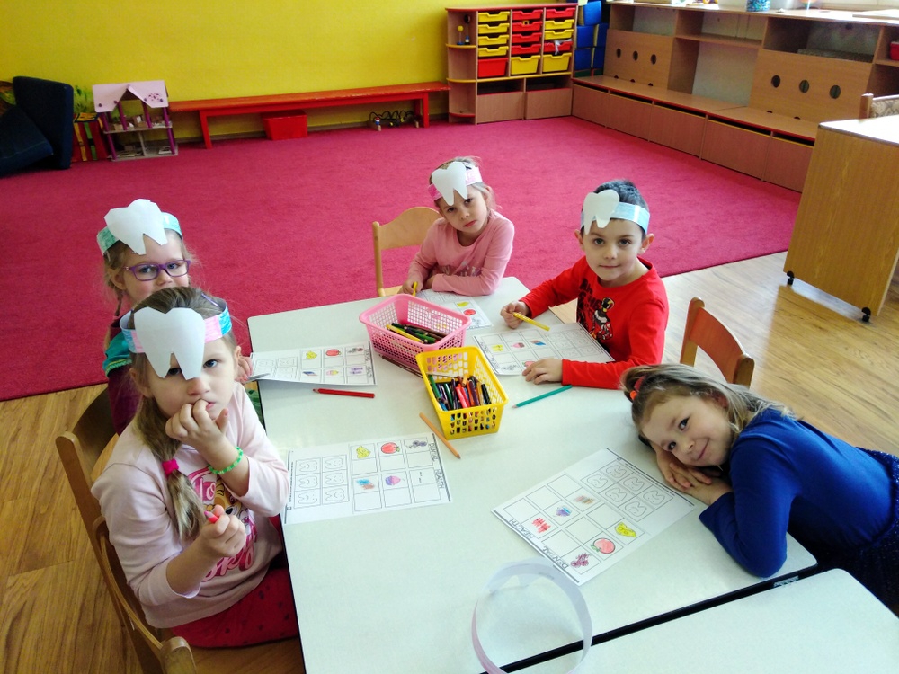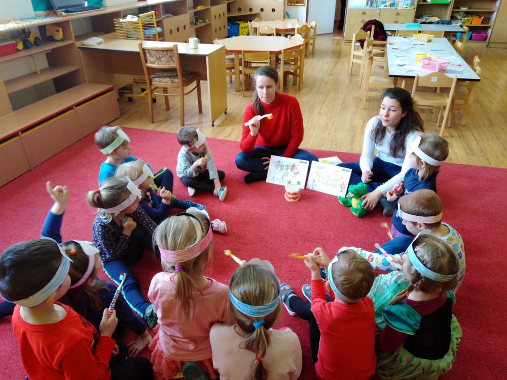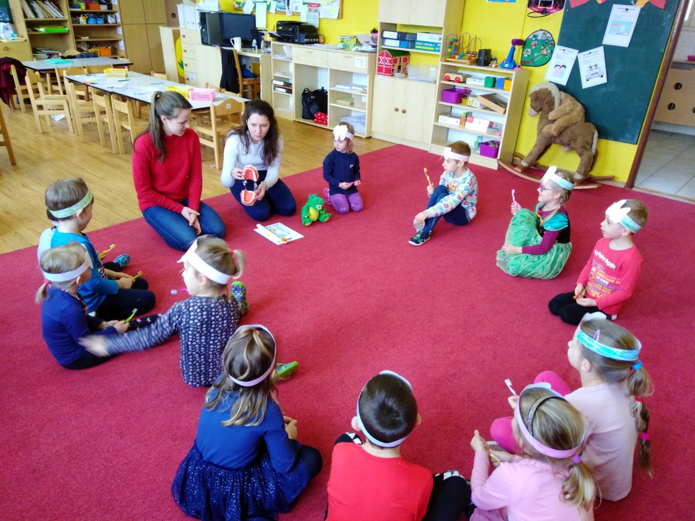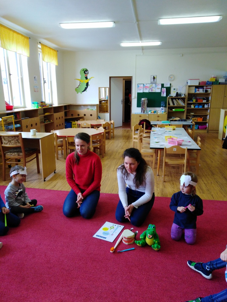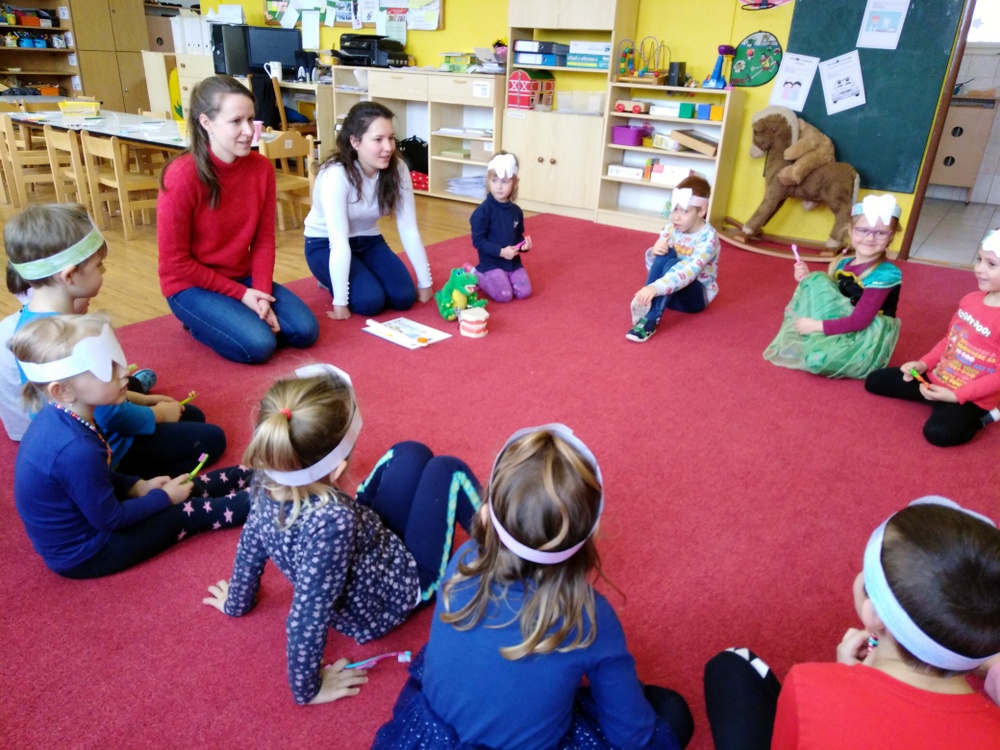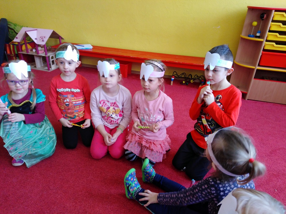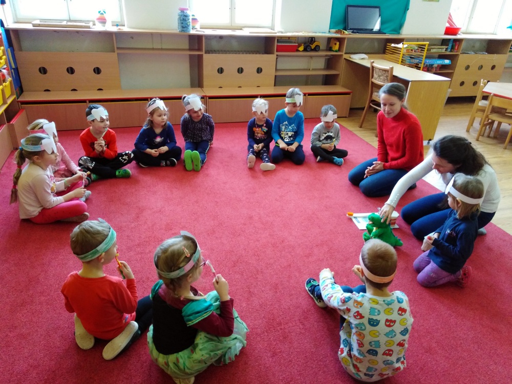 Dne 12.2. nás ve školce navštívily zubní laborantky. Ráno si děti vyrobily zoubkovou čelenku pro navození hezké a vtipné atmosféry.
