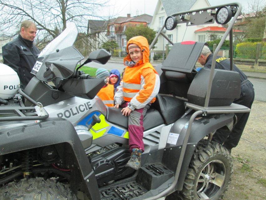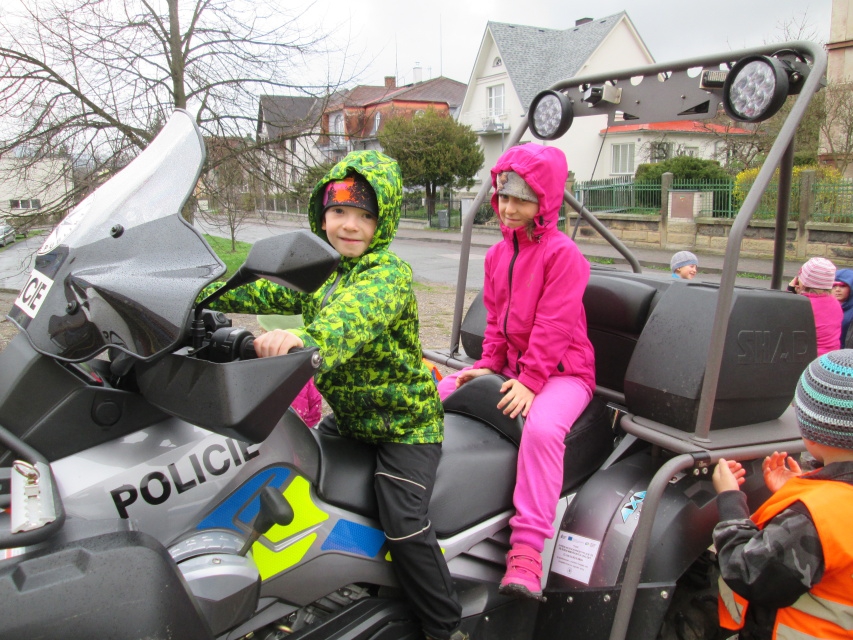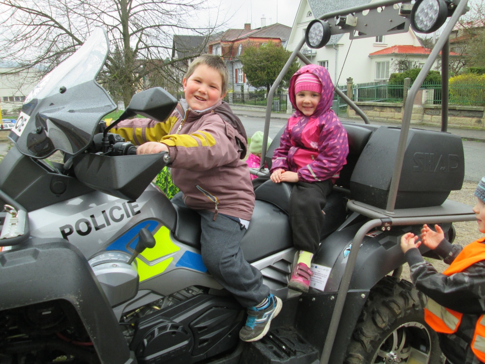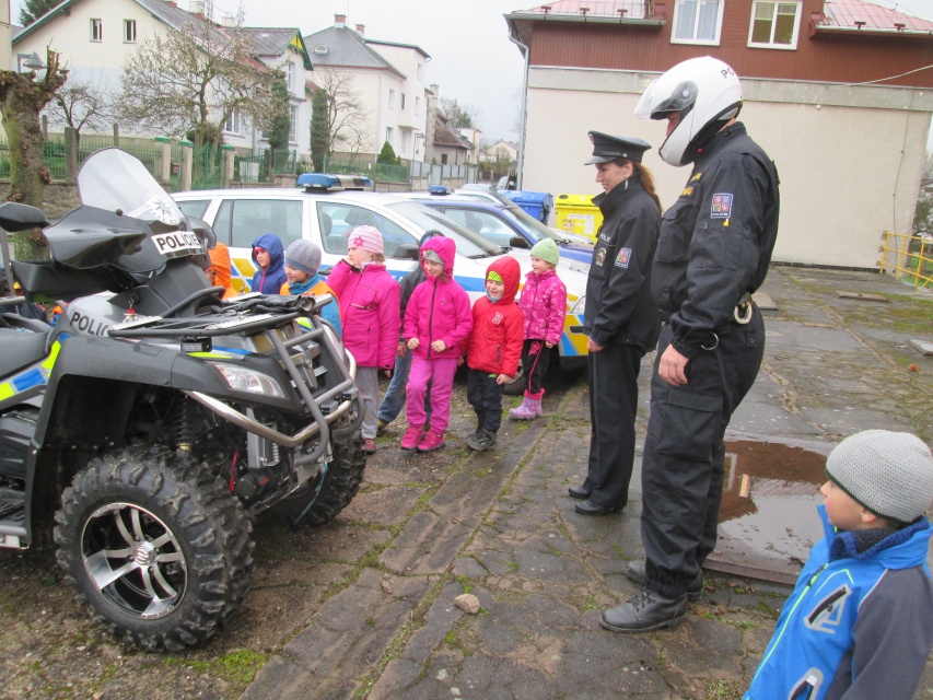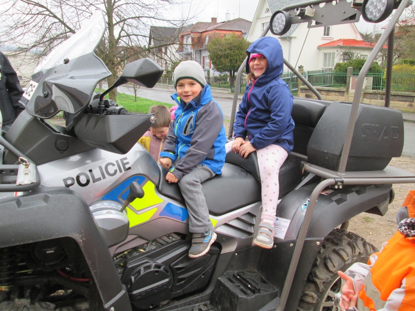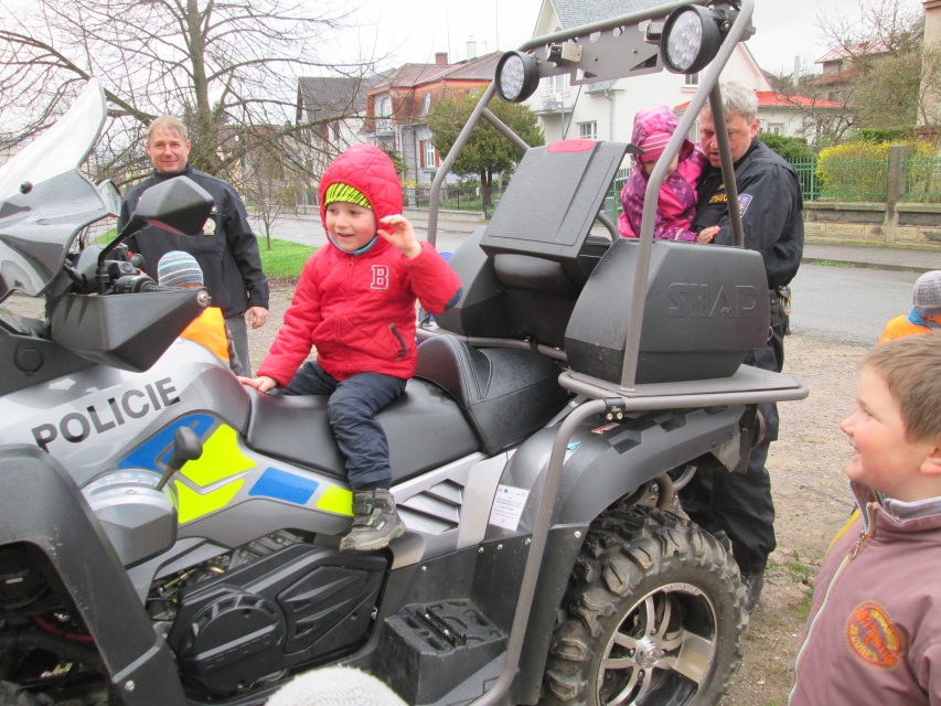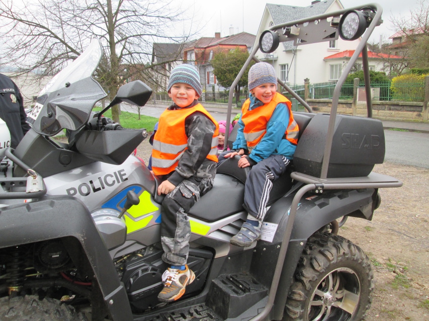 V dubnu jsme se učili poznávat význam dopravních předpisů a značek nejenom pro chodce. Byli jsme rádi, že náši školku navštívili dva policisté i mluvčí policie z Náchoda. U školky nám předvedli vybavení policejních aut i čtyřkolky, do kterých si děti mohly i sednout.